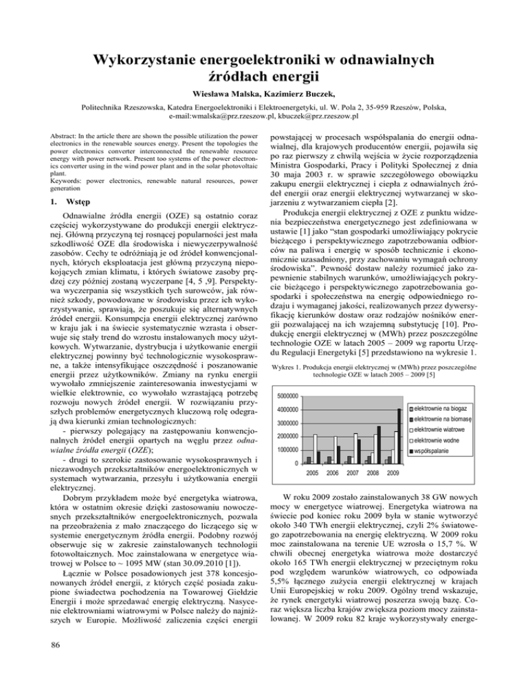 Wykorzystanie energoelektroniki w odnawialnych źródłach energii Wiesława Malska, Kazimierz Buczek, Politechnika Rzeszowska, Katedra Energoelektroniki i Elektroenergetyki, ul. W. Pola 2, 35-959 Rzeszów, Polska, e-mail:[email protected], [email protected] Abstract: In the article there are shown the possible utilization the power electronics in the renewable sources energy. Present the topologies the power electronics converter interconnected the renewable resource energy with power network. Present too systems of the power electronics converter using in the wind power plant and in the solar photovoltaic plant. Keywords: power electronics, renewable natural resources, power generation 1. Wstęp Odnawialne źródła energii (OZE) są ostatnio coraz częściej wykorzystywane do produkcji energii elektrycznej. Główną przyczyną tej rosnącej popularności jest mała szkodliwość OZE dla środowiska i niewyczerpywalność zasobów. Cechy te odróżniają je od źródeł konwencjonalnych, których eksploatacja jest główną przyczyną niepokojących zmian klimatu, i których światowe zasoby prędzej czy później zostaną wyczerpane [4, 5 ,9]. Perspektywa wyczerpania się wszystkich tych surowców, jak również szkody, powodowane w środowisku przez ich wykorzystywanie, sprawiają, że poszukuje się alternatywnych źródeł energii. Konsumpcja energii elektrycznej zarówno w kraju jak i na świecie systematycznie wzrasta i obserwuje się stały trend do wzrostu instalowanych mocy użytkowych. Wytwarzanie, dystrybucja i użytkowanie energii elektrycznej powinny być technologicznie wysokosprawne, a także intensyfikujące oszczędność i poszanowanie energii przez użytkowników. Zmiany na rynku energii wywołało zmniejszenie zainteresowania inwestycjami w wielkie elektrownie, co wywołało wzrastającą potrzebę rozwoju nowych źródeł energii. W rozwiązaniu przyszłych problemów energetycznych kluczową rolę odegrają dwa kierunki zmian technologicznych: - pierwszy polegający na zastępowaniu konwencjonalnych źródeł energii opartych na węglu przez odnawialne źródła energii (OZE); - drugi to szerokie zastosowanie wysokosprawnych i niezawodnych przekształtników energoelektronicznych w systemach wytwarzania, przesyłu i użytkowania energii elektrycznej. Dobrym przykładem może być energetyka wiatrowa, która w ostatnim okresie dzięki zastosowaniu nowoczesnych przekształtników energoelektronicznych, pozwala na przeobrażenia z mało znaczącego do liczącego się w systemie energetycznym źródła energii. Podobny rozwój obserwuje się w zakresie zainstalowanych technologii fotowoltaicznych. Moc zainstalowana w energetyce wiatrowej w Polsce to ~ 1095 MW (stan 30.09.2010 [1]). Łącznie w Polsce posadowionych jest 378 koncesjonowanych źródeł energii, z których część posiada zakupione świadectwa pochodzenia na Towarowej Giełdzie Energii i może sprzedawać energię elektryczną. Nasycenie elektrowniami wiatrowymi w Polsce należy do najniższych w Europie. Możliwość zaliczenia części energii 86 powstającej w procesach współspalania do energii odnawialnej, dla krajowych producentów energii, pojawiła się po raz pierwszy z chwilą wejścia w życie rozporządzenia Ministra Gospodarki, Pracy i Polityki Społecznej z dnia 30 maja 2003 r. w sprawie szczegółowego obowiązku zakupu energii elektrycznej i ciepła z odnawialnych źródeł energii oraz energii elektrycznej wytwarzanej w skojarzeniu z wytwarzaniem ciepła [2]. Produkcja energii elektrycznej z OZE z punktu widzenia bezpieczeństwa energetycznego jest zdefiniowana w ustawie [1] jako “stan gospodarki umożliwiający pokrycie bieżącego i perspektywicznego zapotrzebowania odbiorców na paliwa i energię w sposób technicznie i ekonomicznie uzasadniony, przy zachowaniu wymagań ochrony środowiska”. Pewność dostaw należy rozumieć jako zapewnienie stabilnych warunków, umożliwiających pokrycie bieżącego i perspektywicznego zapotrzebowania gospodarki i społeczeństwa na energię odpowiedniego rodzaju i wymaganej jakości, realizowanych przez dywersyfikację kierunków dostaw oraz rodzajów nośników energii pozwalającej na ich wzajemną substytucję [10]. Produkcję energii elektrycznej w (MWh) przez poszczególne technologie OZE w latach 2005 – 2009 wg raportu Urzędu Regulacji Energetyki [5] przedstawiono na wykresie 1. Wykres 1. Produkcja energii elektrycznej w (MWh) przez poszczególne technologie OZE w latach 2005 – 2009 [5] 5000000 elektrownie na biogaz 4000000 elektrownie na biomasę 3000000 elektrownie wiatrowe 2000000 elektrownie wodne 1000000 współspalanie 0 2005 2006 2007 2008 2009 W roku 2009 zostało zainstalowanych 38 GW nowych mocy w energetyce wiatrowej. Energetyka wiatrowa na świecie pod koniec roku 2009 była w stanie wytworzyć około 340 TWh energii elektrycznej, czyli 2% światowego zapotrzebowania na energię elektryczną. W 2009 roku moc zainstalowana na terenie UE wzrosła o 15,7 %. W chwili obecnej energetyka wiatrowa może dostarczyć około 165 TWh energii elektrycznej w przeciętnym roku pod względem warunków wiatrowych, co odpowiada 5,5% łącznego zużycia energii elektrycznej w krajach Unii Europejskiej w roku 2009. Ogólny trend wskazuje, że rynek energetyki wiatrowej poszerza swoją bazę. Coraz większa liczba krajów zwiększa poziom mocy zainstalowanej. W 2009 roku 82 kraje wykorzystywały energe- tykę wiatrową do przemysłowej produkcji energii, z czego 49 krajów zwiększyło poziom mocy zainstalowanej. W roku 2009 Europejskie Stowarzyszenie Energetyki Wiatrowej (ang. European Wind Energy Association EWEA) zwiększyło swój cel na rok 2020 ze 180 GW mocy zainstalowanej do 230 GW. Taka ilość mocy pozwoli na wytworzenie 600 TWh energii elektrycznej, co stanowi 14% do 18% oczekiwanego zapotrzebowania na energię elektryczną w Unii Europejskiej w roku 2020. OZE pracują najczęściej w systemach Generacji Rozproszonej (GR). Przy