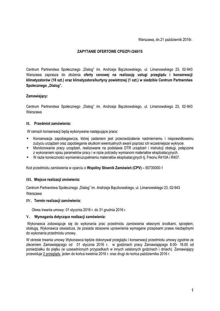 Warszawa, dn.21 październik 2015r. ZAPYTANIE OFERTOWE CPS/ZP/-/240/15 Centrum Partnerstwa Społecznego „Dialog” im. Andrzeja Bączkowskiego, ul. Limanowskiego 23, 02-943 Warszawa zaprasza do złożenia oferty cenowej na realizację usługi przeglądu i konserwacji klimatyzatorów (18 szt.) oraz klimatyzatora/kurtyny powietrznej (1 szt.) w siedzibie Centrum Partnerstwa Społecznego „Dialog”. Zamawiający: Centrum Partnerstwa Społecznego „Dialog” im. Andrzeja Bączkowskiego, ul. Limanowskiego 23, 02-943 Warszawa II. Przedmiot zamówienia: W ramach konserwacji będą wykonywane następujące prace: Konserwacja zapobiegawcza, której zadaniem jest przeciwdziałanie nadmiernemu i nieprawidłowemu zużyciu urządzeń oraz zapobieganie skutkom ewentualnych awarii poprzez ich wcześniejsze wykrycie. Monitorowanie pracy urządzeń, realizowane na podstawie DTR urządzeń i instrukcji obsługi, połączone z wykonaniem spisu parametrów pracy i w razie potrzeby wymianom materiałów eksploatacyjnych. W razie konieczności wymianie/uzupełnieniu materiałów eksploatacyjnych tj. Freonu R410A i R407. Kod przedmiotu zamówienia w oparciu o Wspólny Słownik Zamówień (CPV) – 50730000-1 III. Miejsce realizacji zmówienia: Centrum Partnerstwa Społecznego „Dialog” im. Andrzeja Bączkowskiego, ul. Limanowskiego 23, 02-943 Warszawa IV. Termin realizacji zamówienia: Okres trwania umowy: 01 stycznia 2016 r. do 31 grudnia 2016 r. V. Wymagania dotyczące realizacji zamówienia: Wykonawca zobowiązuje się do wykonania prac przedmiotu zamówienia własnymi środkami, sprzętem, obsługą. Wykonawca oświadcza, że posiada stosowne uprawnienia wymagane przepisami prawa niezbędnymi do wykonania przedmiotu umowy. W okresie trwania umowy Wykonawca będzie dokonywał przeglądu i konserwacji przedmiotu umowy zgodnie ze zleceniem Zamawiającego od 01 stycznia 2016 r. w godzinach pracy Zamawiającego 8.00- 16.00 od poniedziałku do piątku (w uzasadnionych przypadkach w innych ustalonych godzinach i dniach). Zamawiający przewiduje 2 przeglądy, jeden do końca kwietnia 2016 r. oraz drugi do końca października 2016 r. 1 VI. Kryteria oceny oferty: (w tym informacja o wagach punktowych lub procentowych przypisanych do poszczególnych kryteriów oceny oferty, sposobie przyznawania punktacji za spełnienie danego kryterium) Przy wyborze oferty Zamawiający będzie się kierował następującymi kryteriami i ich znaczeniem: Cena [Co] - 100 % Najniższa cena (znaczenie w ocenie 100 %) Sposób dokonywania oceny wg. wzoru: Co = Cn : Cb x 100 [pkt] gdzie: Cn - cena najniższa, Cb – cena badanej oferty VII. Termin oraz sposób składania formularzy ofertowych. Termin składania formularzy ofertowych do 06 listopad 2015r. do godz. 15:00 Sposób składania wniosków, osobiście na recepcji Zamawiającego w godz. pracy pon.- piątek 8:00-16:00, e-mailem [email protected] bądź za pośrednictwem faksu na numer 22 380-50-52 1. Osobą uprawnioną do kontaktu z oferentami jest Marcin Radomski tel. 22 380-50-60, e-mail [email protected] VIII.Tryb udzielania zamówienia: Postępowanie o udzielenie zamówienia prowadzone jest w oparciu o „Regulamin udzielania zamówień na dostawy i usługi, których wartość nie przekracza wyrażonej w złotych równowartości 30 000 euro netto” IX. Uwagi końcowe: 1. Zamawiający zastrzega sobie prawo odstąpienia bądź unieważnienia zapytania ofertowego bez podania przyczyny w przypadku zaistnienia okoliczności nieznanych Zamawiającemu w dniu sporządzania niniejszego Zapytania ofertowego. 2. Oferent może wprowadzić zmiany w złożonej ofercie lub ją wycofać, pod warunkiem, że uczyni to przed upływem terminu składania ofert. Zarówno zmiana jak i wycofanie oferty wymagają zachowania formy pisemnej. 3. Zamawiający wykluczy z postępowania oferentów, którzy nie spełniają warunków udziału w postępowaniu. 4. Ofertę oferenta wykluczonego z postępowania uznaje się za odrzuconą. 5. Oferty złożone po terminie lub nieodpowiadające wymogom formalnym nie zostaną rozpatrzone. 6. Zapytanie ofertowe nie stanowi oferty w rozumieniu art. 66 §1 k.c. 7. Oferenci uczestniczą w postępowaniu ofertowym na własne ryzyko i koszt, nie przysługują im żadne roszczenia z tytułu odstąpienia przez Zamawiającego od postępowania ofertowego. 8. Ocena zgodności ofert z wymaganiami Zamawiającego przeprowadzona zostanie na podstawie analizy dokumentów i materiałów, jakie oferent zawarł w swej ofercie. Ocenie podlegać będzie zarówno formalna jak i merytoryczna zgodność oferty z wymaganiami. 9.Zamawiający zastrzega sobie prawo sprawdzania w toku oceny ofert wiarygodności przedstawionych przez oferentów dokumentów, wykazów, danych i informacji. Zatwierdzam ……................................................................. Akceptacja Dyrektora/ /osoby upoważnionej 2