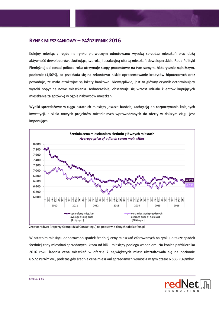 RYNEK MIESZKANIOWY – PAŹDZIERNIK 2016 Kolejny miesiąc z rzędu na rynku pierwotnym odnotowano wysoką sprzedaż mieszkań oraz dużą aktywność deweloperów, skutkującą szeroką i atrakcyjną ofertą mieszkań deweloperskich. Rada Polityki Pieniężnej od ponad półtora roku utrzymuje stopy procentowe na tym samym, historycznie najniższym, poziomie (1,50%), co przekłada się na rekordowo niskie oprocentowanie kredytów hipotecznych oraz powoduje, że mało atrakcyjne są lokaty bankowe. Niewątpliwie, jest to główny czynnik determinujący wysoki popyt na nowe mieszkania. Jednocześnie, obserwuje się wzrost udziału klientów kupujących mieszkania za gotówkę w ogóle nabywców mieszkań. Wyniki sprzedażowe w ciągu ostatnich miesięcy jeszcze bardziej zachęcają do rozpoczynania kolejnych inwestycji, a skala nowych projektów mieszkalnych wprowadzanych do oferty w dalszym ciągu jest imponująca. Średnia cena mieszkania w siedmiu głównych miastach Average price of a flat in seven main cities 8 000 7 800 7 600 7 400 7 200 7 000 6 800 6 600 6 572 6 400 6 533 6 200 I III V VII IX XI I III V VII IX XI I III V VII IX XI I III V VII IX XI I III V VII IX XI I III V VII IX XI I III V VII IX 6 000 2010 2011 2012 cena oferty mieszkań average asking price [PLN/sqm.] 2013 2014 2015 2016 cena mieszkań sprzedanych average price of flats sold [PLN/sqm.] Źródło: redNet Property Group (dział Consultingu) na podstawie danych tabelaofert.pl W ostatnim miesiącu odnotowano spadek średniej ceny mieszkań oferowanych na rynku, a także spadek średniej ceny mieszkań sprzedanych, która od kilku miesięcy podlega wahaniom. Na koniec października 2016 roku średnia cena mieszkań w ofercie 7 największych miast ukształtowała się na poziomie 6 572 PLN/mkw., podczas gdy średnia cena mieszkań sprzedanych wyniosła w tym czasie 6 533 PLN/mkw. STRONA 1 z 5 Sytuacja cenowa w poszczególnych miastach w ostatnich dwóch miesiącach wyglądała następująco: Średnia cena mieszkań oferowanych Średnia cena mieszkań sprzedanych Cena mieszkań sprzedanych/ cena mieszkań oferowanych Miasto wrzesień 2016 październik 2016 wrzesień 2016 październik 2016 wrzesień 2016 październik 2016 Katowice 4 920 4 924 4 808 4 852 -2,3% -1,5% Kraków 6 392 6 474 6 385 6 342 -0,1% -2,0% Łódź 4 768 4 780 4 778 4 788 0,2% 0,2% Poznań 6 401 6 384 6 422 6 471 0,3% 1,4% Gdańsk 6 530 6 462 5 757 5 781 -11,8% -10,5% Warszawa 7 709 7 695 7 633 7 627 -1,0% -0,9% Wrocław 6 174 6 064 6 163 6 154 -0,2% 1,5% aglomeracja warszawska 7 478 7 433 7 435 7 363 -0,6% -0,9% aglomeracja trójmiejska 6 218 6 118 5 636 5 698 -9,4% -6,9% aglomeracja śląska 4 877 4 874 4 846 4 876 -0,6% 0,0% średnia dla 7 aglomeracji 6 643 6 572 6 622 6 533 -0,3% -0,6% Źródło: redNet Property Group (dział Consultingu) na podstawie danych tabelaofert.pl W minionym miesiącu spośród wszystkich analizowanych miast, jedynie we Wrocławiu, Poznaniu i Łodzi średnia cena mieszkań sprzedanych była wyższa niż średnia cena mieszkań pozostających w ofercie. Różnice te są jednak niewielkie ( od 0,2% do 1,5%). We wszystkich pozostałych miastach średnia cena oferty przewyższała średnią cenę sprzedaży. Największe dysproporcje odnotowano w Gdańsku (-10,5%), a najmniejsze w Warszawie (-0,9%). Różnica dla 7 aglomeracji wyniosła -0,6%. Biorąc pod uwagę aglomeracje, większe różnice odnotowano w aglomeracji trójmiejskiej, tj. -6,9%, mniejsze natomiast w aglomeracji warszawskiej (- 0,9%) i trójmiejskiej (0,0%). STRONA 2 z 5 W większości największych miast w Polsce, średnie ceny mieszkań znajdujących się w ofercie deweloperów na koniec października 2016 roku zmalały względem września 2016 roku. W trzech miastach zaobserwowano niewielki wzrost cen. Największy wzrost średniej ceny oferty odnotowano w Krakowie (1,3%), a następnie w Łodzi (0,3%) i Katowicach (0,1%). Największy spadek średniej ceny oferty odnotowano we Wrocławiu (-1,8%) i Gdańsku (-1,0%). Ogółem dla 7 miast zaobserwowano spadek średniej ceny oferty na poziomie -1,1%. W przypadku średniej ceny mieszkań sprzedanych odnotowuje się odwrotną tendencję, w większości analizowanych miast średnie ceny wzrosły. W przypadku każdego z miast, wzrost ten był niewielki i nie przekraczał 1,0%. Największy wzrost odnotowano w Katowicach (0,9%) oraz w Poznaniu (0,8%). Największy spadek średniej ceny mieszkań sprzedanych odnotowano w Krakowie (-0,7%). Dla wszystkich aglomeracji ogółem odnotowano spadek na poziomie -1,3%. Na poniższym wykresie zaprezentowano poziom średnich cen mieszkań sprzedanych w siedmiu głównych miastach Polski. Warszawa w dalszym ciągu wyróżnia się na tle pozostałych miast, bowiem tylko w stolicy średnia cena mieszkań sprzedanych była powyżej średniej ceny mieszkań sprzedanych obliczonej dla 7 głównych aglomeracji. W październiku 2016 roku średnia cena mieszkań sprzedanych w stolicy nieznacznie spadła w porównaniu do cen zaobserwowanych w III kwartale 2016 roku i wyniosła 7 627 PLN/mkw. Średnia cena mieszkań sprzedanych Average price of flats sold 8 000 7 627 7 500 7 000 6 533 6 500 6 471 6 000 6 154 6 342 5 781 5 500 5 000 4 852 4 788 4 500 4 000 I III V VII IX XI I III 2012 Katowice V VII IX XI 2013 Kraków Łódź Poznań I III V VII 2014 Gdańsk IX XI I Warszawa III V VII IX 2015 Wrocław XI I III V VII IX 2016 średnia dla 7 aglomeracji Źródło: redNet Property Group (dział Consultingu) na podstawie danych tabelaofert.pl Drugim miastem w rankingu jest Poznań, w którym średnia cena mieszkań sprzedanych w październiku 2016 roku ukształtowała się na poziomie 6 471 PLN/mkw. W Krakowie średnia wyniosła 6 342 PLN/mkw., STRONA 3 z 5 we Wrocławiu 6 154 PLN/mkw., natomiast w Gdańsku 5 781 PLN/mkw. Średnio najtaniej w przeciągu ostatnich miesięcy można było nabyć mieszkania w Łodzi (4 788 PLN/mkw.) i w Katowicach (4 852 PLN/mkw.). Średnia cena mieszkań sprzedanych wyn
