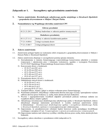Załącznik nr 1. Szczegółowy opis przedmiotu zamówienia 1. Nazwa zamówienia: Rewitalizacja zabytkowego parku miejskiego w Strzelcach Opolskich – gospodarka drzewostanem w Małym i DuŜym Parku. 2. Nomenklatura wg Wspólnego słownika zamówień CPV Główny przedmiot 45.21.21.20-3 Roboty budowlane w zakresie parków tematycznych Dodatkowe przedmioty 45.11.27.11-2 Roboty w zakresie kształtowania parków 77.21.14.00-6 Usługi wycinania drzew 77.21.15.00-7 Usługi pielęgnacji drzew 3. Zakres zamówienia 3.1. Zamówienie polegać będzie na wykonaniu robót związanych z gospodarką drzewostanem w Małym i DuŜym Parku w Strzelcach Opolskich 3.2. Zakres zamówienia obejmuje w szczególności poniŜej opisane elementy. 1) Zawiadomienie w imieniu Zamawiającego wojewódzkiego konserwatora zabytków o terminie rozpoczęcia i zakończenia prac i wskazania wykonawcy, zgodnie z wymogiem Pozwolenia Nr 671/N/07 Opolskiego Wojewódzkiego Konserwatora Zabytków. 2) Karczowanie drzew o średnicach: • Ø 10-15 cm (281 szt.), • Ø 16-20 cm (203 szt.), • Ø 21-30 cm (272 szt.), • Ø 31-40 cm (125 szt.), • Ø 41-65 cm (127 szt.), 3) Przesadzenie drzew (10 szt.). 4) Odmłodzenie starych drzew o średnicach: • Ø 16-20 cm (1 szt.), • Ø 21-30 cm (4 szt.), • Ø 31-40 cm (5 szt.), • powyŜej Ø 41 (27 szt.). 5) Transport dłuŜyc, karpin i gałęzi w miejsce wskazane przez Zamawiającego, 6) Wykonanie pomiarów, klasyfikacji i znakowania drewna oraz jego wycenę i sporządzenie wykazu odbioru drewna (przez brakarza, tj. osobę, która ukończyła kurs brakarski). 7) Wywóz i zagospodarowanie wszelkich odpadów powstałych podczas realizacji zadania (za wyjątkiem dłuŜyc, karpin i gałęzi). 8) Aktualizacja inwentaryzacji dendrologicznej zabytkowego parku w Strzelcach Opolskich. Zakres aktualizacji obejmuje naniesienie powstałych w wyniku realizacji zamówienia zmian w dokumentacji – Inwentaryzacji dendrologicznej ogólnej i szczegółowej Zabytkowego Parku w Strzelcach Opolskich, zarówno w wersji papierowej jak i elektronicznej. 9) Zapewnienie, Ŝe przedmiotowymi robotami będzie kierować osoba posiadająca kwalifikacje wynikające z przepisu § 8 ust. 3 rozporządzenie w sprawie prowadzenia prac restauracyjnych. 10) Zapewnienie nadzoru nad właściwą wyróbką i obróbką drewna przez osobę, która ukończyła kurs brakarski. 3.3. Szczegółowy zakres określono w przedmiarze robót (załącznik nr 2). SIWZ - Załączniki (ZP-3410-15/08) 4. Podział zamówienia na etapy realizacyjne 4.1 Przedmiotowa robota budowlana będzie realizowana zgodnie z harmonogramem realizacyjnym, przy czym wyróŜnia się następujące dwie części zadania w związku z płatnością częściową, opisane poniŜej. 1) Część 1 - gospodarka drzewostanem w Małym Parku Lp. 1 2 3 4 5 Zakres (ogólnie) Karczowanie drzew 200 szt. Przesadzenie drzew 4 szt. Odmładzanie starych drzew 19 szt. Transport dłuŜyc, karpin i gałęzi w miejsce wskazane przez Zamawiającego Wykonanie pomiarów, klasyfikacji i znakowania drewna oraz z jego wycenę i sporządzenie wykazu odbioru drewna 2) Część 2 – gospodarka drzewostanem w DuŜym Parku Lp. Zakres (ogólnie) 1 2 3 4 5 Karczowanie drzew 808 szt. Przesadzenie drzew 6 szt. Odmładzanie starych drzew 18 szt. Transport dłuŜyc, karpin i gałęzi w miejsce wskazane przez Zamawiającego Wykonanie pomiarów, klasyfikacji i znakowania drewna oraz z jego wycenę i sporządzenie wykazu odbioru drewna Aktualizacja inwentaryzacji dendrologicznej (uwzględniająca cały wykonany zakres zadania – Małego i DuŜego Parku). 6 5. Dokumentacja, która zostanie przekazana wykonawcy na czas realizacji zamówienia 1) Decyzja Nr 492/07 Starosty Powiatowego w Strzelcach Opolskich (pozwolenie na budowę) wraz z projektem budowlanym, 2) Pozwolenie Nr 671/N/07 Opolskiego Wojewódzkiego Konserwatora Zabytków, 3) Projekt Wykonawczy Rewitalizacji Zabytkowego Parku w Strzelcach Opolskich – gospodarka drzewostanem 4) Specyfikacja techniczna wykonania i odbioru robót 5) Rewitalizacja Zabytkowego Parku w Strzelcach Opolskich – inwentaryzacja dendrologiczna szczegółowa, inwentaryzacja dendrologiczna ogólna (opis i rysunki) oraz wersja elektroniczna (opis w formacie *,doc; rysunki *.dwg). SIWZ - Załączniki (ZP-3410-15/08)