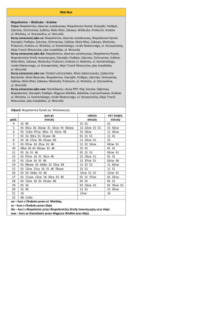 Mat Bus Niepołomice – Wieliczka – Kraków Trasa: Niepołomice, dworzec autobusowy, Niepołomice Rynek, Staniątki, Podłęże, Zakrzów, Ochmanów, Sułków, Mała Wieś, Zabawa, Wieliczka, Prokocim, Kraków ul. Wielicka, ul. Starowiślna, ul. Worcella Kursy oznaczone jako ca: Niepołomice, dworzec autobusowy, Niepołomice Rynek, Staniątki, Podłęże, Zakrzów, Ochmanów, Sułków, Mała Wieś, Zabawa, Wieliczka, Prokocim, Kraków ul. Wielicka, ul. Kamieńskiego, rondo Matecznego, ul. Konopnickiej, Aleje Trzech Wieszczów, plac Inwalidów, ul. Worcella Kursy oznaczone jako dia: Niepołomice, dworzec autobusowy, Niepołomice Rynek, Niepołomicka Strefa Inwestycyjna, Staniątki, Podłęże, Zakrzów, Ochmanów, Sułków, Mała Wieś, Zabawa, Wieliczka, Prokocim, Kraków ul. Wielicka, ul. Kamieńskiego, rondo Matecznego, ul. Konopnickiej, Aleje Trzech Wieszczów, plac Inwalidów, ul. Worcella Kursy oznaczone jako cw: Chobot Leśniczówka, Wola Zabierzowska, Zabierzów Bocheński, Wola Batorska, Niepołomice, Staniątki, Podłęże, Zakrzów, Ochmanów, Sułków, Mała Wieś, Zabawa, Wieliczka, Prokocim, ul. Wielicka, ul. Starowiślna, ul. Worcella Kursy oznaczone jako saw: Stanisławice, stacja PKP, Kłaj, Szarów, Dąbrowa, Niepołomice, Staniątki, Podłęże, Węgrzce Wielkie, Kokotów, Czarnochowice, Kraków ul. Wielicka, ul. Kamieńskiego, rondo Matecznego, ul. Konopnickiej, Aleje Trzech Wieszczów, plac Inwalidów, ul. Worcella Odjazd: Niepołomice Rynek (ul. Mickiewicza) pon-pt sobota nd i święta godz. minuty minuty minuty 4 31 46 31 51 51 5 01 05ca 16 16saw 31 32cw 41 56saw 11 22cw 31 51 21 42cw 6 01 11dia 07cw 30ca 31 42cw 46 31 42cw 11 42cw 7 01 16 30ca 31 41saw 46 01 21 51 11 41 8 01 16 27cw 36 41saw 56 11 22cw 41 21 9 01 07cw 16 25ca 31 46 11 31 52cw 02cw 31 10 00ca 01 16 26saw 31 46 21 41 01 31 11 01 16 31 46 01 21 51 02cw 31 12 01 07cw 16 31 35ca 46 21 32cw 51 01 31 13 01 12cw 16 31 46 21 37cw 51 02cw 36 14 01 06saw 16 16dia 31 35ca 46 11 31 51 11 42cw 15 01 12cw 15ca 16 31 46 56saw 21 51 11 51 16 01 16 16dia 31 46 12cw 21 41 12cw 31 17 01 11saw 12cw 16 20ca 31 46 01 21 37cw 01 32cw 18 01 12cw 16 31 41saw 46 01 31 01 21 19 01 16 01 22cw 41 01 32cw 51 20 31 46 11 51 21 42cw 21 16 12cw 16 22 06 11dia cw – kurs z Chobotu przez ul. Wielicką ca – kurs z Chobotu przez Aleje dia – kurs z Niepołomic przez Niepołomicką Strefę Inwestycyjną oraz Aleje saw – kurs ze Stanisławic przez Węgrzce Wielkie oraz Aleje