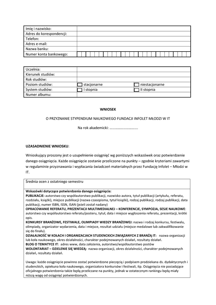Imię i nazwisko: Adres do korespondencji: Telefon: Adres e-mail: Nazwa banku: Numer konta bankowego: Uczelnia: Kierunek studiów: Rok studiów: Poziom studiów: System studiów: Numer albumu: stacjonarne I stopnia niestacjonarne II stopnia WNIOSEK O PRZYZNANIE STYPENDIUM NAUKOWEGO FUNDACJI INFOLET MŁODZI W IT Na rok akademicki: …………………………. UZASADNIENIE WNIOSKU: Wnioskujący proszony jest o uzupełnienie osiągnięć wg poniższych wskazówek oraz potwierdzenie danego osiągnięcia. Każde osiągnięcie zostanie przeliczone na punkty – zgodnie kryteriami zawartymi w regulaminie przyznawania i wypłacania świadczeń materialnych przez Fundację Infolet – Młodzi w IT. Średnia ocen z ostatniego semestru Wskazówki dotyczące potwierdzenia danego osiągnięcia: PUBLIKACJE: autorstwo czy współautorstwo publikacji, nazwisko autora, tytuł publikacji (artykułu, referatu, rozdziału, książki), miejsce publikacji (nazwa czasopisma, tytuł książki), rodzaj publikacji, rodzaj publikacji, data publikacji, numer ISBN, ISSN, ISAN (jeżeli został nadany) OPRACOWANIE REFERATU, PREZENTACJI MULTIMEDIALNEJ – KONFERENCJE, SYMPOZJA, SESJE NAUKOWE: autorstwo czy współautorstwo referatu/posteru, tytuł, data i miejsce wygłoszenia referatu, prezentacji, krótki opis. KONKURSY BRANŻOWE, FESTIWALE, OLIMPIADY WIEDZY BRANŻOWEJ: nazwa i rodzaj konkursu, festiwalu, olimpiady, organizator wydarzenia, data i miejsce, rezultat udziału (miejsce medalowe lub zakwalifikowanie się do finału). DZIAŁALNOŚĆ W KOŁACH I ORGANIZACJACH STUDENCKICH ZWIĄZANYCH Z BRANŻĄ IT: nazwa organizacji lub koła naukowego, okres działalności, charakter podejmowanych działań, rezultaty działań. BLOG O TEMATYCE IT: adres www, data założenia, autorstwo/współautorstwo postów WOLONTARIAT – DZIELENIE SIĘ WIEDZĄ: nazwa organizacji, okres działalności, charakter podejmowanych działań, rezultaty działań. Uwaga: każde osiągnięcie powinno zostać potwierdzone pieczęcią i podpisem prodziekana ds. dydaktycznych i studenckich, opiekuna koła naukowego, organizatora konkursów i festiwali, itp. Osiągnięcia nie posiadające oficjalnego potwierdzenia także będą przeliczane na punkty, jednak w ostatecznym rankingu będą miały niższą wagę od osiągnięć potwierdzonych. Opis osiągnięcia: Potwierdzenie osiągnięcia: (należy podać wszystkie wymagane informacje) DODATKOWE INFORMACJE: Czy na dzień składania wniosku student: - pobiera stypendium naukowe od innych podmiotów - jest zawieszony w prawach studenta - jest skreślony listy studentów - powtarza rok - przebywa na urlopie dziekańskim - ma zaległe egzaminy z poprzedniego roku - toczy się wobec niego postępowanie dyscyplinarne lub karne - był karany TAK NIE Świadomy odpowiedzialności karnej za podanie nieprawdziwych danych i obowiązku zwrotu pobranej pomocy materialnej oświadczam, że podane wyżej informacje są kompletne i zgodne ze stanem faktycznym. Wyrażam zgodę na przetwarzanie moich danych osobowych zawartych we wniosku zgodnie z ustawą z dnia 29.08.1997r. o ochronie danych osobowych (Dz.U.2002.101.926 j.t. ze zmianami) w celu i zakresie niezbędnym do rozpatrzenia i realizacji niniejszego wniosku. …………………………………………. (data i podpis studenta)