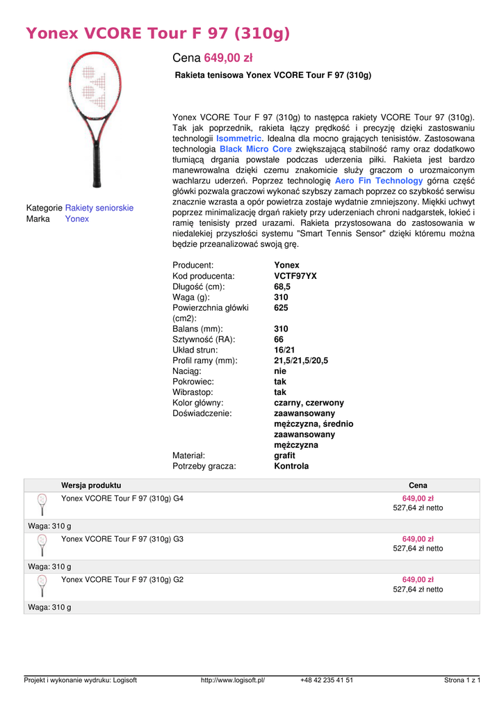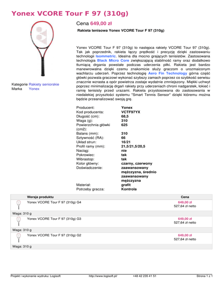 Yonex VCORE Tour F 97 (310g) Cena 649,00 zł Rakieta tenisowa Yonex VCORE Tour F 97 (310g) Kategorie Rakiety seniorskie Marka Yonex Yonex VCORE Tour F 97 (310g) to następca rakiety VCORE Tour 97 (310g). Tak jak poprzednik, rakieta łączy prędkość i precyzję dzięki zastoswaniu technologii Isommetric. Idealna dla mocno grających tenisistów. Zastosowana technologia Black Micro Core zwiększającą stabilność ramy oraz dodatkowo tłumiącą drgania powstałe podczas uderzenia piłki. Rakieta jest bardzo manewrowalna dzięki czemu znakomicie służy graczom o urozmaiconym wachlarzu uderzeń. Poprzez technologię Aero Fin Technology górna część główki pozwala graczowi wykonać szybszy zamach poprzez co szybkość serwisu znacznie wzrasta a opór powietrza zostaje wydatnie zmniejszony. Miękki uchwyt poprzez minimalizację drgań rakiety przy uderzeniach chroni nadgarstek, łokieć i ramię tenisisty przed urazami. Rakieta przystosowana do zastosowania w niedalekiej przyszłości systemu "Smart Tennis Sensor" dzięki któremu można będzie przeanalizować swoją grę. Producent: Kod producenta: Długość (cm): Waga (g): Powierzchnia główki (cm2): Balans (mm): Sztywność (RA): Układ strun: Profil ramy (mm): Naciąg: Pokrowiec: Wibrastop: Kolor główny: Doświadczenie: Materiał: Potrzeby gracza: Yonex VCTF97YX 68,5 310 625 310 66 16/21 21,5/21,5/20,5 nie tak tak czarny, czerwony zaawansowany mężczyzna, średnio zaawansowany mężczyzna grafit Kontrola Wersja produktu Cena Yonex VCORE Tour F 97 (310g) G4 649,00 zł 527,64 zł netto Waga: 310 g Yonex VCORE Tour F 97 (310g) G3 649,00 zł 527,64 zł netto Waga: 310 g Yonex VCORE Tour F 97 (310g) G2 649,00 zł 527,64 zł netto Waga: 310 g Projekt i wykonanie wydruku: Logisoft Powered by TCPDF (www.tcpdf.org) http://www.logisoft.pl/ +48 42 235 41 51 Strona 1 z 1