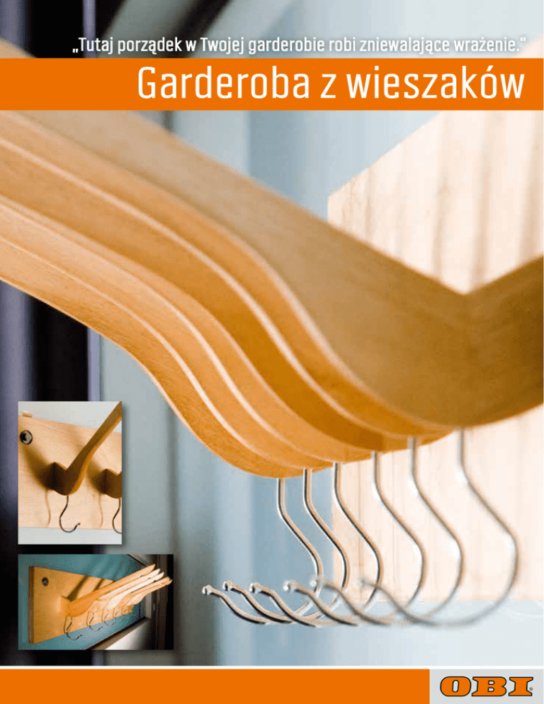 „Tutaj porządek w Twojej garderobie robi zniewalające wrażenie.“ Garderoba z wieszaków OBI – Zrób to sam | Stopień trudności: Początkujący Garderoba z wieszaków „Powieś kurtkę na wieszaku“ - aby móc spełnić tą prośbę nie jest konieczny zbyt wielki wysiłek. Przekonaj się, jak łatwo zaprowadzić porządek w garderobie. Lista zakupów Poz. Ilość 1 1 6 2 6 3 Dodatkowe akcesoria Lista narzędzi: Czas budowy: Nazwa Wymiary Materiał płyta 800 x 195 mm Multiplex 18 mm 4 x 40 mm z łbem stożkowym drewnianych wieszaków na ubrania wkretów do drewna lakier bezbarwny wiertarka, piła ręczna, wyrzynarka ok. 2 godzin 2 1 Wskazówka: Gotową garderobę możesz pomalować na kolorowo lub ozdobić techniką decoupage. Prawo do pomyłek, błędów w druku i zmiaan technicznych zastrzeżone. W przypadku niewłaściwego stosowania nie udziela się gwarancji. ! Garderoba z wieszaków Instrukcja budowy Krok po kroku 1: Wieszak na ubrania skróć po jednej stronie przy pomocy piły ręcznej. Przeszlifuj i oczyść dokładnie miejsca po piłowaniu. Krok po kroku 2: Płytę pod wieszaki przytnij przy pomocy wyrzynarki i wygładź odpowiednio. Krok po kroku 3: Wszystkie otwory wywierć zgodnie z instrukcją w płycie. Otwory przeznaczone na wieszaki do ubrania pogłęb z tyłu o 5 mm. Krok po kroku 4: Na tej stronie wieszaków, gdzie wcześniej wykonane zostało cięcie wywierć otwory o średnicy 2 mm. W taki sposób będzie można później lżej przymocować śrubami wieszaki. Garderoba z wieszaków Instrukcja budowy Krok po kroku 5: Aby zakonserwować powierzchnię nałóż za pomocą wałka piankowego lakier bezbarwny na płytę drewnianą (jeśli garderoba zostanie później pomalowana innym kolorem, opuść daną część). Krok po kroku 6: Wieszaki przymocuj za pomocą wkrętów do drewna. Wcześniej nałóż jeszcze małą ilość kleju na uciętą powierzchnię, aby zabezpieczyć wieszaki przed ewentualnym ich przekręcaniem. Krok po kroku 7: Włóż kołki ścienne w obie górne rogi płyty tylnej i przymocuj do ściany. Garderoba z wieszaków Garderoba z wieszaków Garderoba z wieszaków 35 100 120 120 120 800 120 120 100 35 90 195 18 Skala 1:4 Maßstab 1:4 30 Garderoba z wieszaków