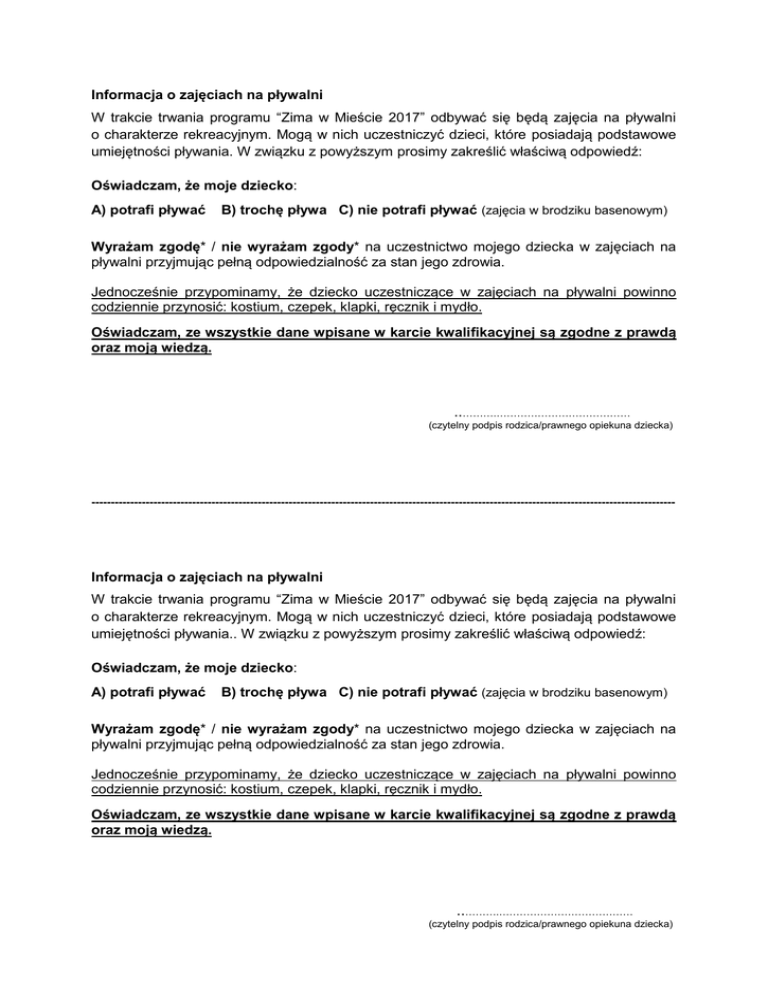 Informacja o zajęciach na pływalni W trakcie trwania programu “Zima w Mieście 2017” odbywać się będą zajęcia na pływalni o charakterze rekreacyjnym. Mogą w nich uczestniczyć dzieci, które posiadają podstawowe umiejętności pływania. W związku z powyższym prosimy zakreślić właściwą odpowiedź: Oświadczam, że moje dziecko: A) potrafi pływać B) trochę pływa C) nie potrafi pływać (zajęcia w brodziku basenowym) Wyrażam zgodę* / nie wyrażam zgody* na uczestnictwo mojego dziecka w zajęciach na pływalni przyjmując pełną odpowiedzialność za stan jego zdrowia. Jednocześnie przypominamy, że dziecko uczestniczące w zajęciach na pływalni powinno codziennie przynosić: kostium, czepek, klapki, ręcznik i mydło. Oświadczam, ze wszystkie dane wpisane w karcie kwalifikacyjnej są zgodne z prawdą oraz moją wiedzą. ..……….………………………………… (czytelny podpis rodzica/prawnego opiekuna dziecka) ------------------------------------------------------------------------------------------------------------------------------------------------------- Informacja o zajęciach na pływalni W trakcie trwania programu “Zima w Mieście 2017” odbywać się będą zajęcia na pływalni o charakterze rekreacyjnym. Mogą w nich uczestniczyć dzieci, które posiadają podstawowe umiejętności pływania.. W związku z powyższym prosimy zakreślić właściwą odpowiedź: Oświadczam, że moje dziecko: A) potrafi pływać B) trochę pływa C) nie potrafi pływać (zajęcia w brodziku basenowym) Wyrażam zgodę* / nie wyrażam zgody* na uczestnictwo mojego dziecka w zajęciach na pływalni przyjmując pełną odpowiedzialność za stan jego zdrowia. Jednocześnie przypominamy, że dziecko uczestniczące w zajęciach na pływalni powinno codziennie przynosić: kostium, czepek, klapki, ręcznik i mydło. Oświadczam, ze wszystkie dane wpisane w karcie kwalifikacyjnej są zgodne z prawdą oraz moją wiedzą. ..……….………………………………… (czytelny podpis rodzica/prawnego opiekuna dziecka)