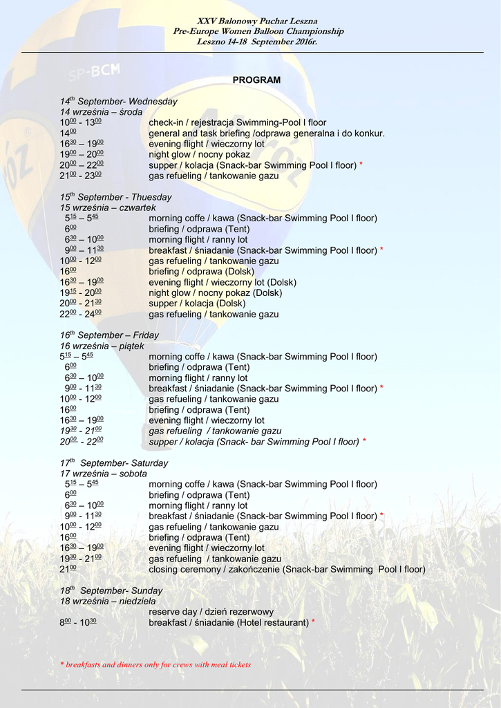 XXV Balonowy Puchar Leszna Pre-Europe Women Balloon Championship Leszno 14-18 September 2016r. PROGRAM 14th September- Wednesday 14 września – środa 1000 - 1300 check-in / rejestracja Swimming-Pool I floor 1400 general and task briefing /odprawa generalna i do konkur. 1630 – 1900 evening flight / wieczorny lot 1900 – 2000 night glow / nocny pokaz 00 00 20 – 22 supper / kolacja (Snack-bar Swimming Pool I floor) * 2100 - 2300 gas refueling / tankowanie gazu 15th September - Thuesday 15 września – czwartek 515 – 545 morning coffe / kawa (Snack-bar Swimming Pool I floor) 00 6 briefing / odprawa (Tent) 630 – 1000 morning flight / ranny lot 900 – 1130 breakfast / śniadanie (Snack-bar Swimming Pool I floor) * 1000 - 1200 gas refueling / tankowanie gazu 1600 briefing / odprawa (Dolsk) 1630 – 1900 evening flight / wieczorny lot (Dolsk) 15 00 19 - 20 night glow / nocny pokaz (Dolsk) 2000 - 2130 supper / kolacja (Dolsk) 2200 - 2400 gas refueling / tankowanie gazu 16th September – Friday 16 września – piątek 515 – 545 morning coffe / kawa (Snack-bar Swimming Pool I floor) 00 6 briefing / odprawa (Tent) 630 – 1000 morning flight / ranny lot 900 - 1130 breakfast / śniadanie (Snack-bar Swimming Pool I floor) * 1000 - 1200 gas refueling / tankowanie gazu 1600 briefing / odprawa (Tent) 1630 – 1900 evening flight / wieczorny lot 30 00 19 - 21 gas refueling / tankowanie gazu 2000 - 2200 supper / kolacja (Snack- bar Swimming Pool I floor) * 17th September- Saturday 17 września – sobota 515 – 545 morning coffe / kawa (Snack-bar Swimming Pool I floor) 00 6 briefing / odprawa (Tent) 630 – 1000 morning flight / ranny lot 900 - 1130 breakfast / śniadanie (Snack-bar Swimming Pool I floor) * 1000 - 1200 gas refueling / tankowanie gazu 1600 briefing / odprawa (Tent) 1630 – 1900 evening flight / wieczorny lot 30 00 19 - 21 gas refueling / tankowanie gazu 2100 closing ceremony / zakończenie (Snack-bar Swimming Pool I floor) 18th September- Sunday 18 września – niedziela reserve day / dzień rezerwowy 00 30 8 - 10 breakfast / śniadanie (Hotel restaurant) * * breakfasts and dinners only for crews with meal tickets