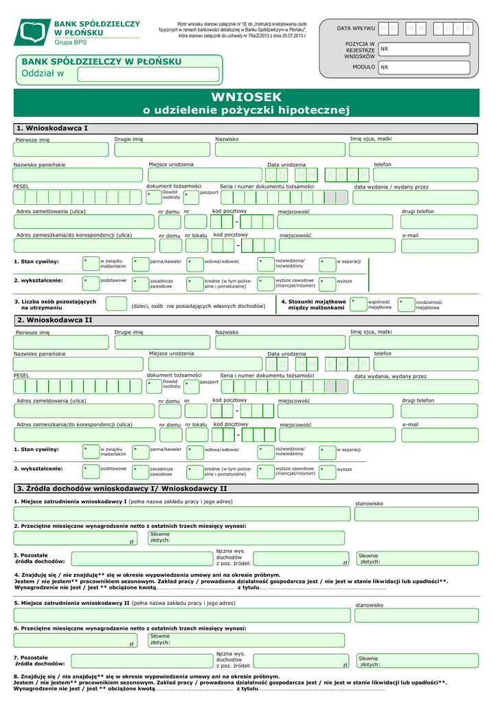 Wzór wniosku stanowi załącznik nr 1E do „Instrukcji kredytowania osób fizycznych w ramach bankowości detalicznej w Banku Spółdzielczym w Płońsku", która stanowi załącznik do uchwały nr 79a/Z/2013 z dnia 25.07.2013 r. DATA WPŁYWU BANK SPÓŁDZIELCZY W PŁOŃSKU Oddział w D D POZYCJA W REJESTRZE WNIOSKÓW NR MODULO NR M M R R R R WNIOSEK o udzielenie pożyczki hipotecznej 1. Wnioskodawca I Drugie imię Pierwsze imię Imię ojca, matki Nazwisko Miejsce urodzenia Nazwisko panieńskie D D dokument tożsamości PESEL Dowód osobisty * telefon Data urodzenia M M R R R R Seria i numer dokumentu tożsamości data wydania / wydany przez paszport * Adres zameldowania (ulica) nr domu nr lokalu kod pocztowy Adres zamieszkania/do korespondencji (ulica) nr domu nr lokalu kod pocztowy drugi telefon miejscowość miejscowość e-mail 1. Stan cywilny: * w związku małżeńskim * panna/kawaler * wdowa/wdowiec * rozwiedziona/ rozwiedziony * w separacji 2. wykształcenie: * podstawowe * zasadnicze zawodowe * średnie (w tym policealne i pomaturalne) * wyższe zawodowe (licencjat/inżynier) * wyższe 3. Liczba osób pozostających na utrzymaniu (dzieci, osób nie posiadających własnych dochodów) 4. Stosunki majątkowe między małżonkami * wspólność majątkowa * rozdzielność majątkowa 2. Wnioskodawca II Drugie imię Pierwsze imię Imię ojca, matki Nazwisko Miejsce urodzenia Nazwisko panieńskie D D dokument tożsamości PESEL * Adres zameldowania (ulica) Adres zamieszkania/do korespondencji (ulica) Dowód osobisty * telefon Data urodzenia M M R R R R Seria i numer dokumentu tożsamości data wydania, wydany przez paszport nr domu nr lokalu kod pocztowy nr domu nr lokalu kod pocztowy drugi telefon miejscowość e-mail miejscowość 1. Stan cywilny: * w związku małżeńskim * panna/kawaler * wdowa/wdowiec * rozwiedziona/ rozwiedziony * w separacji 2. wykształcenie: * podstawowe * zasadnicze zawodowe * średnie (w tym policealne i pomaturalne) * wyższe zawodowe (licencjat/inżynier) * wyższe 3. Źródła dochodów wnioskodawcy I/ Wnioskodawcy II 1. Miejsce zatrudnienia wnioskodawcy I (pełna nazwa zakładu pracy i jego adres) stanowisko 2. Przeciętne miesięczne wynagrodzenie netto z ostatnich trzech miesięcy wynosi: zł Słownie złotych: łączna wys. dochodów z poz. źródeł: 3. Pozostałe źródła dochodów: zł Słownie złotych: 4. Znajduję się / nie znajduję** się w okresie wypowiedzenia umowy ani na okresie próbnym. Jestem / nie jestem** pracownikiem sezonowym. Zakład pracy / prowadzona działalność gospodarcza jest / nie jest w stanie likwidacji lub upadłości**. Wynagrodzenie nie jest / jest ** obciążone kwotą………………………………………………… z tytułu………………………………………………………………………………… 5. Miejsce zatrudnienia wnioskodawcy II (pełna nazwa zakładu pracy i jego adres) stanowisko 6. Przeciętne miesięczne wynagrodzenie netto z ostatnich trzech miesięcy wynosi: zł 7. Pozostałe źródła dochodów: Słownie złotych: łączna wys. dochodów z poz. źródeł: zł Słownie złotych: 8. Znajduję się / nie znajduję** się w okresie wypowiedzenia umowy ani na okresie próbnym. Jestem / nie jestem** pracownikiem sezonowym. Zakład pracy / prowadzona działalność gospodarcza jest / nie jest w stanie likwidacji lub upadłości**. Wynagrodzenie nie jest / jest ** obciążone kwotą………………………………………………… z tytułu………………………………………………………………………………… 4. Wnioskuję o udzielenie pożyczki hipotecznej Słownie złotych W wysokości zł Na okres (liczba rat) miesięcy od D D M M R R R R na zasadach określonych w obowiązującym w BS Płońsk „Regulaminie”. 5. Zobowiązania finansowe wnioskodawcy I/ wnioskodawcy II** 1. miesięczne łączne koszty: eksploatacji mieszkania/ domu (czynsz, energia, woda, gaz, telefony, TV) zł 1. 5. Wysokość poręczeń w BS Płońsk lub innych bankach oraz instytucjach pozabankowych 1. tak * 2. Oświadczam, że toczy się w stosunku do mnie postępowanie egzekucyjne 4. Wysokość zadłużenia w BS Płońsk lub innych bankach oraz instytucjach pozabankowych eksploatacji pojazdu/ów (paliwo, przeglądy, ubezpieczenie) * nie zł 3. Posiadamy (wnioskodawca I i/lub wnioskodawca II) zobowiązania * tak * nie nazwa banku/instytucji Kwota udzielonego kredytu Kwota pozostała do spłaty Miesięczna rata Data ostatniej spłaty nazwa banku/instytucji Kwota udzielonego kredytu Kwota pozostała do spłaty Miesięczna rata Data ostatniej spłaty 2. 2. Kwota/y udzielonego kredytu Kwota/y pozostała/e do spłaty nazwa/y banku/ów 6. Łączna kwota limitów dla posiadanych kart kredytowych zł nazwa instytucji 7. Pozostałe zobowiązania wobec budżetu (podatki, ZUS) oraz inne rodzaj zobowiązania zł 6. Dodatkowe informacje o wnioskodawcy I/ wnioskodawcy II** 1. Stan majątkowy. Informacje o majątku osobistym (niewykorzystywanym do prowadzenia działalności gospodarczej) a) posiadane nieruchomości (stanowiące własność lub współwłasność) rodzaj nieruchomości wartość (w tyś. zł)/nr KW położenie współwłaściciele obciążenia b) posiadane pojazdy (stanowiące własność lub współwłasność) marka, nr rejestracyjny wartość (w tyś. zł)/rok prod. ubezpieczenie współwłaściciele obciążenia c) inne dobra materialne (oszczędności na rachunkach bankowych, bony skarbowe, obligacje, akcje, przedmioty wartościowe) wnioskowana kwota nazwa banku/instytucji 2. Nie ubiegam się/ubiegam się o kredyt/pożyczkę w innych bankach oraz instytucjach pozabankowych 7. Oświadczenia Wnioskodawcy/współmałżonka Wnioskodawcy** Wiarygodność podanych we wniosku informacji potwierdzam/y własnoręcznym/i podpisem/ami pod rygorem odpowiedzialności karnej z Art. 297 k.k. i jednocześnie oświadczam/y, że znana jest mi/nam treść „Regulaminu udzielania po