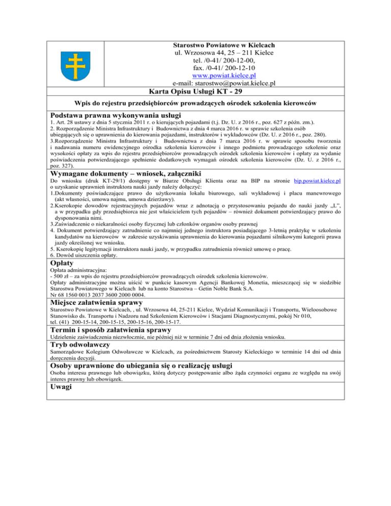 Starostwo Powiatowe w Kielcach ul. Wrzosowa 44, 25 – 211 Kielce tel. /0-41/ 200-12-00, fax. /0-41/ 200-12-10 www.powiat.kielce.pl e-mail: [email protected] Karta Opisu Usługi KT - 29 Wpis do rejestru przedsiębiorców prowadzących ośrodek szkolenia kierowców Podstawa prawna wykonywania usługi 1. Art. 28 ustawy z dnia 5 stycznia 2011 r. o kierujących pojazdami (t.j. Dz. U. z 2016 r., poz. 627 z późn. zm.). 2. Rozporządzenie Ministra Infrastruktury i Budownictwa z dnia 4 marca 2016 r. w sprawie szkolenia osób ubiegających się o uprawnienia do kierowania pojazdami, instruktorów i wykładowców (Dz. U. z 2016 r., poz. 280). 3.Rozporządzenie Ministra Infrastruktury i Budownictwa z dnia 7 marca 2016 r. w sprawie sposobu tworzenia i nadawania numeru ewidencyjnego ośrodka szkolenia kierowców i innego podmiotu prowadzącego szkolenie oraz wysokości opłaty za wpis do rejestru przedsiębiorców prowadzących ośrodek szkolenia kierowców i opłaty za wydanie poświadczenia potwierdzającego spełnienie dodatkowych wymagań ośrodek szkolenia kierowców (Dz. U. z 2016 r., poz. 327). Wymagane dokumenty – wniosek, załączniki Do wniosku (druk KT-29/1) dostępny w Biurze Obsługi Klienta oraz na BIP na stronie bip.powiat.kielce.pl o uzyskanie uprawnień instruktora nauki jazdy należy dołączyć: 1.Dokumenty poświadczające prawo do użytkowania lokalu biurowego, sali wykładowej i placu manewrowego (akt własności, umowa najmu, umowa dzierżawy). 2.Kserokopie dowodów rejestracyjnych pojazdów wraz z adnotacją o przystosowaniu pojazdu do nauki jazdy „L”, a w przypadku gdy przedsiębiorca nie jest właścicielem tych pojazdów – również dokument potwierdzający prawo do dysponowania nimi. 3.Zaświadczenie o niekaralności osoby fizycznej lub członków organów osoby prawnej 4. Dokument potwierdzający zatrudnienie co najmniej jednego instruktora posiadającego 3-letnią praktykę w szkoleniu kandydatów na kierowców w zakresie uzyskiwania uprawnienia do kierowania pojazdami silnikowymi kategorii prawa jazdy określonej we wniosku. 5. Kserokopię legitymacji instruktora nauki jazdy, w przypadku zatrudnienia również umowę o pracę. 6. Dowód uiszczenia opłaty. Opłaty Opłata administracyjna: - 500 zł – za wpis do rejestru przedsiębiorców prowadzących ośrodek szkolenia kierowców. Opłaty administracyjne można uiścić w punkcie kasowym Agencji Bankowej Monetia, mieszczącej się w siedzibie Starostwa Powiatowego w Kielcach lub na konto Starostwa – Getin Noble Bank S.A. Nr 68 1560 0013 2037 3600 2000 0004. Miejsce załatwienia sprawy Starostwo Powiatowe w Kielcach, , ul. Wrzosowa 44, 25-211 Kielce, Wydział Komunikacji i Transportu, Wieloosobowe Stanowisko ds. Transportu i Nadzoru nad Szkoleniem Kierowców i Stacjami Diagnostycznymi, pokój Nr 010, tel. (41) 200-15-14, 200-15-15, 200-15-16, 200-15-17. Termin i sposób załatwienia sprawy Udzielenie zaświadczenia niezwłocznie, nie później niż w terminie 7 dni od dnia złożenia wniosku. Tryb odwoławczy Samorządowe Kolegium Odwoławcze w Kielcach, za pośrednictwem Starosty Kieleckiego w terminie 14 dni od dnia doręczenia decyzji. Osoby uprawnione do ubiegania się o realizację usługi Osoba interesu prawnego lub obowiązku, którą dotyczy postępowanie albo żąda czynności organu ze względu na swój interes prawny lub obowiązek. Uwagi