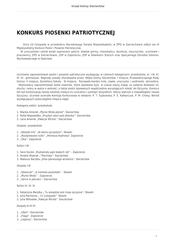 Urząd Gminy Sieciechów KONKURS PIOSENKI PATRIOTYCZNEJ Dnia 10 listopada w przededniu Narodowego Święta Niepodległości w ZPO w Sieciechowie odbył się III Międzyszkolny Konkurs Pieśni i Piosenki Patriotycznej. W uroczystości udział wzięli zaproszeni goście: władze gminy, mieszkańcy, dyrekcja, nauczyciele, uczniowie i pracownicy ZPO w Sieciechowie, ZSP w Zajezierzu, ZSP w Słowikach Starych oraz Specjalnego Ośrodka SzkolnoWychowawczego w Opactwie. Uczniowie zaprezentowali pieśni i piosenki patriotyczne występując w czterech kategoriach: przedszkole, kl. I-III, kl. IV- VI , gimnazjum. Nagrody zostały ufundowane przez: Wójta Gminy Sieciechów- I miejsce, Przewodniczącego Rady Gminy- II miejsce, Dyrektora Szkoły- III miejsce. Panowała bardzo miła, ciepła, uroczysta i podniosła atmosfera. Wykonawcy zaprezentowali wiele utworów, które śpiewane były w czasie wojny mając za zadanie dodawać sił, otuchy i wiary w walce o wolność, a także pieśni śpiewanych współcześnie wyrażających miłość do Ojczyzny. Konkurs ten był kontynuacją naszej szkolnej tradycji ku uczczeniu i pamięci wszystkich, którzy walczyli o niepodległość naszej Ojczyzny. Uczniów oceniała Komisja Konkursowa w składzie: P. T. Sujkowska, P. E. Kalbarczyk, P. M. Chołuj. Wśród występujących poszczególne miejsca zajęli: Kategoria soliści- przedszkole 1. Blanka Amerek „Płynie Wisła płynie”- Sieciechów 2. Rafał Wojewódka „Przybyli ułani pod okienko”- Sieciechów 3. Lena Amerek „Pałacyk Michla”- Sieciechów Zespoły- przedszkole 1. „Wesołe trio” „W domu ojczystym”- Słowiki 2. „Rozśpiewane nutki” „Pierwsza Kadrowa” Zajezierze 3. „Oka”- Zajezierze Soliści I-III 1. Sara Szulen „Rozkwitały pąki białych róż” – Zajezierze 2. Amelia Wiatrak „”Piechota”- Sieciechów 3. Mateusz Baryłka „Dnia pierwszego września”- Sieciechów Zespoły I-III 1. „Słowiczki” „A melodia pozostała” – Słowiki 2. „Płynie Wisła” – Zajezierze 3. „Serce w plecaku”- Sieciechów Soliści kl. IV- VI 1. Katarzyna Baryłka „ Tu wszędzie jest moja ojczyzna”- Słowiki 2. Julia Pachocka „ 11 Listopada”- Słowiki 3. Julia Witosław „Pałacyk Michla” -Sieciechów Zespoły kl.IV-VI 1. „Ułani” -Sieciechów 2. „Flaga” -Zajezierze 3. „Legiony”- Sieciechów 1 Urząd Gminy Sieciechów Soliści gimnazjum 1. Gabriela Roczkowska „Jest takie miejsce”- Sieciechów 2. Patrycja Kwapisz „Dziś idę walczyć mamo”- Sieciechów 3. Karolina Jasik „Rozszumiały się wierzby”- Opactwo i Adrian Molendowski „Przybyli ułani”- Opactwo Zespoły gimnazjum 1. „ Mury”- Sieciechów 2. „Serce w plecaku”- Opactwo Na zakończenie wszyscy uczestnicy i goście delektowali się wojskową grochówką, ciastem, pysznymi sałatkami przyrządzonymi przez pracowników naszej placówki. Wszystkim obecnym bardzo serdecznie dziękujemy. Jesteśmy dumni, że dzieci, młodzież i ich opiekunowie kultywują tradycję wyrażając w ten sposób swój patriotyzm. Jeszcze raz dziękujemy, do następnego spotkania. Organizatorzy 2