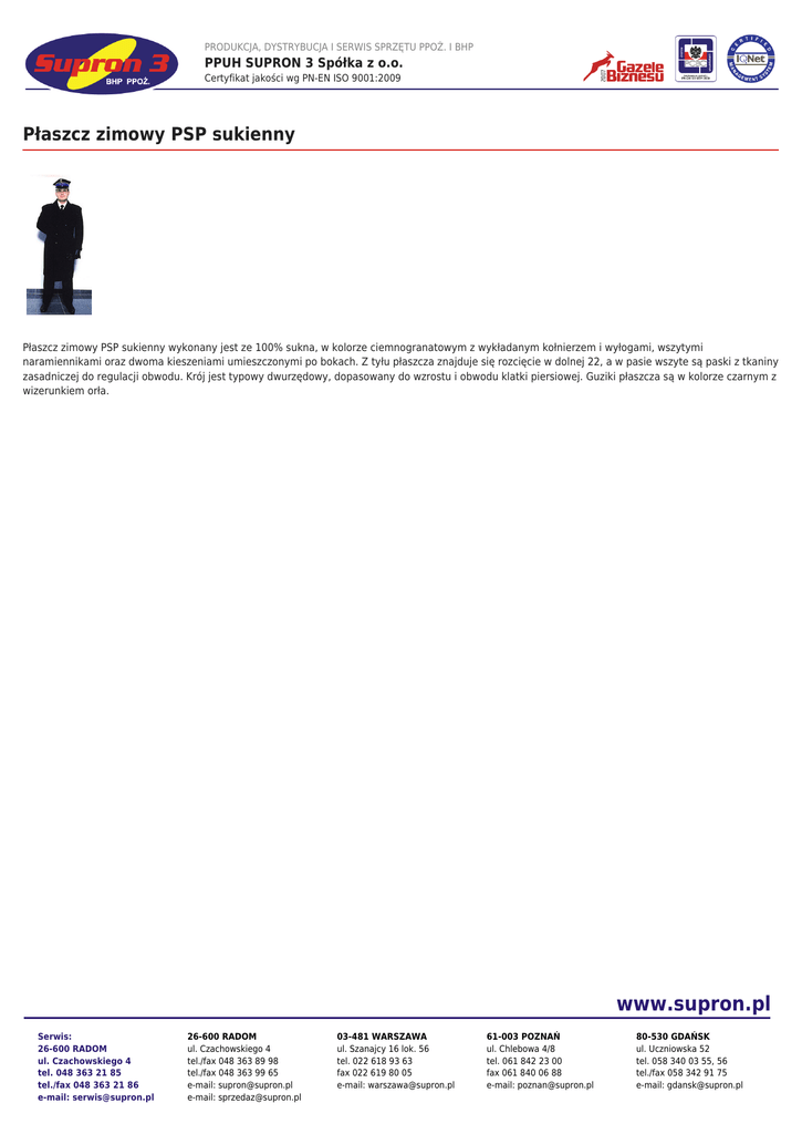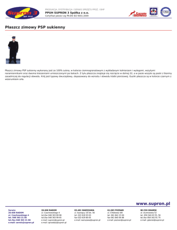 PRODUKCJA, DYSTRYBUCJA I SERWIS SPRZĘTU PPOŻ. I BHP PPUH SUPRON 3 Spółka z o.o. Certyfikat jakości wg PN-EN ISO 9001:2009 Płaszcz zimowy PSP sukienny Płaszcz zimowy PSP sukienny wykonany jest ze 100% sukna, w kolorze ciemnogranatowym z wykładanym kołnierzem i wyłogami, wszytymi naramiennikami oraz dwoma kieszeniami umieszczonymi po bokach. Z tyłu płaszcza znajduje się rozcięcie w dolnej 22, a w pasie wszyte są paski z tkaniny zasadniczej do regulacji obwodu. Krój jest typowy dwurzędowy, dopasowany do wzrostu i obwodu klatki piersiowej. Guziki płaszcza są w kolorze czarnym z wizerunkiem orła. www.supron.pl Serwis: 26-600 RADOM ul. Czachowskiego 4 tel. 048 363 21 85 tel./fax 048 363 21 86 e-mail: [email protected] 26-600 RADOM ul. Czachowskiego 4 tel./fax 048 363 89 98 tel./fax 048 363 99 65 e-mail: [email protected] e-mail: [email protected] 03-481 WARSZAWA ul. Szanajcy 16 lok. 56 tel. 022 618 93 63 fax 022 619 80 05 e-mail: [email protected] 61-003 POZNAŃ ul. Chlebowa 4/8 tel. 061 842 23 00 fax 061 840 06 88 e-mail: [email protected] 80-530 GDAŃSK ul. Uczniowska 52 tel. 058 340 03 55, 56 tel./fax 058 342 91 75 e-mail: [email protected]