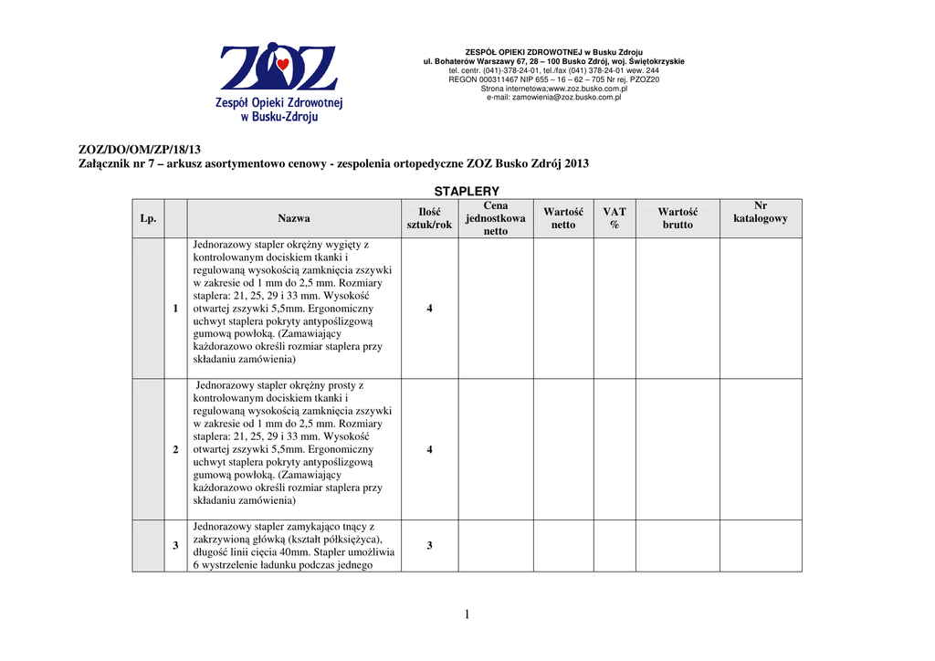 ZESPÓŁ OPIEKI ZDROWOTNEJ w Busku Zdroju ul. Bohaterów Warszawy 67, 28 – 100 Busko Zdrój, woj. Świętokrzyskie tel. centr. (041)-378-24-01, tel./fax (041) 378-24-01 wew. 244 REGON 000311467 NIP 655 – 16 – 62 – 705 Nr rej. PZOZ20 Strona internetowa;www.zoz.busko.com.pl e-mail: [email protected] ZOZ/DO/OM/ZP/18/13 Załącznik nr 7 – arkusz asortymentowo cenowy - zespolenia ortopedyczne ZOZ Busko Zdrój 2013 STAPLERY Lp. Nazwa 1 2 3 Jednorazowy stapler okręŜny wygięty z kontrolowanym dociskiem tkanki i regulowaną wysokością zamknięcia zszywki w zakresie od 1 mm do 2,5 mm. Rozmiary staplera: 21, 25, 29 i 33 mm. Wysokość otwartej zszywki 5,5mm. Ergonomiczny uchwyt staplera pokryty antypoślizgową gumową powłoką. (Zamawiający kaŜdorazowo określi rozmiar staplera przy składaniu zamówienia) Jednorazowy stapler okręŜny prosty z kontrolowanym dociskiem tkanki i regulowaną wysokością zamknięcia zszywki w zakresie od 1 mm do 2,5 mm. Rozmiary staplera: 21, 25, 29 i 33 mm. Wysokość otwartej zszywki 5,5mm. Ergonomiczny uchwyt staplera pokryty antypoślizgową gumową powłoką. (Zamawiający kaŜdorazowo określi rozmiar staplera przy składaniu zamówienia) Jednorazowy stapler zamykająco tnący z zakrzywioną główką (kształt półksięŜyca), długość linii cięcia 40mm. Stapler umoŜliwia 6 wystrzelenie ładunku podczas jednego Ilość sztuk/rok Cena jednostkowa netto 4 4 3 1 Wartość netto VAT % Wartość brutto Nr katalogowy ZESPÓŁ OPIEKI ZDROWOTNEJ w Busku Zdroju ul. Bohaterów Warszawy 67, 28 – 100 Busko Zdrój, woj. Świętokrzyskie tel. centr. (041)-378-24-01, tel./fax (041) 378-24-01 wew. 244 REGON 000311467 NIP 655 – 16 – 62 – 705 Nr rej. PZOZ20 Strona internetowa;www.zoz.busko.com.pl e-mail: [email protected] zabiegu, zawiera ładunek do tkanki standardowej, grubej. (Zamawiający kaŜdorazowo określi rodzaj ładunku w staplerze przy składaniu zamówienia). 4 5 6 Ładunek do staplera z zakrzywioną głowicą o długości linii cięcia 40mm. Ładunek do tkanki standardowej, grubej. (Zamawiający kaŜdorazowo określi rodzaj ładunku przy składaniu zamówienia).. Jednorazowa rączka staplera liniowego z noŜem wbudowanym w ładunek, umoŜliwiająca sekwencyjną regulację wysokości zszywek przeznaczonych do tkanki standardowej (1,5 mm po zamknięciu), pośredniej (1,8 mm po zamknięciu) i grubej (2 mm po zamknięciu). Stapler kompatybilny z ładunkiem posiadającym sześć rzędów zszywek wykonanych w technologii przestrzennej 3D o długości lini szwu 61 mm. (Stapler niezaładowany ładunkiem) Jednorazowa rączka staplera liniowego z noŜem wbudowanym w ładunek, umoŜliwiająca sekwencyjną regulację wysokości zszywek przeznaczonych do tkanki standardowej (1,5 mm po zamknięciu), pośredniej (1,8 mm po zamknięciu) i grubej (2 mm po zamknięciu). Stapler kompatybilny z ładunkiem posiadającym sześć rzędów zszywek wykonanych w technologii przestrzennej 3D 6 10 15 2 ZESPÓŁ OPIEKI ZDROWOTNEJ w Busku Zdroju ul. Bohaterów Warszawy 67, 28 – 100 Busko Zdrój, woj. Świętokrzyskie tel. centr. (041)-378-24-01, tel./fax (041) 378-24-01 wew. 244 REGON 000311467 NIP 655 – 16 – 62 – 705 Nr rej. PZOZ20 Strona internetowa;www.zoz.busko.com.pl e-mail: [email protected] o długości lini szwu 81 mm. (Stapler niezaładowany ładunkiem) 7 8 9 Uniwersalny ładunek do jednorazowego staplera liniowego z noŜem posiadającego sekwencyjną regulację wysokości zszywek przeznaczonych do tkanki standardowej (1,5 mm po zamknięciu), pośredniej (1,8 mm po zamknięciu) i grubej (2 mm po zamknięciu). Ładunek posiadający sześć rzędów zszywek wykonanych w technologii przestrzennej 3D o długości lini szwu 61 mm (nóŜ zintegrowany z ładunkiem). Uniwersalny ładunek do jednorazowego staplera liniowego z noŜem posiadającego sekwencyjną regulację wysokości zszywek przeznaczonych do tkanki standardowej (1,5 mm po zamknięciu), pośredniej (1,8 mm po zamknięciu) i grubej (2 mm po zamknięciu). Ładunek posiadający sześć rzędów zszywek wykonanych w technologii przestrzennej 3D o długości lini szwu 81 mm (nóŜ zintegrowany z ładunkiem). Jednorazowy stapler liniowy z noŜem o długości linii szwu 102mm załadowany ładunkiem do tkanki standardowej (wysokość zszywki po zamknięciu 1,5mm) i grubej (wysokość zszywki po zamknięciu 2,0mm). NóŜ zintegrowany ze staplerem. ( Zamawiający kaŜdorazowo określi rodzaj ładunku przy składaniu zamówienia) 12 12 3 3 ZESPÓŁ OPIEKI ZDROWOTNEJ w Busku Zdroju ul. Bohaterów Warszawy 67, 28 – 100 Busko Zdrój, woj. Świętokrzyskie tel. centr. (041)-378-24-01, tel./fax (041) 378-24-01 wew. 244 REGON 000311467 NIP 655 – 16 – 62 – 705 Nr rej. PZOZ20 Strona internetowa;www.zoz.busko.com.pl e-mail: [email protected] 10 11 12 13 Ładunek do jednorazowego staplera liniowego z noŜem o długości linii szwu 102mm do tkanki standardowej (wysokość zszywki po zamknięciu 1,5mm) i grubej (wysokość zszywki po zamknięciu 2,0mm). NóŜ zintegrowany ze staplerem. ( Zamawiający kaŜdorazowo określi rodzaj ładunku przy składaniu zamówienia) Jednorazowy automatyczny stapler liniowy o długości linii szwu 30 mm załadowany ładunkiem do tkanki naczyniowej (wysokość otwartej zszywki 2,5 mm), standardowej ( wysokość otwartej zszywki 3,5 mm) i grubej ( wysokość otwartej zszywki 4,8 mm). Stapler posiada dwie dźwignie - zamykającą i spustową. (Zamawiający kaŜdorazowo określi rodzaj ładunku w staplerze przy składaniu zamówienia) Jednorazowy automatyczny stapler liniowy o długości linii szwu 60 mm załadowany ładunkiem do tkanki standardowej ( wysokość otwartej zszywki 3,5 mm) i grubej ( wysokość otwartej zszywki 4,8 mm). Stapler posiada dwie dźwignie - zamykającą i spustową. (Zamawiający kaŜdorazowo określi rodzaj ładunku w staplerze przy składaniu zamówienia) Ładunek do automatycznego staplera liniowego o długości linii szwu 30mm do 12 3 3 12 4 ZESPÓ