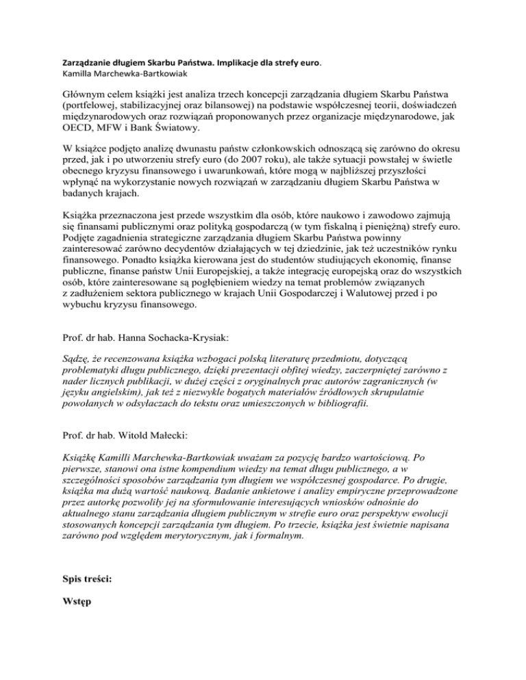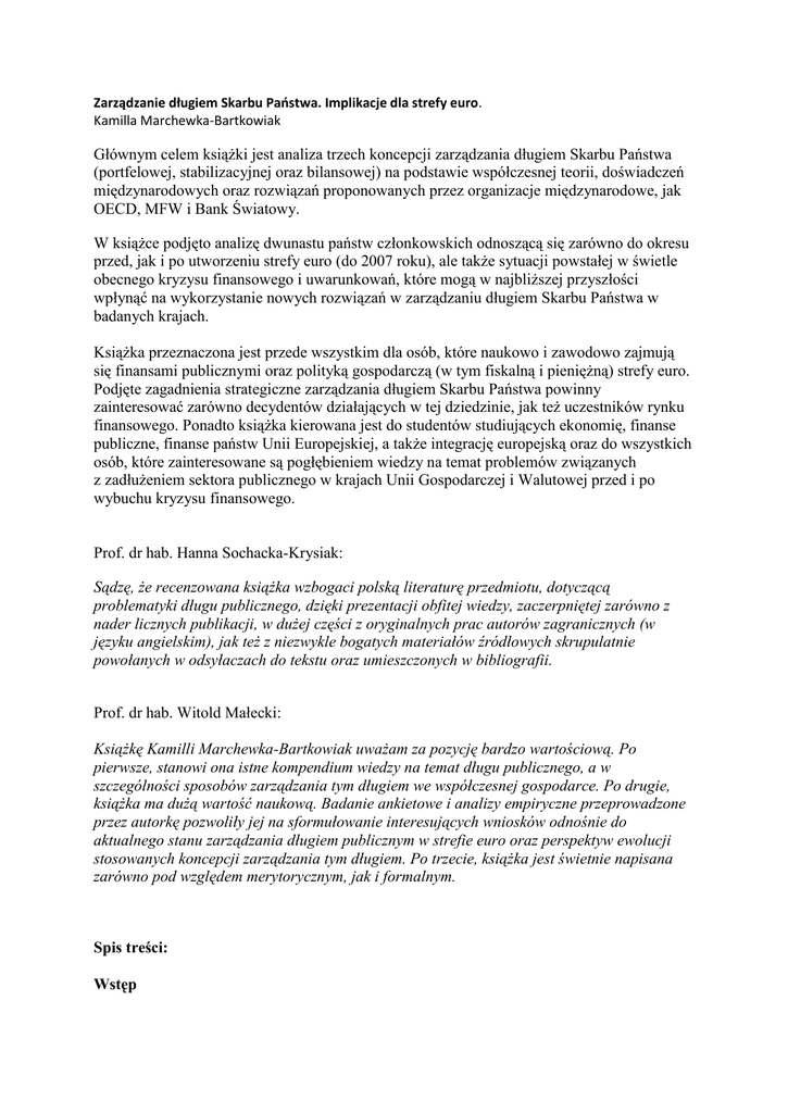 Zarządzanie długiem Skarbu Państwa. Implikacje dla strefy euro. Kamilla Marchewka-Bartkowiak Głównym celem książki jest analiza trzech koncepcji zarządzania długiem Skarbu Państwa (portfelowej, stabilizacyjnej oraz bilansowej) na podstawie współczesnej teorii, doświadczeń międzynarodowych oraz rozwiązań proponowanych przez organizacje międzynarodowe, jak OECD, MFW i Bank Światowy. W książce podjęto analizę dwunastu państw członkowskich odnoszącą się zarówno do okresu przed, jak i po utworzeniu strefy euro (do 2007 roku), ale także sytuacji powstałej w świetle obecnego kryzysu finansowego i uwarunkowań, które mogą w najbliższej przyszłości wpłynąć na wykorzystanie nowych rozwiązań w zarządzaniu długiem Skarbu Państwa w badanych krajach. Książka przeznaczona jest przede wszystkim dla osób, które naukowo i zawodowo zajmują się finansami publicznymi oraz polityką gospodarczą (w tym fiskalną i pieniężną) strefy euro. Podjęte zagadnienia strategiczne zarządzania długiem Skarbu Państwa powinny zainteresować zarówno decydentów działających w tej dziedzinie, jak też uczestników rynku finansowego. Ponadto książka kierowana jest do studentów studiujących ekonomię, finanse publiczne, finanse państw Unii Europejskiej, a także integrację europejską oraz do wszystkich osób, które zainteresowane są pogłębieniem wiedzy na temat problemów związanych z zadłużeniem sektora publicznego w krajach Unii Gospodarczej i Walutowej przed i po wybuchu kryzysu finansowego. Prof. dr hab. Hanna Sochacka-Krysiak: Sądzę, że recenzowana książka wzbogaci polską literaturę przedmiotu, dotyczącą problematyki długu publicznego, dzięki prezentacji obfitej wiedzy, zaczerpniętej zarówno z nader licznych publikacji, w dużej części z oryginalnych prac autorów zagranicznych (w języku angielskim), jak też z niezwykle bogatych materiałów źródłowych skrupulatnie powołanych w odsyłaczach do tekstu oraz umieszczonych w bibliografii. Prof. dr hab. Witold Małecki: Książkę Kamilli Marchewka-Bartkowiak uważam za pozycję bardzo wartościową. Po pierwsze, stanowi ona istne kompendium wiedzy na temat długu publicznego, a w szczególności sposobów zarządzania tym długiem we współczesnej gospodarce. Po drugie, książka ma dużą wartość naukową. Badanie ankietowe i analizy empiryczne przeprowadzone przez autorkę pozwoliły jej na sformułowanie interesujących wniosków odnośnie do aktualnego stanu zarządzania długiem publicznym w strefie euro oraz perspektyw ewolucji stosowanych koncepcji zarządzania tym długiem. Po trzecie, książka jest świetnie napisana zarówno pod względem merytorycznym, jak i formalnym. Spis treści: Wstęp Wykaz skrótów Rozdział 1. KONTROWERSJE WOKÓŁ ISTOTY I OGRANICZEŃ DŁUGU PUBLICZNEGO – przykład krajów strefy euro Wprowadzenie 1.1. Analiza poglądów na temat istoty długu publicznego w teorii ekonomii 1.1.1. Kontrowersje wokół długu potencjalnego 1.1.2. Kontrowersje wokół długu emerytalnego 1.1.3. Kontrowersje wokół długu netto 1.2. Klasyfikacja zobowiązań publicznych w świetle macierzy ryzyka fiskalnego 1.3. Dług konwencjonalny w standardach rachunkowych i statystycznych 1.3.1. Dług ESA a dług EDP – różnice metodologiczne 1.3.2. Struktura sektora general government a Skarb Państwa 1.3.3. Dług EDP a potrzeby pożyczkowe 1.3.4. Dług ESA w ujęciu bilansowym 1.4. Reguły ograniczające zadłużenie publiczne 1.4.1. Przyczyny wprowadzania i cechy reguł fiskalnych 1.4.2. Ograniczenie zaciągania długu publicznego jako rodzaj reguły fiskalnej Podsumowanie Rozdział 2. ZARZĄDZANIE DŁUGIEM SKARBU PAŃSTWA – konkurencja, koordynacja, centralizacja w strefie euro Wprowadzenie 2.1. Istota zarządzania długiem Skarbu Państwa 2.1.1. Synteza poglądów teoretycznych 2.1.2. Koncepcje zarządzania długiem Skarbu Państwa 2.2. Uwarunkowania zarządzania długiem Skarbu Państwa w strefie euro 2.2.1. Konkurencja 2.2.2. Koordynacja 2.2.3. Centralizacja Podsumowanie Rozdział 3. KONCEPCJA PORTFELOWA ZARZĄDZANIA DŁUGIEM SKARBU PAŃSTWA – w krajach strefy euro Wprowadzenie 3.1. Istota podejścia portfelowego w zarządzaniu długiem Skarbu Państwa 3.2. Cele zarządzania długiem Skarbu Państwa w podejściu portfelowym 3.3. Strategia zarządzania długiem Skarbu Państwa w podejściu portfelowym 3.3.1. Zarządzanie kosztem a zarządzanie ryzykiem 3.3.2. Strategia pasywna a strategia aktywna 3.4. Organizacja zarządzania długiem Skarbu Państwa w podejściu portfelowym 3.5. Analiza zmian strategii zarządzania portfelem długu Skarbu Państwa w krajach strefy euro z uwzględnieniem kryzysu finansowego 3.5.1. Cele strategiczne 3.5.2. Strategia zarządzania portfelem zadłużenia Skarbu Państwa w krajach strefy euro 3.6. Rola modelu agencyjnego w portfelowej koncepcji zarządzania długiem Skarbu Państwa w krajach strefy euro Podsumowanie Rozdział 4. KONCEPCJA STABILIZACYJNA W ZARZĄDZANIU DŁUGIEM SKARBU PAŃSTWA – analiza krajów strefy euro Wprowadzenie 4.1. Teoretyczne podstawy podejścia stabilizacyjnego 4.1.1. Optymalizacja podatków a zarządzanie długiem Skarbu Państwa 4.1.2. Stabilizowanie długu publicznego 4.2. Koncepcje stabilizacyjne w praktyce strefy euro 4.3. Uwarunkowania podejścia stabilizacyjnego w zarządzaniu długiem Skarbu Państwa 4.4. Analiza relacji kosztów obsługi długu do wybranych wskaźników makroekonomicznych i budżetowych w krajach strefy euro 4.5. Koncepcja stabilizacyjna w zarządzaniu długiem Skarbu Państwa w krajach strefy euro – próba weryfikacji i ocena uwarunkowań Podsumowanie Rozdział 5. KONCEPCJA ZARZĄDZANIA AKTYWAMI I PASYWAMI WŁADZ PUBLICZNYCH – w krajach strefy euro Wprowadzenie 5.1. Istota koncepcji ALM w ujęciu zagregowanym 5.2. Przyczyny zastosowania koncepcji ALM w sektorze publicznym 5.2.1. Wzrost znaczenia pozycji aktywów bilansu sektora publicznego 5.2.2. Zmiany w zakresie polityki