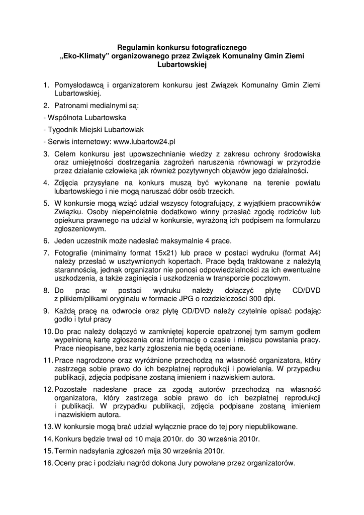 Regulamin konkursu fotograficznego „Eko-Klimaty” organizowanego przez Związek Komunalny Gmin Ziemi Lubartowskiej 1. Pomysłodawcą i organizatorem konkursu jest Związek Komunalny Gmin Ziemi Lubartowskiej. 2. Patronami medialnymi są: - Wspólnota Lubartowska - Tygodnik Miejski Lubartowiak - Serwis internetowy: www.lubartow24.pl 3. Celem konkursu jest upowszechnianie wiedzy z zakresu ochrony środowiska oraz umiejętności dostrzegania zagrożeń naruszenia równowagi w przyrodzie przez działanie człowieka jak również pozytywnych objawów jego działalności. 4. Zdjęcia przysyłane na konkurs muszą być wykonane na terenie powiatu lubartowskiego i nie mogą naruszać dóbr osób trzecich. 5. W konkursie mogą wziąć udział wszyscy fotografujący, z wyjątkiem pracowników Związku. Osoby niepełnoletnie dodatkowo winny przesłać zgodę rodziców lub opiekuna prawnego na udział w konkursie, wyrażoną ich podpisem na formularzu zgłoszeniowym. 6. Jeden uczestnik może nadesłać maksymalnie 4 prace. 7. Fotografie (minimalny format 15x21) lub prace w postaci wydruku (format A4) należy przesłać w usztywnionych kopertach. Prace będą traktowane z należytą starannością, jednak organizator nie ponosi odpowiedzialności za ich ewentualne uszkodzenia, a także zaginięcia i uszkodzenia w transporcie pocztowym. 8. Do prac w postaci wydruku należy dołączyć płytę z plikiem/plikami oryginału w formacie JPG o rozdzielczości 300 dpi. CD/DVD 9. Każdą pracę na odwrocie oraz płytę CD/DVD należy czytelnie opisać podając godło i tytuł pracy 10. Do prac należy dołączyć w zamkniętej kopercie opatrzonej tym samym godłem wypełnioną kartę zgłoszenia oraz informację o czasie i miejscu powstania pracy. Prace nieopisane, bez karty zgłoszenia nie będą oceniane. 11. Prace nagrodzone oraz wyróżnione przechodzą na własność organizatora, który zastrzega sobie prawo do ich bezpłatnej reprodukcji i powielania. W przypadku publikacji, zdjęcia podpisane zostaną imieniem i nazwiskiem autora. 12. Pozostałe nadesłane prace za zgodą autorów przechodzą na własność organizatora, który zastrzega sobie prawo do ich bezpłatnej reprodukcji i publikacji. W przypadku publikacji, zdjęcia podpisane zostaną imieniem i nazwiskiem autora. 13. W konkursie mogą brać udział wyłącznie prace do tej pory niepublikowane. 14. Konkurs będzie trwał od 10 maja 2010r. do 30 września 2010r. 15. Termin nadsyłania zgłoszeń mija 30 września 2010r. 16. Oceny prac i podziału nagród dokona Jury powołane przez organizatorów. 17. Przewidziane są nagrody rzeczowe o następującej wartości: za I miejsce kwota 700 zł za II miejsce kwota 450 zł za III miejsce kwota 250 zł dyplomy dla wszystkich uczestników konkursu. - Nagrody są współfinansowane ze środków Wojewódzkiego Funduszu Ochrony Środowiska i Gospodarki Wodnej w Lublinie www.wfos.lublin.pl . - Zgodnie z Ar. 21 ust 1 pkt 68 Ustawy o podatku dochodowym od osób fizycznych z dnia 26 lipca 1991 r. są one zwolnione od podatku dochodowego od wygranych. 18. Wyniki i konkursu zostaną ogłoszone do dnia 15 października 2010 r. na stronie internetowej Związku www.zwiazekgmin.lubartow.pl oraz w mediach patronackich. 19. Biorący udział w konkursie wyraża zgodę na przetwarzanie podanych przez niego danych osobowych (zgodnie z Ustawą z dnia 29 sierpnia 1997 roku, Dz.U. z 1997 Nr 133 poz. 883) przez Związek Komunalny Gmin Ziemi Lubartowskiej w celu przeprowadzenia niniejszego konkursu. 20. Osoby biorące udział w konkursie zgadzają się, w przypadku wygrania nagrody lub uzyskania wyróżnienia, na opublikowanie imienia, nazwiska i miejscowości zamieszkania w publikacjach. 21. Organizator zastrzega sobie prawo zmiany regulaminu, a także przerwanie lub odwołanie konkursu. 22. Uczestnik przystępujący do konkursu zgadza się na warunki przedstawione w powyższym regulaminie. 23. Regulamin niniejszy jest jedynym dokumentem określającym zasady konkursu. 24. Zdjęcia należy nadsyłać na adres: Związek Komunalny Gmin Ziemi Lubartowskiej 21-100 Lubartów ul. Lubelska 68 Z dopiskiem na kopercie „Konkurs fotograficzny” 25. Organizatorzy zastrzegają sobie prawo organizowanych przez siebie wystawach. ekspozycji wszystkich prac na