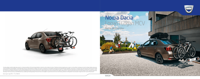 Nowa Dacia Logan i Logan MCV Gama akcesoriów Zostały podjęte wszelkie środki, aby zawarte w niniejszej publikacji informacje były dokładne i aktualne w dniu oddania do druku. Publikacja została przygotowana w oparciu o serie próbne i prototypy. W ramach polityki stałego ulepszania swoich produktów Grupa RENAULT zastrzega sobie prawo do wprowadzania w każdej chwili zmian w odniesieniu do specyfikacji opisanych lub przedstawionych pojazdów i akcesoriów. O zmianach tych Autoryzowani Partnerzy Dacia będą powiadamiani w możliwie najkrótszym terminie. Mogą występować pewne różnice między wersjami wprowadzonymi na rynek w poszczególnych krajach, tzn. niektóre elementy wyposażenia nie będą dostępne (w wyposażeniu seryjnym, w opcji lub w akcesoriach). Niektóre elementy wyposażenia opcjonalnego mogą się wykluczać lub być ze sobą powiązane. Nie zawsze zamieszczone zdjęcia należy łączyć z opisem wersji oferowanych na rynku polskim. W celu uzyskania najbardziej aktualnych informacji prosimy o skontaktowanie się z najbliższym Autoryzowanym Partnerem Dacia. Ze względu na ograniczenia techniczne druku kolory widoczne na fotografiach lub ilustracjach mogą nieco różnić się od rzeczywistych. Dacia Logan i Logan MCV - 77 11 768 242 Zatroszcz się o siebie! Spraw, aby Twoje życie codzienne stało się łatwiejsze, w pełni korzystaj z każdej chwili i ciesz się spokojem. Akcesoria Dacia opracowane specjalnie dla modelu Logan zabierają Cię codziennie w wyjątkową podróż. Nowocześniejsze, bezpieczniejsze i bardziej uniwersalne akcesoria ułatwiają życie i są do Twojej dyspozycji. Przygotuj się na intensywne doznania. 2 Spis treści Tętniący życiem design Wygląd zewnętrzny Wygląd wnętrza Felgi aluminiowe Komfort i ochrona Dywaniki Wyposażenie wnętrza Pokrowce Wyposażenie bagażnika Akcesoria do szyb Ochrona karoserii Multimedia Wideo Audio Telefon Przewoź więcej i lepiej Haki holownicze Transport Spokój ducha str. 6 str. 6 str. 7 str. 10 str. 11 str. 11 str. 12 str. 14 str. 15 str. 18 str. 18 str. 19 str. 22 str. 23 Wspomaganie jazdy Zabezpieczenia antywłamaniowe i monitoring Łańcuchy śniegowe Bezpieczeństwo dziecka Pakiety akcesoriów str. 26 Kompletna lista akcesoriów str. 30 str. 26 str. 27 str. 27 str. 28 3 Tętniący życiem design Zmieniaj do woli wygląd swojej Dacii Logan, aby zyskać na oryginalności! Twój samochód ujawni Twoją prawdziwą osobowość. Niech Twój Logan będzie pojazdem wyjątkowym i w Twoim stylu. Felga koła Runway 16” Kolor: czarny diamentowy 82 01 684 229 5 Wygląd zewnętrzny 2 1. Zestaw sportowy Idealny do podrasowania sportowego wyglądu Twojego modelu Logan i nadania mu bardziej sportowego charakteru. Zestaw zawiera listwę pod przedni zderzak, boczne spojlery progowe prawy i lewy, tylny dyfuzor i spojler. Kolor: lśniąca czerń 82 01 684 445 (Logan) 1 Felgi aluminiowe Wyraź swoją osobowość dzięki ekskluzywnym obręczom kół. Nowoczesny wygląd i bezpieczeństwo bez kompromisów. 2. Spojler Podkreśl sportowy charakter Twojego pojazdu. Mały dodatek, który naprawdę robi różnicę! 82 01 684 967 Wygląd wnętrza 1. Nakładki progowe Dacia Stylowa personalizacja i ochrona wejścia do pojazdu dzięki progom z logo Dacia. 82 01 351 844 (przód) 82 01 391 425 (tył) 1 6 2 2. Podświetlane nakładki progowe Dacia Elegancja i nowoczesność przy każdym otwarciu drzwi. Czasowe białe podświetlenie progów przyciąga wzrok zarówno w dzień, jak i w nocy. Aluminiowe wykończenie z logo Dacia dodaje im odrobinę ekskluzywności. Zestaw 2 nakładek progowych (prawa i lewa). 82 01 468 752 1 1. Felga koła Runway 16” Kolor: czarny diamentowy Opona : 195/55 R 16 91 H 82 01 684 229 (felga koła) 40 31 543 28R (kołpaczek) 2 2. Felga koła Altica 16” Kolor: czarny diamentowy Opona : 195/55 R 16 91 H 40 30 075 50R (Felga koła) 40 31 543 28R (Kołpaczek) 3 3. Felga koła Chamade 15” Kolor: szary Opona : 185/65 R 15 88 T 40 30 046 77R 7 Przenośny organizer do bagażnika 82 01 653 542 Ochrona na co dzień Zapewnij sobie ochronę dopasowaną do potrzeb i wysokiej jakości. Akcesoria Dacia są równie estetyczne co funkcjonalne – idealnie pasują do Twojego modelu Logan. Prowadzenie samochodu jeszcze nigdy nie było tak komfortowe i spokojne, jak w przypadku Dacia. Felga koła Runway 16” Kolor: czarny diamentowy 82 01 684 229 9 Dywaniki Dodatkowa ochrona Twojego pojazdu. Dopasowane i spersonalizowane dywaniki poddawane są rygorystycznym testom i gwarantują najwyższą jakość, bezpieczeństwo i trwałość. Dywanik kierowcy łatwo przymocować specjalnymi zaciskami bezpieczeństwa. 1. Dywaniki gumowe Wodoodporne i łatwe w utrzymaniu. Chronią blask wnętrza i przedłużają jego trwałość. 82 01 621 053 2. Dywaniki tekstylne Standard Łatwe w utrzymaniu. Chronią pojazd dokładnie tam, gdzie jest to bardzo wskazane. 82 01 337 453 1 Wyposażenie wnętrza 1. Zestaw palacza Niezbędny do zachowania czystości w pojeździe. Zawiera popielniczkę i zapalniczkę. 82 01 375 535 2. Podłokietnik przedni Zwiększ swój komfort podróży i ciesz się dodatkowym schowkiem, do którego możesz włożyć drobne przedmioty osobiste. Regulowana wysokość dla jeszcze większego komfortu. Kolor: czarny Pojemność: 1 litr 82 01 679 842 1 2 3 2 3. Dywaniki tekstylne Comfort Spraw sobie przyjemność wysokiej klasy. Wykończenie z szarym splotem i haftem z nazwą Twojego pojazdu.. 82 01 522 662 Pokrowce 2 10 3 3. Pokrowce na siedzenia przednie Doskonała ochrona oryginalnej tapicerki Twojego pojazdu. Dopasowane i łatwe w montażu i czyszczeniu. 82 01 496 809 Kompletny wykaz pokrowców na siedzenia na stronie 30. 11 Wyposażenie bagażnika 1. Wkład do bagażnika Idealny do łatwego transportu różnych produktów, w szczególności brudzących przedmiotów. Skutecznie chroni oryginalną wykładzinę i idealnie dopasowuje się do kształtu bagażnika Twojego pojazdu. Jest praktyczny, a za sprawą pół