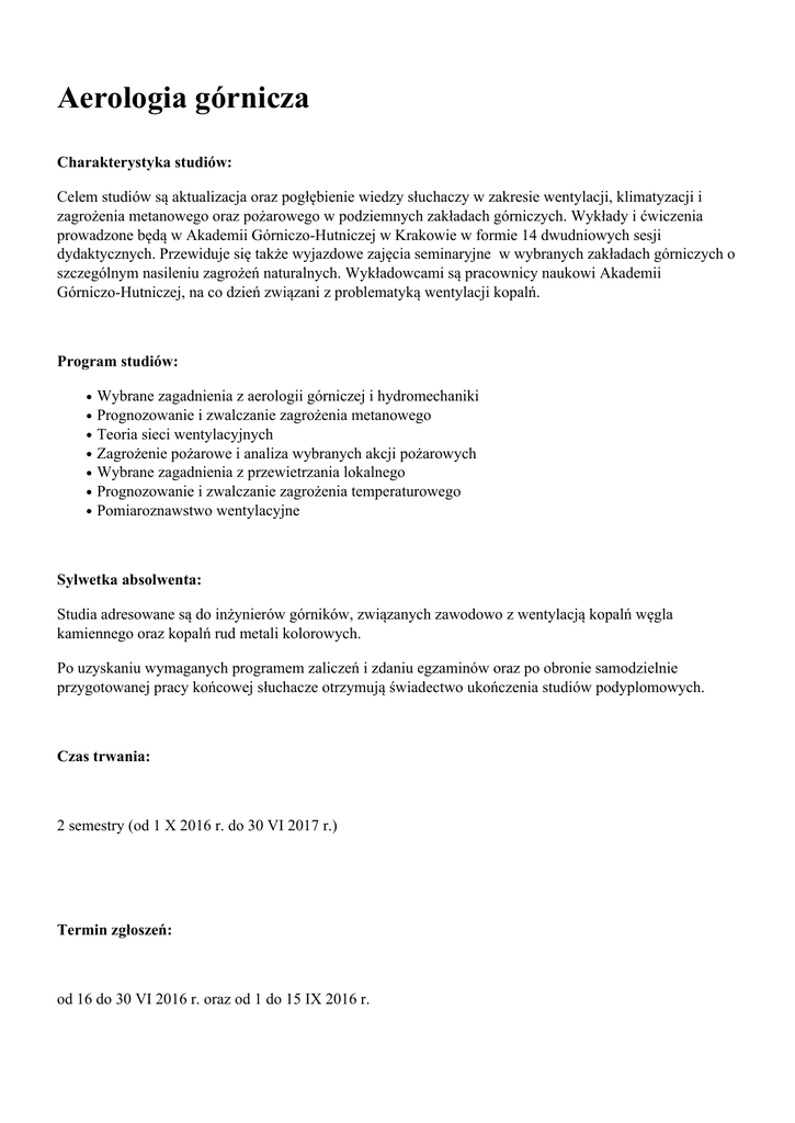 Aerologia górnicza Charakterystyka studiów: Celem studiów są aktualizacja oraz pogłębienie wiedzy słuchaczy w zakresie wentylacji, klimatyzacji i zagrożenia metanowego oraz pożarowego w podziemnych zakładach górniczych. Wykłady i ćwiczenia prowadzone będą w Akademii Górniczo-Hutniczej w Krakowie w formie 14 dwudniowych sesji dydaktycznych. Przewiduje się także wyjazdowe zajęcia seminaryjne w wybranych zakładach górniczych o szczególnym nasileniu zagrożeń naturalnych. Wykładowcami są pracownicy naukowi Akademii Górniczo-Hutniczej, na co dzień związani z problematyką wentylacji kopalń. Program studiów: Wybrane zagadnienia z aerologii górniczej i hydromechaniki Prognozowanie i zwalczanie zagrożenia metanowego Teoria sieci wentylacyjnych Zagrożenie pożarowe i analiza wybranych akcji pożarowych Wybrane zagadnienia z przewietrzania lokalnego Prognozowanie i zwalczanie zagrożenia temperaturowego Pomiaroznawstwo wentylacyjne Sylwetka absolwenta: Studia adresowane są do inżynierów górników, związanych zawodowo z wentylacją kopalń węgla kamiennego oraz kopalń rud metali kolorowych. Po uzyskaniu wymaganych programem zaliczeń i zdaniu egzaminów oraz po obronie samodzielnie przygotowanej pracy końcowej słuchacze otrzymują świadectwo ukończenia studiów podyplomowych. Czas trwania: 2 semestry (od 1 X 2016 r. do 30 VI 2017 r.) Termin zgłoszeń: od 16 do 30 VI 2016 r. oraz od 1 do 15 IX 2016 r. Wymagane dokumenty: podanie odpis (lub potwierdzona kserokopia) dyplomu ukończenia studiów wyższych karta zgłoszenia Tryb zgłoszeń: kolejność zgłoszeń (skierowanie z zakładu pracy, indywidualne zgłoszenia) Liczba miejsc: 30 Miejsce zgłoszeń: AGH, Wydział Górnictwa i Geoinżynierii al. Mickiewicza 30, 30-059 Kraków pawilon A-1, pokój 115 Osoba przyjmująca zgłoszenia: dr inż. Zbigniew Kuczera (tel.: 12 617 21 63, [email protected]) Opłaty: 4 000 zł Informacje dodatkowe: Zajęcia odbywać się będą w formie zjazdów w piątki po południu i w soboty do południa co dwa tygodnie. Opłata za studia nie pokrywa wyżywienia i zakwaterowania. Termin płatności do 30 IX 2016 r. Numer rachunku zostanie podany uczestnikom po 20 IX 2016 r. Organizator studiów podyplomowych: Wydział Górnictwa i Geoinżynierii Katedra Górnictwa Podziemnego Adres organizatora: al. Mickiewicza 30 30-059 Kraków pawilon A-1, pokój 120 tel.: 12 617 20 60 e-mail: [email protected] www.kgp.agh.edu.pl Kierownik: prof. dr hab. inż. Bernard Nowak e-mail: [email protected] Osoba do kontaktu: dr inż. Zbigniew Kuczera tel.: 12 617 21 63 e-mail: [email protected]
