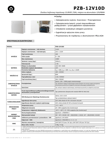 PZB-12V10D Zasilacz buforowy impulsowy 13.8VDC /10A, miejsce na akumulator 12V/40Ah ■ Cechy: • Zabezpieczenia wyjścia: Zwarciowe / Przeciążeniowe • Zabezpieczenia baterii: przed nieprawidłowym podłączeniem / przed głębokiem rozładowaniem • Chłodzenie swobodnym obiegiem powietrza • Sygnalizacja optyczna stanu pracy • Przystosowany do współpracy z akumulatorem VRLA AGM SPECYFIKACJA ELEKTRYCZNA MODEL PZB-12V10D WYJŚCIE BATERIA WEJŚCIE AC Napięcie znamionowe - tryb sieciowy 13.8V Napięcie znamionowe - tryb bateryjny 10.5 ÷ 13.8V Prąd znamionowy 10A Zakres prądu 0 ÷ 10A Moc znamionowa 138W Tętnienia i szumy (typ.) 240mVP-P Tolerancja [2] ± 5% Miejsce na akumulator Nominalne napięcie akumulatora Parametry ładowania 12V / 40 ÷ 45Ah 12V IMAX = 10A, INOM = 10A – IWY , UBAT = 13.8V Zakres napięcia 180 ÷ 264VAC Sprawność (typ.) 80% Prąd pobierany z sieci 1.6A / 230VAC Prąd rozruchowy (max.) 30A / 230VAC Zakres: 105 ÷ 150% prądu znamionowego ZABEZPIECZENIA WYJŚCIA ZABEZPIECZENIA BATERII Przeciążeniowe Typ: obniżanie napięcia wyjściowego proporcjonalnie do wzrostu prądu przeciążenia. Automatyczny powrót po ustąpieniu przyczyny aktywującej zabezpieczenie. Zwarciowe Typ: odcięcie napięcia wejściowego, automatyczny powrót po ustąpieniu przyczyny. Przed nieprawidłowym podłączeniem(biegunowość) akumulatora, przeciążeniowe Typ: jednokrotne (bezpiecznik modułu RGR FS1 M12.5A) RGR (Rozłączenie Głębokiego Rozładowania) FUNKCJONALNOŚĆ ŚRODOWISKO PRACY NORMY BEZPIECZEŃSTWA I EMC INNE [*] PZB-12V10D-SPEC-R1.0 Zakres: 10.5 ± 0.5V Typ: przekaźnikowe odcięcie baterii Sygnalizacja stanu pracy LED: żółta dioda AC OK w drzwiach skrzynki Sygnalizacja obecności napięcia wyjściowego LED: zielona dioda DC OK w drzwiach skrzynki Temperatura pracy -5°C ÷ +45°C Wilgotność otoczenia 20 ÷ 90% względna (bez kondensacji) Temperatura i wilgotność składowania -20°C ÷ +60°C, 10 ÷ 95% względna (bez kondensacji) Normy bezpieczeństwa Zgodność z EN60950-1 Wytrzymałość izolacji WE – WY: 2.5kVAC; WE – OBUDOWA: 1.5kVAC, WY – OBUDOWA: 0.5kVAC Zakłócenia promieniowane i przewodzone - EMI Zgodność z EN 55022 Odporność - EMS Zgodność z EN61000-4-2, -4, -5, -11 Wymiary wewnętrzne / zewnętrzne 330*350*175 (szer.*dł.*gł.); 334*354*176 (szer.*dł.*gł.) Masa netto / brutto 3.9kg / 4.1kg 1. Podane parametry(jeżeli nie zaznaczono inaczej) zmierzono dla napięcia wejściowego 230VC, znamionowego prądu obciążenia oraz temperatury otoczenia 25°C. 2. Tolerancja wyraża maksymalną rozbieżność napięcia wyjściowego uwzględniając zmiany przy załączaniu, w zależności od zmian napięcia wejściowego oraz w zależności od zmian prądu obciążenia. 3. Zasilacz jest podzespołem wg normy EN61204 przeznaczonym do wbudowania w wyrób finalny przez wykwalifikowany personel i nie może być traktowany jako samodzielne urządzenie. Ostateczny efekt kompatybilności elektromagnetycznej jest określany dla wyrobu finalnego, wówczas wymagana jest deklaracja zgodności dla całości instalacji. 26.02.2014 PZB-12V10D Zasilacz buforowy impulsowy 13.8VDC /10A, miejsce na akumulator 12V/40Ah SPECYFIKACJA MECHANICZNA Moduł zasilający – wejście Nr Funkcja TAMPER Opis Nr Funkcja Opis 1 AC/L Zacisk neutralny napięcia wejściowego 1 NO Styki normalnie otwarty przycisku antysabotażowego 2 AC/N Zacisk fazowy napięcia wejściowego 2 COM Styki wspólny otwarty przycisku antysabotażowego 3 GND Zacisk uziemiający Moduł RGR – wyjście i bateria CN1: 1,2 VOUT+ Zacisk dodatni napięcia wyjściowego CN2: 3,4 VOUT- Zacisk ujemny napięcia wyjściowego CN3: 5 BAT- (czarny) końcówka oczkowa M5 Zacisk ujemny akumulatora CN3: 6 BAT+ (czerwony) końcówka oczkowa M5 Zacisk dodatni akumulatora Dioda LED AC OK (żółta) Dioda LED DC OK (zielona) Opis Uwagi Praca normalna – tryb sieciowy - nie świeci PZB-12V10D-SPEC-R1.0 26.02.2014 Praca w trybie bateryjnym, zanik sieci Mógł zostać uszkodzony bezpiecznik sieciowy Brak napięcia wejściowego oraz wyjściowego Mógł zostać uszkodzony bezpiecznik sieciowy i bateryjny - świeci