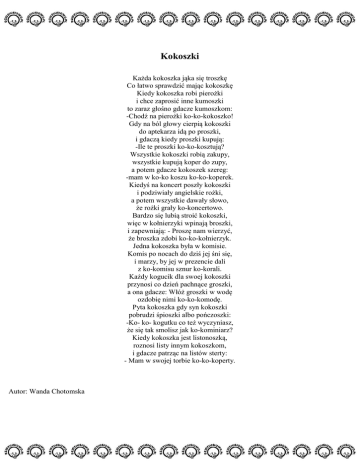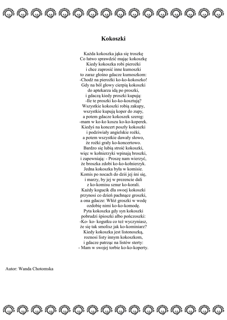 Kokoszki Każda kokoszka jąka się troszkę Co łatwo sprawdzić mając kokoszkę Kiedy kokoszka robi pierożki i chce zaprosić inne kumoszki to zaraz głośno gdacze kumoszkom: -Chodź na pierożki ko-ko-kokoszko! Gdy na ból głowy cierpią kokoszki do aptekarza idą po proszki, i gdaczą kiedy proszki kupują: -Ile te proszki ko-ko-kosztują? Wszystkie kokoszki robią zakupy, wszystkie kupują koper do zupy, a potem gdacze kokoszek szereg: -mam w ko-ko koszu ko-ko-koperek. Kiedyś na koncert poszły kokoszki i podziwiały angielskie rożki, a potem wszystkie dawały słowo, że rożki grały ko-koncertowo. Bardzo się lubią stroić kokoszki, więc w kołnierzyki wpinają broszki, i zapewniają: - Proszę nam wierzyć, że broszka zdobi ko-ko-kołnierzyk. Jedna kokoszka była w komisie. Komis po nocach do dziś jej śni się, i marzy, by jej w prezencie dali z ko-komisu sznur ko-korali. Każdy kogucik dla swoej kokoszki przynosi co dzień pachnące groszki, a ona gdacze: Włóż groszki w wodę ozdobię nimi ko-ko-komodę. Pyta kokoszka gdy syn kokoszki pobrudzi śpioszki albo pończoszki: -Ko- ko- kogutku co też wyczyniasz, że się tak smolisz jak ko-kominiarz? Kiedy kokoszka jest listonoszką, roznosi listy innym kokoszkom, i gdacze patrząc na listów sterty: - Mam w swojej torbie ko-ko-koperty. Autor: Wanda Chotomska