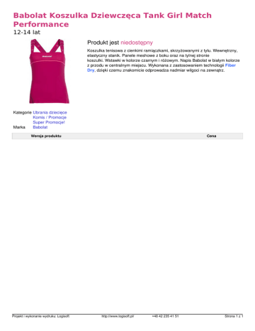 Babolat Koszulka Dziewczęca Tank Girl Match Performance 12-14 lat Produkt jest niedostępny Koszulka tenisowa z cienkimi ramiączkami, skrzyżowanymi z tyłu. Wewnętrzny, elastyczny stanik. Panele meshowe z boku oraz na tylnej stronie koszulki. Wstawki w kolorze czarnym i różowym. Napis Babolat w białym kolorze z przodu w centralnym miejscu. Wykonana z zastosowaniem technologii Fiber Dry, dzięki czemu znakomicie odprowadza nadmiar wilgoci na zewnątrz. Kategorie Ubrania dziecięce Komis / Promocje Super Promocje! Marka Babolat Wersja produktu Projekt i wykonanie wydruku: Logisoft Powered by TCPDF (www.tcpdf.org) Cena http://www.logisoft.pl/ +48 42 235 41 51 Strona 1 z 1