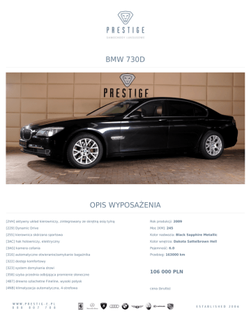 BMW 730D OPIS WYPOSAŻENIA [2VH] aktywny układ kierowniczy, zintegrowany ze skrętną osią tylną Rok produkcji: 2009 [229] Dynamic Drive Moc [KM]: 245 [255] kierownica skórzana sportowa Kolor nadwozia: Black Sapphire Metallic [3AC] hak holowniczy, elektryczny Kolor wnętrza: Dakota Sattelbrown Hell [3AG] kamera cofania Pojemność: 6.0 [316] automatyczne otwieranie/zamykanie bagażnika Przebieg: 163000 km [322] dostęp komfortowy [323] system domykania drzwi [358] szyba przednia odbijająca promienie słoneczne 106 000 PLN [4B7] drewno szlachetne Fineline, wysoki połysk [4NB] klimatyzacja automatyczna, 4-strefowa cena (brutto) [4UR] oświetlenie Ambiente T: +48 888 807 708 lub +48 665 400 500 [430] automatycznie ściemniające się lusterka zewnętrze i wewnętrzne E: [email protected] [453] aktywna wentylacja foteli przednich [464] rękaw na narty [494] podgrzewane fotele przednie [5DK] Side View Camera [508] czujniki parkowania PDC [6FL] USB-/Audio Interface [6NF] rozszerzenie interfejsu audio o telefony komórkowe [6UK] BMW Night Vision z rozpoznawaniem osób [609] system nawigacyjny Professional [610] wyświetlacz BMW Head-Up [676] HiFi System [698] Area-Code 2 DVD [761] szyby przeciwsłoneczne BMW Individual Pierwszy właściciel, salon Polska. Pełna historia serwisowa.