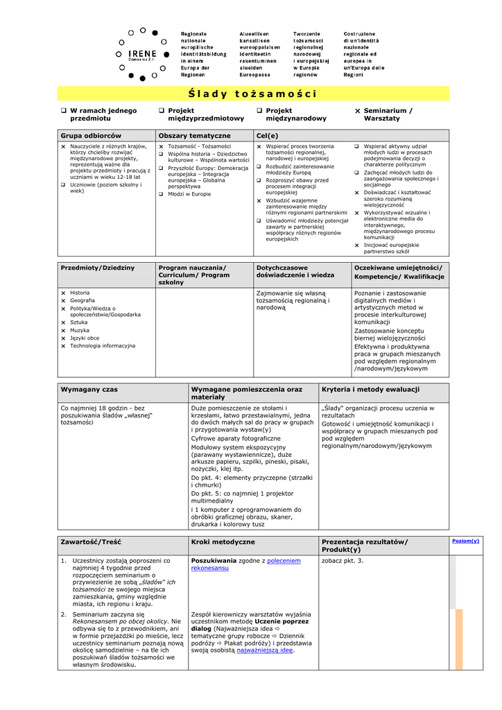 Ślady tożsamości W ramach jednego Projekt Projekt Grupa odbiorców Obszary tematyczne Cel(e) U Nauczyciele z różnych krajów, którzy chcieliby rozwijać międzynarodowe projekty, reprezentują ważne dla projektu przedmioty i pracują z uczniami w wieku 12-18 lat U Tożsamość - Tożsamości U Wspierać proces tworzenia tożsamości regionalnej, narodowej i europejskiej przedmiotu Uczniowie (poziom szkolny i wiek) międzyprzedmiotowy Wspólna historia – Dziedzictwo kulturowe – Wspólnota wartości Przyszłość Europy: Demokracja europejska – Integracja europejska – Globalna perspektywa Młodzi w Europie międzynarodowy Rozbudzić zainteresowanie młodzieży Europą Rozproszyć obawy przed procesem integracji europejskiej U Wzbudzić wzajemne zainteresowanie między różnymi regionami partnerskimi Uświadomić młodzieży potencjał zawarty w partnerskiej współpracy różnych regionów europejskich Przedmioty/Dziedziny Program nauczania/ Curriculum/ Program szkolny U Historia U Geografia U Polityka/Wiedza o społeczeństwie/Gospodarka U Seminarium / Warsztaty Wspierać aktywny udział młodych ludzi w procesach podejmowania decyzji o charakterze politycznym Zachęcać młodych ludzi do zaangażowania społecznego i socjalnego U Doświadczać i kształtować szeroko rozumianą wielojęzyczność U Wykorzystywać wizualne i elektroniczne media do interaktywnego, międzynarodowego procesu komunikacji U Inicjować europejskie partnerstwo szkół Dotychczasowe doświadczenie i wiedza Oczekiwane umiejętności/ Zajmowanie się własną tożsamością regionalną i narodową Poznanie i zastosowanie digitalnych mediów i artystycznych metod w procesie interkulturowej komunikacji Zastosowanie konceptu biernej wielojęzyczności Efektywna i produktywna praca w grupach mieszanych pod względem regionalnym /narodowym/językowym U Sztuka U Muzyka U Języki obce U Technologia informacyjna Kompetencje/ Kwalifikacje Wymagany czas Wymagane pomieszczenia oraz materiały Kryteria i metody ewaluacji Co najmniej 18 godzin - bez poszukiwania śladów „własnej“ tożsamości Duże pomieszczenie ze stołami i krzesłami, łatwo przestawialnymi, jedna do dwóch małych sal do pracy w grupach i przygotowania wystaw(y) Cyfrowe aparaty fotograficzne Modułowy system ekspozycyjny (parawany wystawiennicze), duże arkusze papieru, szpilki, pineski, pisaki, nożyczki, klej itp. Do pkt. 4: elementy przyczepne (strzałki i chmurki) Do pkt. 5: co najmniej 1 projektor multimedialny i 1 komputer z oprogramowaniem do obróbki graficznej obrazu, skaner, drukarka i kolorowy tusz „Ślady“ organizacji procesu uczenia w rezultatach Gotowość i umiejętność komunikacji i współpracy w grupach mieszanych pod pod względem regionalnym/narodowym/językowym Zawartość/Treść Kroki metodyczne Prezentacja rezultatów/ Produkt(y) 1. Uczestnicy zostają poproszeni co najmniej 4 tygodnie przed rozpoczęciem seminarium o przywiezienie ze sobą „śladów“ ich tożsamości ze swojego miejsca zamieszkania, gminy względnie miasta, ich regionu i kraju. Poszukiwania zgodne z poleceniem rekonesansu zobacz pkt. 3. 2. Seminarium zaczyna się Rekonesansem po obcej okolicy. Nie odbywa się to z przewodnikiem, ani w formie przejażdżki po mieście, lecz uczestnicy seminarium poznają nową okolicę samodzielnie – na tle ich poszukiwań śladów tożsamości we własnym środowisku. Zespół kierowniczy warsztatów wyjaśnia uczestnikom metodę Uczenie poprzez dialog (Najważniejsza idea Ö tematyczne grupy robocze Ö Dziennik podróży Ö Plakat podróży) i przedstawia swoją osobistą najważniejszą ideę. Poziom(y) Zawartość/Treść Kroki metodyczne Prezentacja rezultatów/ Produkt(y) Wskaźniki tożsamości regionalnej zachęcają do wyboru punktów ciężkości rekonesansu/poszukiwań śladów tożsamości i do utworzenia tematycznych grup roboczych Jeśli wszyscy uczestnicy przybędą równocześnie, powstanie wspólnie utworzona mapa pamięci ze Wskaźnikami regionalnej tożsamości. Możliwe jest również, przybywającym po kolei uczestnikom, wyjaśnienie metody (Najważniejsza idea Ö tematyczne grupy robocze Ö „Dziennik podróży“ Ö „Plakat podróży grupowej“) i przekazanie im mapy pamięci, przygotowanej przez zespół. Praktyczne wskazówki i informacje W celu orientacji w obcym miejscu uczestnicy otrzymują plany miasta, programy imprez, różne pisma informacyjne, bilety na przejazdy publicznymi środkami komunikacji... Na pytania uczestników odpowiada zespół kierowniczy podając wskazówki techniczne i informacje dot. treści (Stacja informacyjna). Poszukiwanie śladów tożsamości na obczyźnie... Uczestnicy nanoszą swoje wrażenia do „Dziennika podróży“ na przygotowanej odpowiednio kartce do notatek i robią zdjęcia cyfrowe. Fotografie Poszukiwanie śladów tożsamości we Frankfurcie Przedstawienie tego co obce, zaskakujące i oczekiwane – wymiana wrażeń i doświadczeń oraz ich prezentacja Tematyczne grupy robocze tworzą z wybranych fotografii i innych śladów tożsamości „Plakaty podróży grupowej“. Fotografie Plakaty podróży grupowej 3. Wystawa przywiezionych ze sobą (własnych) śladów tożsamości Uczestnicy przygotowują w grupach z „przywiezionych przez siebie małych upominków” regionalne względnie narodowe stoiska wystawowe i częstują próbkami regionalnych specjalności. Fotografie Wystawa śladów tożsamości 4. Aktywne zwiedzanie wystawy śladów tożsamości i „plakatów podróży grupowej“ – (Własne i obce) Pytania i komentarze do eksponatów – prezentacja i dyskusja Uczestnicy komentują wystawę poprzez to, że przyczepiają do eksponatów podpisane zawieszki – na osobę 3 chmurki (pytania) i 5 strzałek (zainteresowany/a/dziwi mnie). Rozmowy pomiędzy wystawcami i zwiedzającymi. Fotografie Ślady tożsamości – wystawa z komentarzem 5. Tożsamości digitalne – artystyczne metody przyswajania i wyobcowania Na pod