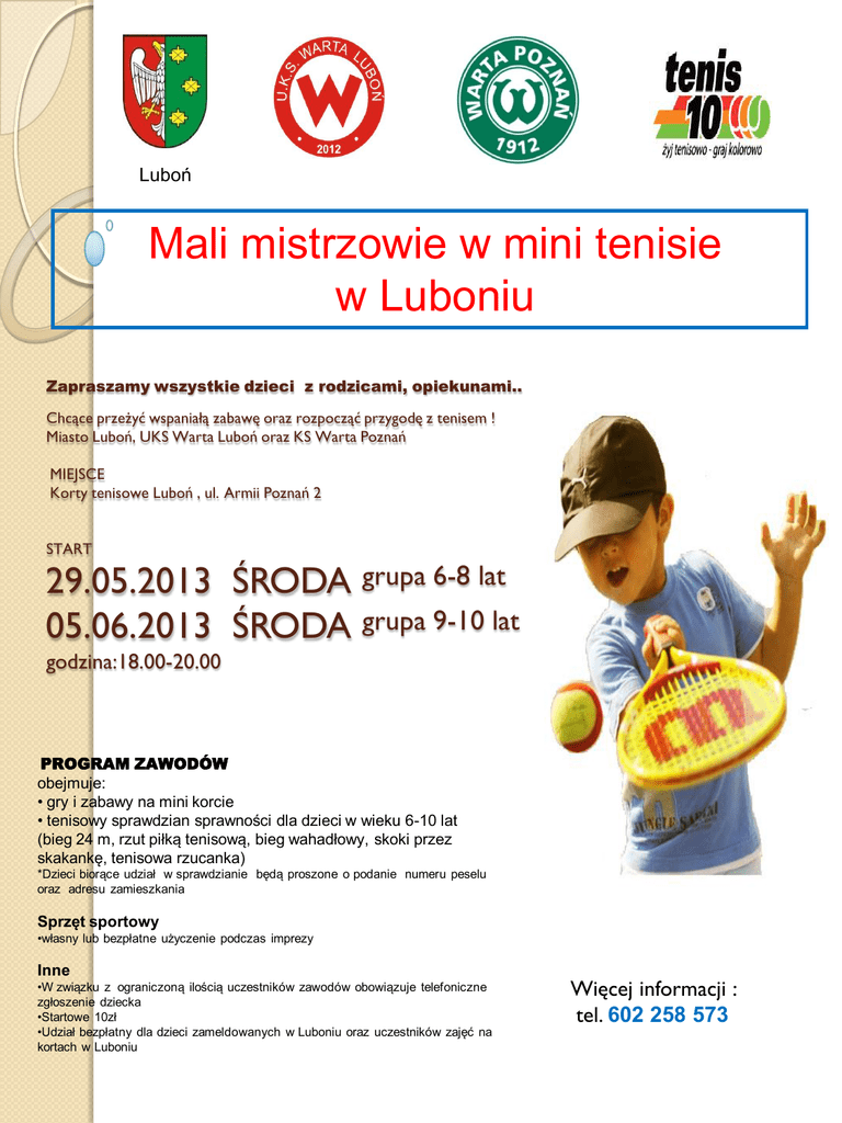 Luboń Mali mistrzowie w mini tenisie w Luboniu Zapraszamy wszystkie dzieci z rodzicami, opiekunami.. Chcące przeżyć wspaniałą zabawę oraz rozpocząć przygodę z tenisem ! Miasto Luboń, UKS Warta Luboń oraz KS Warta Poznań MIEJSCE Korty tenisowe Luboń , ul. Armii Poznań 2 START 29.05.2013 ŚRODA grupa 6-8 lat 05.06.2013 ŚRODA grupa 9-10 lat godzina:18.00-20.00 PROGRAM ZAWODÓW obejmuje: • gry i zabawy na mini korcie • tenisowy sprawdzian sprawności dla dzieci w wieku 6-10 lat (bieg 24 m, rzut piłką tenisową, bieg wahadłowy, skoki przez skakankę, tenisowa rzucanka) *Dzieci biorące udział w sprawdzianie będą proszone o podanie numeru peselu oraz adresu zamieszkania Sprzęt sportowy •własny lub bezpłatne użyczenie podczas imprezy Inne •W związku z ograniczoną ilością uczestników zawodów obowiązuje telefoniczne zgłoszenie dziecka •Startowe 10zł •Udział bezpłatny dla dzieci zameldowanych w Luboniu oraz uczestników zajęć na kortach w Luboniu Więcej informacji : tel. 602 258 573