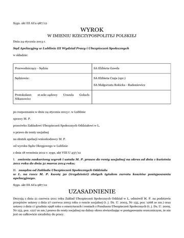 Sygn. akt III AUa 987/12 WYROK W IMIENIU RZECZYPOSPOLITEJ POLSKIEJ Dnia 24 stycznia 2013 r. Sąd Apelacyjny w Lublinie III Wydział Pracy i Ubezpieczeń Społecznych w składzie: Przewodniczący - Sędzia SA Elżbieta Gawda Sędziowie: SA Elżbieta Czaja (spr.) SA Małgorzata Rokicka - Radoniewicz Protokolant: Nikanowicz st.sekr.sądowy Urszula Goluch- po rozpoznaniu w dniu 24 stycznia 2013 r. w Lublinie sprawy M. P. przeciwko Zakładowi Ubezpieczeń Społecznych Oddziałowi w L. o prawo do renty socjalnej na skutek apelacji wnioskodawcy M. P. od wyroku Sądu Okręgowego w Lublinie z dnia 18 września 2012 r. sygn. akt VIII U 437/12 I. zmienia zaskarżony wyrok i ustala M. P. prawo do renty socjalnej na okres od dnia 1 kwietnia 2011 roku do dnia 31 marca 2014 roku; II. zasądza od Zakładu Ubezpieczeń Społecznych Oddziału w L. na rzecz M. P. kwotę 30 (trzydzieści) złotych tytułem zwrotu kosztów postępowania apelacyjnego. Sygn. akt III AUa 987/12 UZASADNIENIE Decyzją z dnia 21 czerwca 2011 roku Zakład Ubezpieczeń Społecznych Oddział w L. odmówił M. P. na podstawie przepisów ustawy z dnia 27 czerwca 2003 roku o rencie socjalnej (t. j. Dz. U. 2003, Nr 135, poz. 1268 ze zm.) oraz ustawy z dnia 17 grudnia 1998 roku o emeryturach i rentach z Funduszu Ubezpieczeń Społecznych (t. j. Dz. U. 2009, Nr 153, poz. 1227 ze zm.) prawa do renty socjalnej na dalszy okres stwierdzając w postępowaniu orzeczniczym, że nie jest on całkowicie niezdolny do pracy. W odwołaniu od tej decyzji wnioskodawca wniósł o jej zmianę i przyznanie mu prawa do renty socjalnej na dalszy okres. Podniósł, że stan jego zdrowia nie uległ poprawie, lecz pogorszył się. Ponadto Wojewódzki Zespół do spraw Orzekania o niepełnosprawności dnia 21 kwietnia 2008 roku zaliczył go do znacznego stopnia niepełnosprawności od urodzenia na stałe. Wyrokiem z dnia 18 września 2012 roku Sąd Okręgowy w Lublinie oddalił odwołanie. Podstawą wyroku były następujące ustalenia. Urodzony (...) M. P. w okresie od dnia 1 października 2003 roku do dnia 31 marca 2011 roku pobierał rentę socjalną. W dniu 3 marca 2011 roku złożył kolejny wniosek o prawo do renty socjalnej. Lekarz Orzecznik ZUS, po przebadaniu odwołującego się oraz zapoznaniu się z treścią dokumentacji lekarskiej w orzeczeniu z dnia 12 maja 2011 roku stwierdził, że wnioskodawca jest osobą całkowicie niezdolną do pracy do dnia 31 maja 2014 roku. Na skutek zgłoszonego zarzutu wadliwości, komisja lekarska rozpoznała u niego wysoką krótkowzroczność oka prawego i lewego, zwyrodnienie krótkowzroczne siatkówki oka prawego i lewego, stan po operacji odwarstwienia siatkówki oka prawego w 1997 roku, zaćmę powikłaną, , ślepotę oka prawego i orzeczeniem z dnia 17 czerwca 2011 roku stwierdziła, że wnioskodawca nie jest osobą niezdolną do pracy. W oparciu o powyższe orzeczenie organ rentowy decyzją z dnia 21 czerwca 2011 roku odmówił skarżącemu prawa do renty socjalnej. W celu ustalenia czy M. P. jest nadal całkowicie niezdolny do pracy z powodu naruszenia sprawności organizmu, które powstało przed ukończeniem 18 roku życia lub w trakcie nauki w szkole lub szkole wyższej przed ukończeniem 25 roku życia, Sąd Okręgowy dopuścił dowód z opinii biegłego lekarza sądowego z zakresu okulistyki. W opinii sporządzonej w dniu 8 listopada 2011 roku biegła okulista K. S. rozpoznała u odwołującego się zaćmę powikłaną oka prawego i lewego, stan po ablacji oka prawego, stan po cerclage oraz plombę oka prawego, wysoką krótkowzroczność oka prawego i lewego, garbiaka siatkówki oka lewego, zez zbieżny naprzemienny i uznała badanego za całkowicie niezdolnego do pracy począwszy od daty wstrzymania świadczenia na okres 3 lat. W uzasadnieniu biegła, po zbadaniu opiniowanego oraz po dokonaniu analizy dokumentacji medycznej zawartej w aktach sprawy wskazała, iż wnioskodawca posiada złą ostrość obu oczu do dali i do bliży. Z powodu zwyrodnienia krótkowzrocznego siatkówek istnieje ryzyko ich odwarstwienia i całkowitej utraty wzroku. W związku z tym przeciwwskazany jest duży wysiłek fizyczny. Zastrzeżenia do powyższej opinii złożył organ rentowy. Wskazał, że poziom kwalifikacji zawodowych - ukończone studium zawodowe medyczne i zawód masażysty pozwalają na świadczenie pracy zawodowej, a same czynności zawodowe nie wymagają posługiwania się narządem wzroku. Na rozprawie w dniu 24 stycznia 2012 roku wnioskodawca wskazał, iż od 1 stycznia 2012 roku nie pracuje, gdyż pracodawca nie przedłużył mu umowy W opinii sporządzonej w dniu 18 marca 2012 roku biegła specjalista medycyny pracy K. Z. rozpoznała u wnioskodawcy wysoką krótkowzroczność oka prawego i oka lewego, stan po ablacji oka prawego, stan pod cerclage oraz plombę oka prawego, garbiaka siatkówki oka lewego, zez zbieżny naprzemienny i stwierdziła brak całkowitej niezdolności do pracy, również w dniu 1 kwietnia 2011 roku. W uzasadnieniu biegła wskazała, że badany ukończył Medyczne Studium Zawodowe uzyskując zawód masażysty. Do 31 marca 2011 roku pobierał rentę socjalną. Wnioskodawca pracował w Ośrodku (...) w Ś. jako masażysta od kwietnia 2010 roku do grudnia 2011 roku. Od stycznia 2012pozostaje bez pracy. Biegła wskazała na ogólny, dobry stan odwołującego, który pozostaje w logicznym kontakcie, porusza się samodzielnie, sprawnie omija przeszkody, nie ma problemów z dojściem do stołka czy też do leżanki w gabinecie lekarskim. W badaniu fizykalnym wskazała, że wnioskodawca jest krążeniowo i oddechowo wydolny. Powołując się następnie na ustalenia dokonane przez biegłego sądowego z zakresu okulistyki, podniosła biegła, że odwołujący nie jest całkowicie niezdolny do pracy, gdyż poziom jego kwalifikacji zawodowych - zawód masażysty - umożliwia mu świadczenie pracy zawodowej w tym zawodzie. Wskazała, że wykonywanie czynności zawodowych masażysty nie wymaga pos