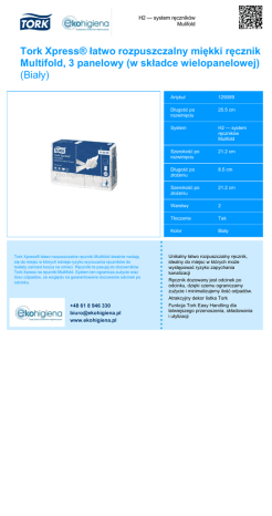 H2 — system ręczników Mulifold Tork Xpress® łatwo rozpuszczalny miękki ręcznik Multifold, 3 panelowy (w składce wielopanelowej) (Biały) Eko Higiena Sp. z o.o. Tork Xpress® łatwo rozpuszczalne ręczniki Multifold idealnie nadają się do miejsc w których istnieje ryzyko wyrzucania ręczników do toalety zamiast kosza na smieci. Ręczniki te pasują do dozowników Tork Xpress na ręczniki Multifold. System ten ogranicza zużycie oraz ilosc odpadów, ze względu na gwarantowane dozowanie odcinek po odcinku. +48 61 8 946 330 [email protected] www.ekohigiena.pl Artykuł 129089 Długość po rozwinięciu 25.5 cm System H2 — system ręczników Mulifold Szerokość po rozwinięciu 21.2 cm Długość po złożeniu 8.5 cm Szerokość po złożeniu 21.2 cm Warstwy 2 Tłoczenie Tak Kolor Biały Unikalny łatwo rozpuszczalny ręcznik, idealny do miejsc w których może występować ryzyko zapychania kanalizacji Ręcznik dozowany jest odcinek po odcinku, dzięki czemu ograniczamy zużycie i minimalizujemy ilość odpadów. Atrakcyjny dekor listka Tork Funkcja Tork Easy Handling dla łatwiejszego przenoszenia, składowania i utylizacji H2 — system ręczników Mulifold Informacje o opakowaniu Opakowanie pojedyncze Opakowanie transportowe Paleta EAN 7322540827804 7322540828511 7322540828528 Sztuki 200 4200 134400 Opakowania pojedyncze - 21 672 Wysokość 130 mm 212 mm 1846 mm Szerokość 85 mm 390 mm 800 mm Długość 212 mm 595 mm 1200 mm Objętość 2.3 dm3 49.2 dm3 1.6 m3 Waga netto 476 g 10 kg 319.69 kg Waga brutto 482 g 10.2 kg 326.3 kg Rodzaj opakowania Banderole Plastic - Dane środowiskowe 552108 Produkt jest wykonany z Pierwotnej masy celulozowej Opakowanie jest wykonane z papieru lub tworzywa sztucznego. Materiał Włókna pierwotne Pierwotne włókna celulozowe wytwarza się z drewna miękkiego lub twardego. Drewno poddawane jest procesom chemicznym i/lub mechanicznym, w ramach których oddziela się włókna celulozowe oraz usuwa ligninę i resztę pozostałości. Bielenie to proces czyszczenia włókien, którego celem jest uzyskanie jasnej masy włóknistej, a także określonego stopnia czystości włókien, który jest konieczny do spełnienia wymogów obowiązujących dla produktów higienicznych oraz niekiedy do sprostania wytycznym dotyczącym bezpiecznego kontaktu z żywnością. Obecnie wykorzystuje się różne metody bielenia: ECF (bez udziału chloru cząsteczkowego), w ramach której wykorzystuje się dwutlenek chloru) oraz TCF (całkowicie wolne od związków chloru), w ramach której wykorzystuje się ozon, tlen i nadtlenek wodoru. Wszystkie środki chemiczne (pomocnicze środki technologiczne oraz dodatki) ocenia się z punktu widzenia bezpieczeństwa i higieny pracy oraz ochrony środowiska, a także bezpieczeństwa produktów. Następujące dodatki pozwalają nam kontrolować wydajność produktów: 460005 552100 Alternatywne produkty 150299 Zawartość Środki chemiczne Wybierz dozownik 100288 100297 Certyfikaty produktu Kontakt Eko Higiena Sp. z o.o. Ul. Gipsowa 13, Sierosław 62-080 Tarnowo Podgórne, Tel.: +48 61 8 946 330 • Środki zwiększające wytrzymałość w stanie mokrym (w przypadku czyściw i ręczników do rąk) • Środki zwiększające wytrzymałość w stanie suchym (stosowane przy mechanicznej obróbce masy włóknistej do wytwarzania mocnych produktów, takich jak czyściwa) • W przypadku papierów kolorowych dodaje się barwniki i utrwalacze (w celu zachowania idealnej trwałości koloru) • W przypadku produktów z nadrukami stosuje się farby drukarskie (pigmenty z nośnikami i utrwalaczami) • W przypadku produktów wielowarstwowych korzystamy często z kleju wodorozpuszczalnego, który pozwala zachować integralność produktu Większość naszych zakładów nie stosuje jako dodatków rozjaśniaczy optycznych, które można jednak często znaleźć w papierze odzyskanym, ponieważ są one stosowane w papierze drukowym. W przypadku produktów AfH nie korzystamy ze zmiękczaczy. Wysoką jakość produktów zapewnia się dzięki systemom zarządzania jakością i higieną, które są wdrożone w procesy produkcyjne, magazynowe i transportowe. W celu zachowania stabilności procesu oraz jakości produktów proces produkcji papieru wspomagany jest poprzez zastosowanie następujących środków chemicznych / pomocniczych środków technologicznych: ◦ środki przeciwpieniące (środki powierzchniowo czynne i dyspergatory) ◦ środki do kontrolowania poziomu pH (wodorotlenek sodu i kwas siarkowy) ◦ środki pomocnicze wspomagające retencję (środki chemiczne, które pomagają tworzyć skupiska małych włókien w celu uniknięcia ich strat) ◦ powłoki chemiczne (dzięki którym możliwe jest kontrolowanie krepowania papieru, a tym samym zapewnianie jego miękkość i chłonność) Abyśmy mogli ponownie wykorzystywać braki maszynowe, stosujemy: Eko Higiena Sp. z o.o. ◾ środki ułatwiające roztwarzanie (środki chemiczne, które ułatwiają ponowne roztwarzanie papieru charakteryzującego się wytrzymałością w stanie mokrym) ◾ środki chemiczne do flokulacji (które pomagają usuwać farby drukarskie i wypełniacze z papieru odzyskanego) ◾ środki bielące (w celu zwiększenia jasności masy włóknistej wytwarzanej z papieru odzyskanego) W procesie oczyszczania ścieków, które wytwarzamy, stosujemy flokulanty i preparaty odżywcze, które zapewniają biologiczne oczyszczanie tych ścieków bez negatywnego wpływu naszych zakładów na jakość wody. Kontakt z żywnością Produkt nadaje się do wycierania powierzchni mających kontakt z żywnością oraz do krótkotrwałego kontaktu z żywnością. Etykiety ekologiczne Ten produkt posiada certyfikat ekologiczny EU Ecolabel. Opakowanie Spełnianie dyrektywy dotyczącej opakowań i odpadów opakowaniowych (94/62/WE): Tak Data opracowania artykułu i ostatnia korekta artykułu Data wydania: 2016-01-12 Data korekty: 2016-09-03 Produkcja Zniszczenie Ten produkt jest p