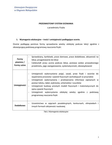 Gimnazjum Dwujęzyczne w Głogowie Małopolskim PRZEDMIOTOWY SYSTEM OCENIANIA z przedmiotu Fizyka 1. Wymagania edukacyjne – treści i umiejętności podlegające ocenie. Ocenie podlegają poniższe formy sprawdzenia wiedzy zdobytej podczas lekcji zgodnie z obowiązującą podstawą programową nauczania fizyki: Formy pisemne / Formy ustne - Umiejętności - Dodatkowo Sprawdziany, kartkówki, prace domowe, prace dodatkowe, aktywność na lekcji, przygotowanie do lekcji Całokształt pracy ucznia podczas lekcji, postawa wobec prowadzonego przedmiotu, jego zaangażowanie, systematyczność, obowiązkowość Umiejętność wykorzystania pojęć, zasad, praw fizyki i wzorów do wyjaśniania procesów i zjawisk fizycznych zachodzących w przyrodzie Umiejętność wykorzystania i przetwarzania informacji zapisanych w postaci tekstu, tabel, wykresów, schematów i rysunków Umiejętność budowy prostych modeli fizycznych i matematycznych do opisu zjawisk fizycznych Umiejętność wykorzystania zdobytej wiedzy zgodnie z podstawą programową nauczania fizyki Uczestnictwo w zajęciach pozalekcyjnych, konkursach, olimpiadach i innych formach aktywności naukowej Tab.1 Wymagania edukacyjne 1 Gimnazjum Dwujęzyczne w Głogowie Małopolskim 2. Kryteria oceniania Ocena Kryteria Celująca Uczeń, który posiada wiedzę znacznie wykraczającą poza obowiązujący program nauczania: - twórczo rozwija własne uzdolnienia - uczestniczy w zajęciach pozalekcyjnych - pomysłowo i oryginalnie rozwiązuje nietypowe zadania - osiąga wyniki prac pisemnych na poziomie powyżej 90% - rozwiązuje poprawnie zadania dodatkowe - bierze udział, osiąga sukcesy w konkursach i olimpiadach Bardzo dobra Uczeń, który opanował pełen zakres wiadomości przewidziany programem nauczania oraz potrafi: - samodzielnie rozwiązywać zadania - wykazać się znajomością definicji, praw i zasad fizyki oraz umiejętnością ich zastosowania w zadaniach - posługiwać się poprawnie językiem matematycznym i wzorami fizycznymi przy rozwiązywaniu zadań - samodzielnie zdobywać wiedzę - osiąga wyniki prac pisemnych na poziomie 90% i powyżej - przeprowadzać rozmaite rozumowania dedukcyjne Dobra Uczeń, który opanował wiadomości oraz umiejętności przewidziane podstawą programową nauczania fizyki oraz wybrane elementy programu nauczania, a także potrafi: 2 Gimnazjum Dwujęzyczne w Głogowie Małopolskim - samodzielnie rozwiązać typowe zadania wykazać się znajomością i rozumieniem poznanych pojęć, wzorów oraz praw fizyki posługiwać się językiem matematycznym przy rozwiązywaniu zadań osiąga wyniki prac pisemnych na poziomie 80% i powyżej przeprowadzać proste rozumowania dedukcyjne Dostateczna Uczeń, który opanował wiadomości oraz umiejętności przewidziane podstawą programową, co pozwala mu na: - wykazanie się znajomością podstawowych pojęć, wzorów oraz praw i zasad fizyki - stosowanie poznanych wzorów w rozwiązywaniu typowych ćwiczeń i zadań - osiąganie wyników prac pisemnych na poziomie 60% i powyżej - wykonywanie podstawowych i prostych obliczeń oraz przekształceń wzorów Dopuszczająca Uczeń, który opanował wiadomości i umiejętności przewidziane podstawą programową w takim zakresie, że potrafi: - samodzielnie bądź z niewielką pomocą nauczyciela wykonywać ćwiczenia, zadania o niewielkim stopniu trudności - wykazać się znajomością i rozumieniem najprostszych pojęć, wzorów oraz praw i zasad fizyki - osiąga wynik prac pisemnych na poziomie 41% i powyżej - wykazuje chęć współpracy z nauczycielem w celu uzupełnienia braków 3 Gimnazjum Dwujęzyczne w Głogowie Małopolskim Niedostateczna Uczeń, który nie opanował podstawowych umiejętności i wiadomości przewidzianych podstawą programową, czyli: - nie zna podstawowych definicji, wzorów, praw i zasad fizyki - nie potrafi zastosować obowiązującego materiału do rozwiązania prostych zadań - wyniki jego prac pisemnych są na poziomie niższym niż 40% - nie podejmuje prób nadrobienia zaległości - nie korzysta z możliwości konsultacji indywidualnych organizowanych przez nauczyciela Tab.2 Kryteria oceniania 3. Sposoby oceniania, częstotliwość, formy (ustne i pisemne), wagi ocen. Warunki poprawy oceny w ramach oceniania bieżącego. Wszystkie formy pisemne (pkt.1) sprawdzające umiejętności i wiedzę ucznia podlegają pod procentowy system oceniania: Próg procentowy 0% - 40% 41% - 59% 60% - 79% 80% - 89% 90% - 100% Zad. dodatkowe Ocena ndst dop dst db bdb cel Tab.3 Skala procentowa Wszystkie formy aktywności sprawdzające umiejętności i wiedzę ucznia podlegają pod plusowy i minusowy „+/-” system oceniania. Uzyskanie kolejno pięciu plusów, skutkuje otrzymaniem oceny bardzo dobrej, zaś uzyskanie kolejno pięciu minusów, skutkuje uzyskaniem oceny niedostatecznej. 4 Gimnazjum Dwujęzyczne w Głogowie Małopolskim +/+++++ +++++ +++-++--+----/----- Ocena bdb db dst dop ndst Tab.4 Skala plusowo-minusowa Ocena śródroczna i roczna jest średnią ważoną ocen cząstkowych uzyskanych przez ucznia. Średnia ważona poniżej 1,5 1,51 – 2,59 2,60 – 3,59 3,60 – 4,59 4,60 – 5,00 powyżej 5,01 Ocena ndst dop dst db bdb cel Tab.5 Średnia ważona Przy wystawianiu oceny śródrocznej i rocznej bierze się pod uwagę wszystkie oceny cząstkowe, zgodnie z przypisanymi wagami dla poszczególnych form sprawdzania wiedzy. Wagi poszczególnych elementów składających się na oceny cząstkowe: Elementy sprawdziany kartkówki odpowiedzi aktywność zad. domowe Waga 5 4 4 2 1 Tab.6 Wagi Częstotliwość przeprowadzonych form sprawdzania umiejętności i wiedzy ucznia, zależy od realizowanego programu nauczania i realizowanej siatki godzin zgodnie z zaplanowanym rozkładem materiału do realizacji podstawy programowej z fizyki. 5 Gimnazjum Dwujęzyczne w Głogowie Małopolskim Formy pisemne - Formy ustne - Warunki poprawy oceny - Nieprzygotowanie - Sprawdziany i inne formy pisemne są p
