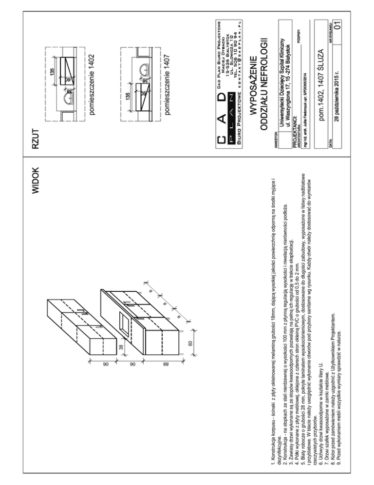06 06 60 38 a a a 1. Konstrukcja korpusu - ścinaki z płyty okleinowanej melaminą grubości 18mm, dającą wysokiej jakości powierzchnię odporną na środki myjące i dezynfekcyjne. 2. Konstrukcja - na stopkach ze stali nierdzewnej o wysokości 100 mm z płynną regulacją wysokości i niwelacją nierówności podłoża. 3. Zawiasy drzwi wykonane są ze stopów kwasoodpornych pozwalają na pełną ich regulację w trakcie eksploatacji. 4. Półki wykonane z płyty meblowej, oklejone z czterech stron okleiną PVC o grubości od 0,5 do 2 mm. 5. Blaty robocze o grubości 28 mm, pokryte laminatem wysokociśnieniowym, dostosowane do długości zabudowy, wyposażone w listwy nadblatowe i przyblatowe. W blacie należy uwzględnić wykonanie otworów pod przybory sanitarne wg rysunku. Każdy otwór należy dostosować do wymiarów rzeczywistych przyborów. 6. Uchwyty drzwi kwasoodporne w kształcie litery U. 7. Drzwi szafek wyposażone w zamki meblowe. 8. Kolor przed zamówieniem należy uzgodnić z Użytkownikiem Projektantem. 9. Przed wykonaniem mebli wszystkie wymiary sprawdzić w naturze. 88 pom.1402, 1407 ŚLUZA pomieszczenie 1407 pomieszczenie 1402 01