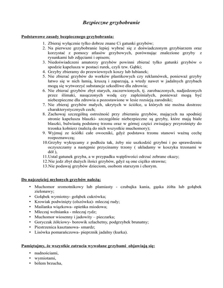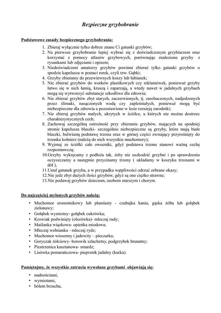 Bezpieczne grzybobranie Podstawowe zasady bezpiecznego grzybobrania: 1. Zbieraj wyłącznie tylko dobrze znane Ci gatunki grzybów; 2. Na pierwsze grzybobranie lepiej wybrać się z doświadczonym grzybiarzem oraz korzystać z pomocy atlasów grzybowych, porównując znalezione grzyby z rysunkami lub zdjęciami i opisem; 3. Niedoświadczeni amatorzy grzybów powinni zbierać tylko gatunki grzybów o spodzie kapelusza w postaci rurek, czyli tzw. Gąbki; 4. Grzyby zbieramy do przewiewnych koszy lub łubianek; 5. Nie zbierać grzybów do worków plastikowych czy reklamówek, ponieważ grzyby łatwo się w nich łamią, kruszą i zaparzają, a wtedy nawet w jadalnych grzybach mogą się wytworzyć substancje szkodliwe dla zdrowia; 6. Nie zbierać grzybów zbyt starych, zaczerwionych, tj. zarobaczonych, nadjedzonych przez ślimaki, nasączonych wodą czy zapleśniałych, ponieważ mogą być niebezpieczne dla zdrowia a pozostawione w lesie rozsieją zarodniki; 7. Nie zbieraj grzybów małych, ukrytych w ściółce, u których nie można dostrzec charakterystycznych cech; 8. Zachowaj szczególną ostrożność przy zbieraniu grzybów, mających na spodniej stronie kapelusza blaszki- szczególnie niebezpieczne są grzyby, które mają białe blaszki, bulwiastą podstawę trzonu oraz w górnej części zwisający przyrośnięty do trzonka kołnierz (należą do nich wszystkie muchomory); 9. Wyjmuj ze ściółki całe owocniki, gdyż podstawa trzonu stanowi ważną cechę rozpoznawczą; 10.Grzyby wykręcamy z podłoża tak, żeby nie uszkodzić grzybni i po sprawdzeniu oczyszczamy a następnie przycinamy trzony ( układamy w koszyku trzonami w dół ), 11.Ustal gatunek grzyba, a w przypadku wątpliwości odrzuć zebrane okazy; 12.Nie jedz zbyt dużych ilości grzybów, gdyż są one ciężko strawne; 13.Nie podawaj grzybów dzieciom, osobom starszym i chorym. Do najczęściej mylonych grzybów należą: • Muchomor sromotnikowy lub plamiasty - czubajka kania, gąska żółta lub gołąbek zielonawy; • Gołąbek wymiotny- gołąbek cukrówka; • Krowiak podwinięty (olszówka)- mleczaj rudy; • Maślanka wiązkowa- opieńka miodowa; • Mleczaj wełnianka - mleczaj rydz; • Muchomor wiosenny i jadowity – pieczarka; • Goryczak żółciowy- borowik szlachetny, podgrzybek brunatny; • Piestrzenica kasztanowa- smardz; • Lisówka pomarańczowa- pieprznik jadalny (kurka). Pamiętajmy, że wszystkie zatrucia wywołane grzybami objawiają się: • nudnościami, • wymiotami, • bólem brzucha, • biegunką, • podwyższoną temperaturą, • skurczem mięśni. Postępowanie przy podejrzeniu zatrucia grzybami: • Przy pierwszych objawach zatrucia jak: wymioty, biegunka które wystąpiły od zjedzenia grzybów po 3,6, a nawet 24 h (te ostatnie zatrucia są najgroźniejsze) należy zgłosić się do lekarza lub do szpitala! • Nie leczyć się domowymi sposobami! • Natychmiast sprowokować wymioty, poprzez wypicie ciepłej wody z solą (dorośli 200-300 ml, dzieci 100 ml wody lekko osolonej) i podrażnienie tylnej ściany gardła; • Zabezpieczyć ten materiał (wymiociny, popłuczyny) oraz resztki niespożytej potrawy i obierzyny do badania mikologicznego. Pozwoli to na precyzyjną diagnozę; • Wszystkie osoby, które jadły to samo danie, powinny poddać się kontroli lekarskiej, nawet jeśli (jeszcze) nie odczuwają żadnych dolegliwości; • Nie należy choremu podawać alkoholu oraz mleka (tłuszcze ułatwiają wchłanianie niektórych substancji toksycznych do krwi).
