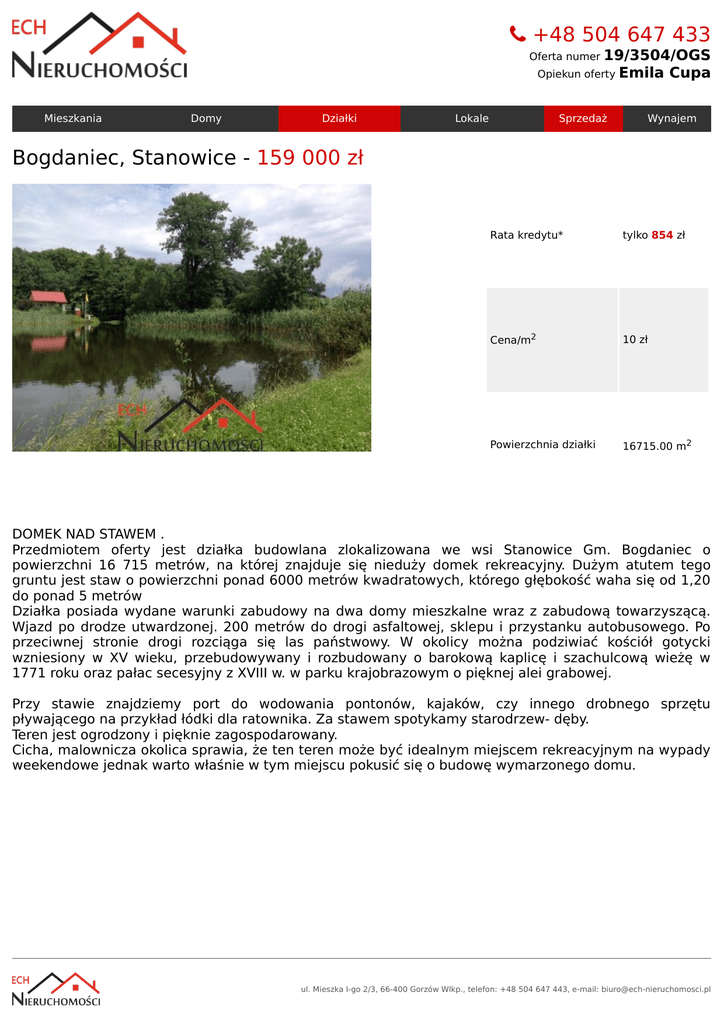 +48504647433 Ofertanumer19/3504/OGS OpiekunofertyEmilaCupa Mieszkania Domy Działki Lokale Sprzedaż Wynajem Bogdaniec,Stanowice-159000zł Ratakredytu* tylko854zł Cena/m2 10zł Powierzchniadziałki 16715.00m2 DOMEKNADSTAWEM. Przedmiotem oferty jest działka budowlana zlokalizowana we wsi Stanowice Gm. Bogdaniec o powierzchni 16 715 metrów, na której znajduje się nieduży domek rekreacyjny. Dużym atutem tego gruntujeststawopowierzchniponad6000metrówkwadratowych,któregogłębokośćwahasięod1,20 doponad5metrów Działka posiada wydane warunki zabudowy na dwa domy mieszkalne wraz z zabudową towarzyszącą. Wjazd po drodze utwardzonej. 200 metrów do drogi asfaltowej, sklepu i przystanku autobusowego. Po przeciwnej stronie drogi rozciąga się las państwowy. W okolicy można podziwiać kościół gotycki wzniesiony w XV wieku, przebudowywany i rozbudowany o barokową kaplicę i szachulcową wieżę w 1771rokuorazpałacsecesyjnyzXVIIIw.wparkukrajobrazowymopięknejaleigrabowej. Przy stawie znajdziemy port do wodowania pontonów, kajaków, czy innego drobnego sprzętu pływającegonaprzykładłódkidlaratownika.Zastawemspotykamystarodrzew-dęby. Terenjestogrodzonyipiękniezagospodarowany. Cicha,malowniczaokolicasprawia,żetenterenmożebyćidealnymmiejscemrekreacyjnymnawypady weekendowejednakwartowłaśniewtymmiejscupokusićsięobudowęwymarzonegodomu. ul.MieszkaI-go2/3,66-400GorzówWlkp.,telefon:+48504647443,e-mail:[email protected]