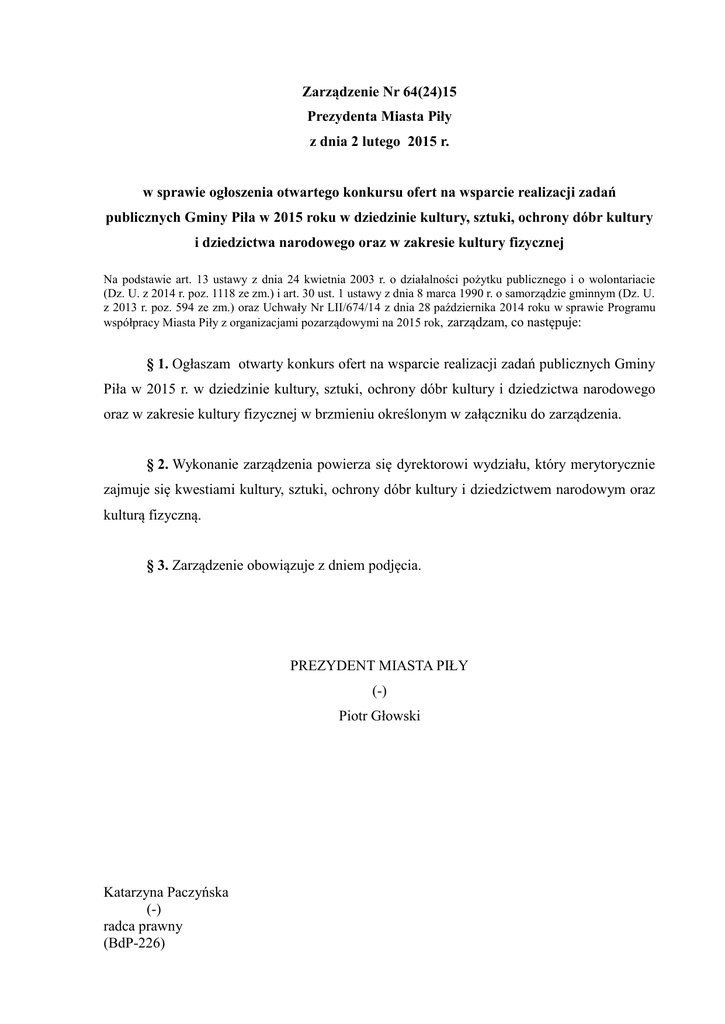 Zarządzenie Nr 64(24)15 Prezydenta Miasta Piły z dnia 2