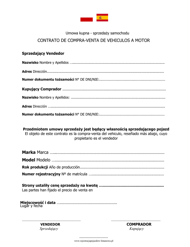 Umowa kupna - sprzedaży samochodu CONTRATO DE COMPRA-VENTA DE VEHICULOS A MOTOR Sprzedający Vendedor Nazwisko Nombre y Apellidos ….................................................................................. Adres Dirección......................................................................................................... Numer dokumentu tożsamości N° DE DNI/NIE:................................................................... Kupujący Comprador ............................................................................................ Nazwisko Nombre y Apellidos: .................................................................................... Adres Dirección …...................................................................................................... Numer dokumentu tożsamości N° DE DNI/NIE:.................................................................. Przedmiotem umowy sprzedaży jest będący własnością sprzedającego pojazd El objeto de este contrato es la compra-venta del vehiculo, reseñado más abajo, cuyo propietario es el vendedor Marka Marca ….................................................................................................. Model Modelo ….................................................................................................. Rok produkcji Año de producción........................................................................... Numer rejestracyjny Nº de matrícula …................................................................ Strony ustaliły cenę sprzedaży na kwotę ….................................................... Las partes han fijado el precio de venta en Miejscowość i data …................................................... Lugar y fecha ............................................................... VENDEDOR Sprzedający ..................................................... COMPRADOR Kupujący ----------------------www.rejestracjapojazdow-limanowa.pl