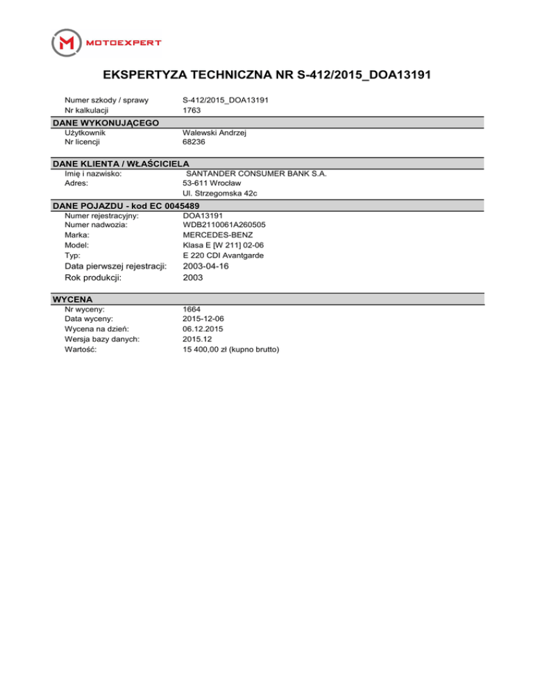 EKSPERTYZA TECHNICZNA NR S-412/2015_DOA13191 Numer szkody / sprawy Nr kalkulacji S-412/2015_DOA13191 1763 DANE WYKONUJĄCEGO Użytkownik Nr licencji Walewski Andrzej 68236 DANE KLIENTA / WŁAŚCICIELA Imię i nazwisko: Adres: SANTANDER CONSUMER BANK S.A. 53-611 Wrocław Ul. Strzegomska 42c DANE POJAZDU - kod EC 0045489 Numer rejestracyjny: Numer nadwozia: Marka: Model: Typ: DOA13191 WDB2110061A260505 MERCEDES-BENZ Klasa E [W 211] 02-06 E 220 CDI Avantgarde Data pierwszej rejestracji: Rok produkcji: 2003-04-16 2003 WYCENA Nr wyceny: Data wyceny: Wycena na dzień: Wersja bazy danych: Wartość: 1664 2015-12-06 06.12.2015 2015.12 15 400,00 zł (kupno brutto) Numer wyceny Data wyceny 1763 2015-12-06 Wycena na dzień Numer licencji / użytkownik 06.12.2015 68236 / Walewski Andrzej DANE SZKODY / SPRAWY Numer szkody / sprawy S-412/2015_DOA13191 DANE KLIENTA / WŁAŚCICIELA Imię i nazwisko Adres SANTANDER CONSUMER BANK S.A. 53-611 Wrocław Ul. Strzegomska 42c DANE POJAZDU - kod EC 0045489 Numer rejestracyjny / numer VIN Data pierwszej rejestracji / wiek w miesiącach Rok produkcji Przebieg rzeczywisty (km) / sposób ustalenia Lakier Liczba właścicieli Stan pojazdu Specjalne zabezpieczenia antykradzieżowe DOA13191 / WDB2110061A260505 2003-04-16 / 152 2003 325 980 / Odczytany złoty metalik Nie podano Poniżej przeciętnego NIE Marka Model Typ Rodzaj nadwozia / liczba drzwi / liczba miejsc Okres dostępności Pojemność silnika (ccm) Moc kW / KM Paliwo / katalizator Układ / liczba cylindrów Skrzynia / liczba biegów MERCEDES-BENZ Klasa E [W 211] 02-06 E 220 CDI Avantgarde Sedan / 4 / 5 2002-01-01 - 2006-05-31 2148 110 / 150 Diesel / Katalizator R/4 A/6 Zakup WYCENA POJAZDU Notowanie Eurotax (baza danych 2015.12) Wartość wyposażenia dealerskiego Wartość czynników obniżających wartość Korekta na stan opon PLN PLN PLN PLN 19 000 430 -3 800 -240 Wartość pojazdu (brutto) PLN 15 400 System wyceny wartości pojazdów EurotaxGlass's v20151120, nr wyceny 1763 1 /4 WYPOSAŻENIE STANDARDOWE POJAZDU ● ● ● ● ● ● ● ● ● ● ● ● ● ● ● ● ● ● ● ● 4/5 zagłówki Airbag 6 sztuk ASR BAS - asystent układu hamulcowego El. podnoszenie szyb, przód i tył Felgi aluminiowe 16 z ogumieniem Kierownica skórzana Klamki w kolorze nadwozia Lampy Bi-ksenonowe ze spryskiwaczami Lusterka boczne ogrzewane Lusterka zewnętrzne - asferyczne Napinacze pasów bezpieczeństwa Podgrzewane dysze spryskiwaczy Radio MB Audio 20 CC SBC - Elektrohydrauliczny układ hamulcowy Szyby barwione Tempomat Tylne zagłówki składane elektrycznie Wspomaganie układu kierowniczego Zderzaki i lusterka w kolorze nadwozia ● ● ● ● ● ● ● ● ● ● ● ● ● ● ● ● ● ● ● ABS Alarm ASSYST - system aktywnego serwisowania pojazdu Czujnik deszczu ESP - układ stabilizacji toru jazdy Immobilizer Kierownica wielofunkcyjna Klimatyzacja automatyczna Listwy boczne w kolorze nadwozia Lusterka boczne regulowane elektrycznie Mech. regulacja położenia kierownicy Obrotomierz Przedni podłokietnik Regulacja wysokości pasów bezpieczeństwa Speedtronic - ogranicznik predkości jazdy Światła przeciwmgielne Termometr zewnętrzny Tylny podłokietnik Zamek centralny Zakup WYPOSAŻENIE DODATKOWE - DEALERSKIE ● ● ● ● Klimatyzacja komfortowa - Thermotronic PLN 90 Lakier metalik PLN 90 Tapicerka skórzana PLN 210 Zmieniarka płyt CD PLN 40 PLN 430 SUMA Zakup CZYNNIKI OBNIŻAJĄCE WARTOŚĆ ● Ślady wcześniejszych napraw lakierniczych (-5%) ● Konieczność naprawy pojazdu (-15%) PLN PLN -950 -2 850 SUMA PLN -3 800 Zakup OPONY Oś 1, Opona 1 (lewa), KLEBER, 205/55R16 Nominalna głębokość bieżnika [mm]: Rzeczywista głębokość bieżnika [mm]: Zużycie [%]: Obniżka na zniszczenie [%]: Wartość (brutto) Oś 1, Opona 2 (prawa), KLEBER, 205/55R16 Nominalna głębokość bieżnika [mm]: Rzeczywista głębokość bieżnika [mm]: Zużycie [%]: Obniżka na zniszczenie [%]: Wartość (brutto) 8 4 66 0 PLN -60 PLN -60 8 4 66 0 System wyceny wartości pojazdów EurotaxGlass's v20151120, nr wyceny 1763 2 /4 Oś 2, Opona 1 (lewa), HANKOOK, 205/55R16 Nominalna głębokość bieżnika [mm]: Rzeczywista głębokość bieżnika [mm]: Zużycie [%]: Obniżka na zniszczenie [%]: Wartość (brutto) Oś 2, Opona 2 (prawa), HANKOOK, 205/55R16 Nominalna głębokość bieżnika [mm]: Rzeczywista głębokość bieżnika [mm]: Zużycie [%]: Obniżka na zniszczenie [%]: Wartość (brutto) 8 4 66 0 PLN -60 PLN -60 PLN -240 8 4 66 0 SUMA NOTATKI Notatka do wyceny: OCENA STANU TECHNICZNEGO POJAZDU. Do oceny przedstawiono pojazd kompletny. Oględzin pojazdu dokonano na terenie parkingu firmy DAWRO we Wrocławiu, ul. Wodzisławska 8. W czasie oględzin dokonano jazdy próbnej (próby ruchowej) po terenie parkingu – w ograniczonym zakresie – przekładnia kierownicza uszkodzona. W czasie oględzin stwierdzono: Brak książki serwisowej. Wg wskazań komputera pokładowego – termin serwisu D przekroczony o 6 085 km. SILNIK/UKŁAD PRZENIESIENIA NAPĘDU: Silnik wraz z osprzętem kompletny, bez widocznych braków i uszkodzeń mechanicznych. Silnik wraz z komorą silnikową - brudny, drobne zapocenia w miejscach uszczelnień. Silnik uruchomiono przy użyciu zasilania zewnętrznego – akumulator pojazdu całkowicie rozładowany. Niski poziom oleju silnikowego. Kontrolka „check engine” świecąca stale podczas pracy silnika. Próbę ruchową podjęto w zakresie prędkości obrotowej biegu 1. – układ kierowniczy uszkodzony. Konieczność weryfikacji w warunkach serwisowych. PODWOZIE: Podzespoły podwozia kompletne, bez widocznych braków. Stwierdzono stuki podczas pracy zawieszenia. Konieczność weryfikacji w warunkach serwisowych. UKŁAD KIEROWNICZY: Zawieszenie przednie uszkodzone – geometria nieprawidłowa, koła zbieżne. Konieczność weryfikacji w warunkach serwisowych. UKŁAD HAMULCOWY: Wg wskazań komputera pokładowego – „ESP niedostępne”. Konieczność weryfikacji w warunkach serwiso