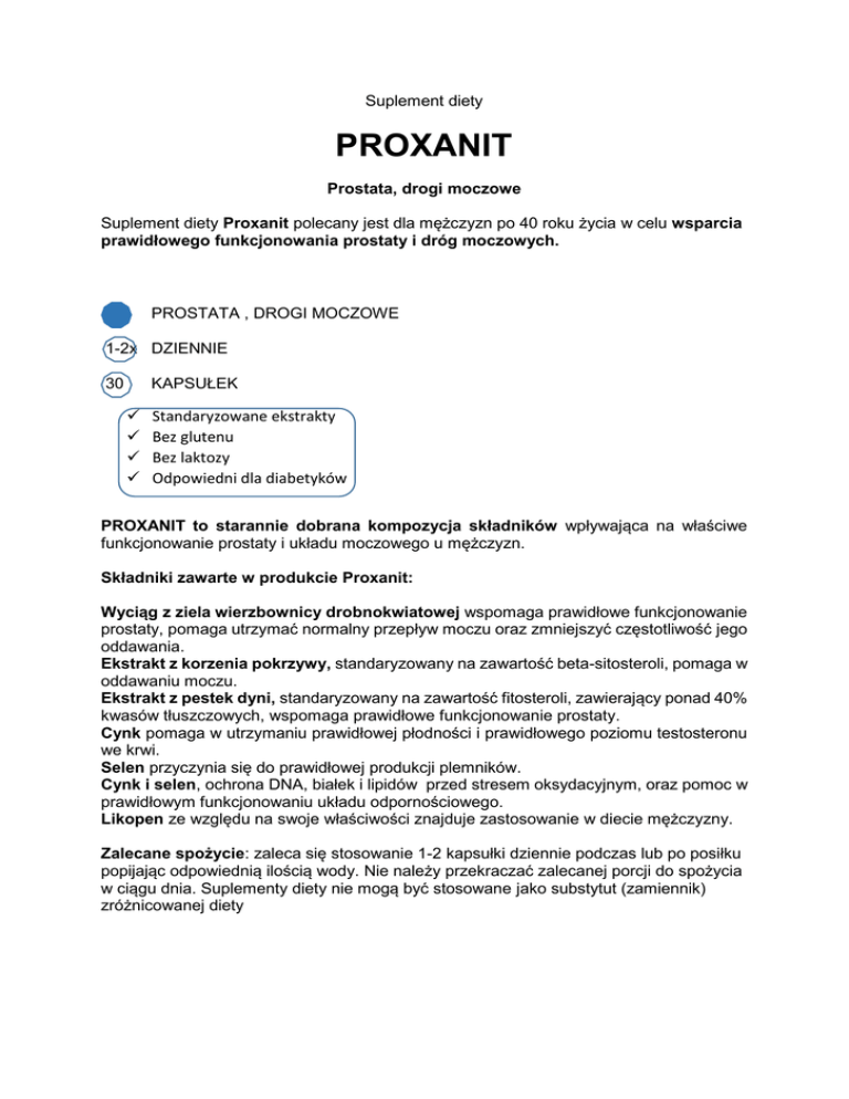 Suplement diety PROXANIT Prostata, drogi moczowe Suplement diety Proxanit polecany jest dla mężczyzn po 40 roku życia w celu wsparcia prawidłowego funkcjonowania prostaty i dróg moczowych. PROSTATA , DROGI MOCZOWE 1-2x DZIENNIE KAPSUŁEK 30 Standaryzowane ekstrakty Bez glutenu Bez laktozy Odpowiedni dla diabetyków PROXANIT to starannie dobrana kompozycja składników wpływająca na właściwe funkcjonowanie prostaty i układu moczowego u mężczyzn. Składniki zawarte w produkcie Proxanit: Wyciąg z ziela wierzbownicy drobnokwiatowej wspomaga prawidłowe funkcjonowanie prostaty, pomaga utrzymać normalny przepływ moczu oraz zmniejszyć częstotliwość jego oddawania. Ekstrakt z korzenia pokrzywy, standaryzowany na zawartość beta-sitosteroli, pomaga w oddawaniu moczu. Ekstrakt z pestek dyni, standaryzowany na zawartość fitosteroli, zawierający ponad 40% kwasów tłuszczowych, wspomaga prawidłowe funkcjonowanie prostaty. Cynk pomaga w utrzymaniu prawidłowej płodności i prawidłowego poziomu testosteronu we krwi. Selen przyczynia się do prawidłowej produkcji plemników. Cynk i selen, ochrona DNA, białek i lipidów przed stresem oksydacyjnym, oraz pomoc w prawidłowym funkcjonowaniu układu odpornościowego. Likopen ze względu na swoje właściwości znajduje zastosowanie w diecie mężczyzny. Zalecane spożycie: zaleca się stosowanie 1-2 kapsułki dziennie podczas lub po posiłku popijając odpowiednią ilością wody. Nie należy przekraczać zalecanej porcji do spożycia w ciągu dnia. Suplementy diety nie mogą być stosowane jako substytut (zamiennik) zróżnicowanej diety Skład zalecanej do spożycia dziennej porcji: Składnik ekstrakt z wierzbownicy drobnokwiatowej ekstrakt z korzenia pokrzywy ekstrakt z pestek dyni ekstrakt z pomidora - likopen cynk selen *RWS- Referencyjna Wartość Spożycia 1 kapsułka 300 mg 100 mg 50 mg 1 mg 5 mg 27,5µg 2 kapsułki 600 mg 200 mg 100 mg 2 mg 10 mg 55 µg % RWS* 50/100 50/100 Składniki: ekstrakt z wierzbownicy drobnokwiatowej; żelatyna; ekstrakt z korzenia pokrzywy; ekstrakt z pestek dyni; celuloza mikrokrystaliczna; glukonian cynku; ekstrakt z pomidora- likopen 15%; sole magnezowe kwasów tłuszczowych (stearynian magnezu); Lselenometionina 0,5%; tlenek żelaza czerwony; dwutlenek krzemu; dwutlenek tytanu. Ostrzeżenia: Nie stosować w przypadku nadwrażliwości (uczulenia) na którykolwiek ze składników produktu. Należy pamiętać, że istotne znaczenie mają zrównoważony sposób żywienia i zdrowy tryb życia. Warunki przechowywania: Produkt przechowywać w temperaturze poniżej 25°C. Chronić przed światłem i wilgocią. Suplementy diety powinny być przechowywane w sposób niedostępny dla małych dzieci. Zawartość opakowania: Opakowanie zawiera 30 kapsułek po 0,668 g Masa netto: 20,04 g Producent: TREE PHARMA SP. Z O.O. UL. STRZESZYŃSKA 33 60-479 POZNAŃ