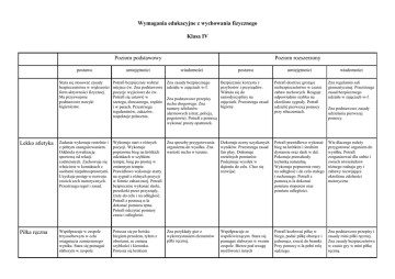 Wymagania edukacyjne z wychowania fizycznego Klasa IV Poziom podstawowy Poziom rozszerzony postawa umiejętności wiadomości Stara się stosować zasady bezpieczeństwa w większości form aktywności fizycznej. Ma przyswojone podstawowe nawyki higieniczne. Potrafi bezpiecznie wybrać miejsce ćw. Zna podstawowe pozycje wyjściowe do ćw. Potrafi się ustawić w szeregu, dwuszeregu, rzędzie i w parach. Przestrzega regulaminów, zakazów, respektuje polecenia. Zna zasady bezpiecznego udziału w zajęciach w-f. Lekko atletyka Zadania wykonuje rzetelnie i z pełnym zaangażowaniem. Oddziela rywalizację sportową od relacji codziennych. Zachowuje się właściwie w kontaktach z osobami niepełnosprawnymi. Uzyskuje postęp w rozwoju swoich cech motorycznych. Przestrzega reguł i zasad. Wykonuje start z różnych pozycji. Wykonuje poprawnie bieg na krótkich odcinkach w szybkim tempie, bieg po prostej w zmiennym tempie. Prawidłowo wykonuje starty na sygnał z różnych pozycji w formie zabawowej. Potrafi bezpiecznie wykonać skoki, przeskoki przez przyrządy, rzuty do celu i na odległość. Potrafi z pomocą n-la dokonać pomiaru tętna. Potrafi odczytać pomiary czasu i odległości. Piłka ręczna Współpracuje w zespole trzyosobowym w celu osiągnięcia zamierzonego wyniku. Stara się pomagać słabszym w zespole. Porusza się po boisku biegiem przodem, tyłem z obrotami, ze zmianą szybkości i kierunku. Porusza się krokiem postawa umiejętności wiadomości Bezpiecznie korzysta z przyborów i przyrządów. Wdraża się do samodyscypliny na zajęciach. Przestrzega zasad higieny. Potrafi dostrzec grożące niebezpieczeństwo w czasie zabaw ruchowych. Reaguje odpowiednio szybko na określone sygnały. Potrafi udzielić pierwszej pomocy przy stłuczeniach. Zna regulamin sali gimnastycznej. Przestrzega zasad bezpiecznego udziału w zajęciach w-f. Zna sposoby przygotowania organizmu do wysiłku. Zna wartość ruchu w terenie. Dokonuje oceny uzyskanych wyników. Przestrzega zasad fair play. Dokonuje rzetelnych pomiarów. Podejmuje wysiłek w dążeniu do celu. Chce się rozwijać. Potrafi prawidłowo wykonać bieg na krótkim i średnim dystansie oraz skok w dal. Pokonuje przeszkody techniką naturalną. Wykonuje poprawnie rzuty na odległość i do celu stałego i ruchomego. Potrafi z pomocą n-la dokonać pomiaru stoperem oraz pomiaru odległości. Wie dlaczego należy przygotować organizm do wysiłku. Potrafi zorganizować dla siebie i swoich rówieśników różnego rodzaju gry i zabawy rozwijające określone zdolności motoryczne. Zna przykłady gier z wykorzystaniem elementów piłki ręcznej. Współpracuje ze współćwiczącym. Stara się pomagać słabszym w swoim zespole. Bierze pod uwagę możliwości innych Potrafi kozłować piłkę w biegu, podać piłkę oburącz i jednorącz, rzucić do bramki. Przy pomocy n-la pełni rolę sędziego. Zna podstawowe przepisy i zasady mini piłki ręcznej. Zna zasady bezpieczeństwa w czasie gry w mini piłkę ręczną. Zna podstawowe przepisy ruchu drogowego. Zna numery telefonów alarmowych (straż, policja, pogotowie). Potrafi z pomocą wykonać prosty opatrunek. Zna podstawowe zasady udzielania pierwszej pomocy. współćwiczących. Właściwie zachowuje się w dostawnym. Wykonuje roli kibica. Stosuje zasadę poprawnie podanie i chwyt fair play w czasie gier zabaw. półgórny w miejscu. Podaje piłkę w przód, w tył, w prawo, w lewo. Kozłuje piłkę w miejscu i w ruchu. Gimnastyka Aktywnie uczestniczy w zajęciach, ćw. wykonuje rzetelnie i z pełnym zaangażowaniem. Stara się w czasie ćw. stosować asekurację i samoasekurację. W miarę swoich możliwości wykonuje poprawnie podstawowe ćw. gimnastyczne. Prawidłowo wykonuje przewroty w tył z siadu skulonego i w przód przysiadu do przysiadu, naskok kuczny na skrzynię (3 cz.), leżenie przewrotne i przerzutne. Koszykówka Współpracuje w zespole dwuosobowym w celu osiągnięcia zamierzonego wyniku. Podporządkowuje się przepisom i regułom. Właściwie zachowuje się w roli kibica. Stosuje zasadę fair play w czasie gier zabaw. Sporty zimowe Hartuje swój organizm podczas zajęć na śniegu. Aktywnie uczestniczy w zajęciach. Przestrzega ustalonych reguł w celu zapewnienia bezpieczeństwa. Zna pozycje wyjściowe do ćw. Zna podstawowe zasady bezpieczeństwa w czasie wykonywania ćw. gimnastycznych i stara się o nie w czasie wykonywania ćw. Stosuje asekurację. Udziela pomocy partnerowi w wykonywaniu ćw. Potrafi przygotować zestaw ćw. do krótkiej ogólnej rozgrzewki. Wykonuje dokładnie ćw. wg instrukcji słownej. Wykonuje przewrót w przód z marszu, w tył z przysiadu podpartego. Potrafi wykonać mostek z leżenia tyłem. Z pomocą wykonuje podpory przodem i tyłem, półzwisy i zwisy. Opanowane elementy sków, przeskoków, przewrotów stosuje w różnych sytuacjach ruchowych. Wie jak dobrać ćw. kształtujące podstawowe zdolności ruchowe. Potrafi z pomocą n-la zaasekurować współpartnera w czasie ćw. Wie jak przygotować organizm do wysiłku. Porusza się po boisku Zna przykłady gier z biegiem przodem, tyłem z wykorzystaniem elementów piłki koszykowej. obrotami, ze zmianą szybkości i kierunku. Porusza się krokiem dostawnym. Wykonuje poprawnie podanie i chwyt półgórny w miejscu. Podaje piłkę w przód, w tył, w prawo, w lewo. Kozłuje piłkę w miejscu i w ruchu. Podaje piłkę oburącz znad głowy. Wykonuje rzut oburącz sprzed klatki piersiowej do kosza. Współpracuje ze współćwiczącym. Stara się pomagać słabszym w swoim zespole. Bierze pod uwagę możliwości innych współćwiczących. Potrafi kozłować piłkę w biegu, podać piłkę oburącz i jednorącz, rzucić do kosza. Wykonuje rzut do kosza z marszu i po kozłowaniu. Wykorzystuje zdobyte umiejętności w mini grze. Zna podstawowe przepisy i zasady mini koszykówki. Zna zasady bezpieczeństwa w czasie gry w mini koszykówkę. Rozpoznaje pozytywne czynniki wpływające na dob