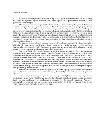 Szanowni Państwo, Bytomskie Przedsiębiorstwo Komunalne Sp. z o.o. pragnie poinformować, że od 1 lutego 2012 roku w Bytomiu będzie obowiązywała nowa opłata za odprowadzanie ścieków – wód opadowych i roztopowych. Zdajemy sobie sprawę z tego, że Państwa budżety domowe zostaną obciążone dodatkowymi kosztami, których do tej pory nie ponosiliście. Niestety, wprowadzenie nowej opłaty to dla nas konieczność i obowiązek. Eksploatacja bowiem całego systemu odprowadzania wód opadowych i roztopowych wymaga dużych nakładów finansowych, ponieważ system ten jest w bardzo złym stanie. Na terenie miasta dochodzi więc do zalań i podtopień nieruchomości – podwórek, piwnic, a nawet garaży. Tworzą się rozlewiska utrudniające mieszkańcom życie. Sieć jest mocno wyeksploatowana, wymaga czyszczenia, modernizacji, bieżącego utrzymania, a także rozbudowy. Środki finansowe są potrzebne, by system mógł prawidłowo funkcjonować, a problem podtapianych piwnic i podwórek mógł zostać rozwiązany. Tymczasem prawo zabrania utrzymywania sieci kanalizacji deszczowej i innych urządzeń odbierających „deszczówkę” ze środków, które pozyskujemy z opłat za wodę i ścieki sanitarne. Musimy więc zabezpieczyć środki finansowe przeznaczone na utrzymanie sieci odbierającej wody opadowe i roztopowe oraz zrealizowanie niezbędnych inwestycji. Jeszcze w 2004 roku zapadła decyzja o wejściu miasta w projekt „Poprawa gospodarki wodno-ściekowej na terenie gminy Bytom”. Skutkiem jest to, że dzisiaj Bytomskie Przedsiębiorstwo Komunalne ma pod swoją opieką cały system odbierania wód opadowych i roztopowych, a także realizuje wszystkie obowiązki, które się z tym wiążą. Posiadamy między innymi ok. 273 km sieci odbierających „deszczówkę”. Jednocześnie BPK cały czas ponosi bardzo wysokie koszty realizacji „Poprawy gospodarki wodno-ściekowej na terenie gminy Bytom”. Inwestycja kosztowała ponad 91 mln euro. Z tego ponad 49,5 mln euro stanowiło dofinansowanie z Unii Europejskiej. Reszta to środki własne firmy i kredyty, które stanowią ponad 54% kosztów inwestycji, a które trzeba było zaciągnąć. Dzisiaj te kredyty trzeba spłacać. Zapewniamy Państwa, że wszystkie pozyskane z nowej opłaty środki zostaną przeznaczone tylko i wyłącznie na utrzymanie sieci, które odbierają „deszczówkę” oraz niezbędne inwestycje w tym zakresie. Jeszcze raz podkreślamy, że wprowadzenie nowej opłaty było koniecznością, więc wzorem innych miast (m. in. Tarnowskie Góry, Żory, Wrocław, Poznań) podjęliśmy trudną decyzję o ustaleniu stawki za odprowadzanie wód opadowych i roztopowych do naszych urządzeń. Prosimy o wyrozumiałość, ponieważ przy jej podejmowaniu kierowaliśmy się tylko i wyłącznie myślą o tym, byście Państwo mogli korzystać ze sprawnych sieci.