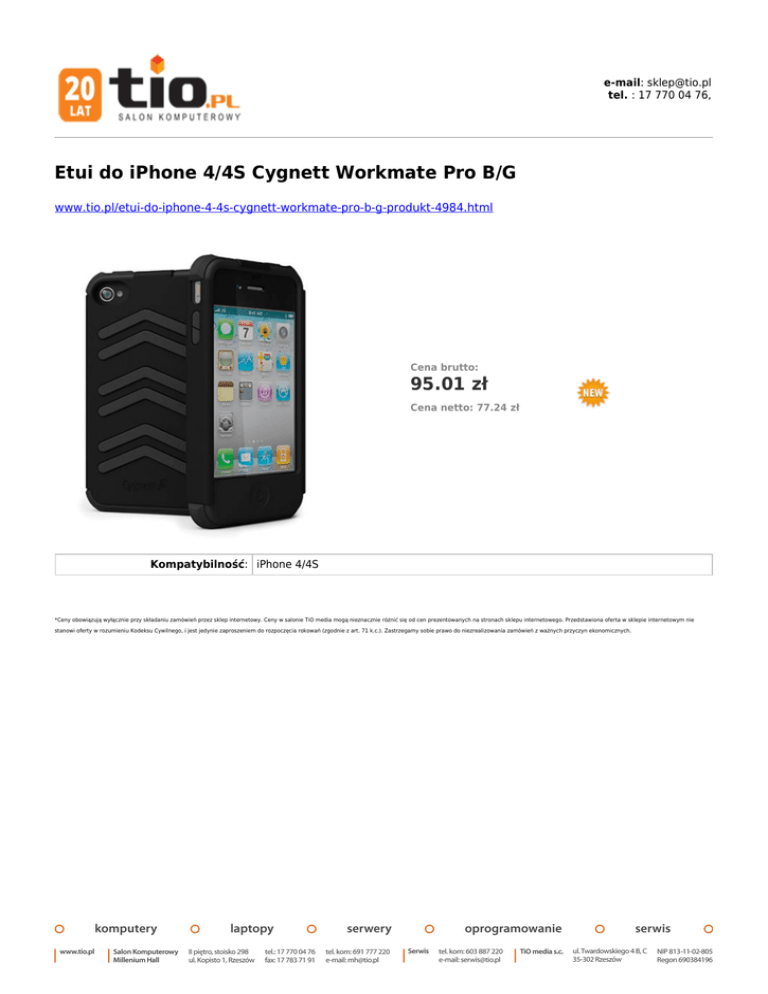 e-mail: [email protected] tel. : 17 770 04 76, Etui do iPhone 4/4S Cygnett Workmate Pro B/G www.tio.pl/etui-do-iphone-4-4s-cygnett-workmate-pro-b-g-produkt-4984.html Cena brutto: 95.01 zł Cena netto: 77.24 zł Kompatybilność: iPhone 4/4S *Ceny obowiązują wyłącznie przy składaniu zamówień przez sklep internetowy. Ceny w salonie TiO media mogą nieznacznie różnić się od cen prezentowanych na stronach sklepu internetowego. Przedstawiona oferta w sklepie internetowym nie stanowi oferty w rozumieniu Kodeksu Cywilnego, i jest jedynie zaproszeniem do rozpoczęcia rokowań (zgodnie z art. 71 k.c.). Zastrzegamy sobie prawo do niezrealizowania zamówień z ważnych przyczyn ekonomicznych.