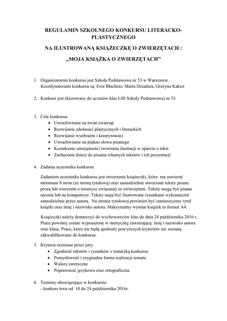 REGULAMIN SZKOLNEGO KONKURSU LITERACKOPLASTYCZNEGO NA ILUSTROWANĄ KSIĄŻECZKĘ O ZWIERZĘTACH : „MOJA KSIĄŻKA O ZWIERZĘTACH” 1. Organizatorem konkursu jest Szkoła Podstawowa nr 53 w Warszawie. Koordynatorami konkursu są: Ewa Błachnio, Marta Dziadura, Grażyna Kakiet 2. Konkurs jest skierowany do uczniów klas I-III Szkoły Podstawowej nr 53 3. Cele konkursu: Uwrażliwienie na świat zwierząt Rozwijanie zdolności plastycznych i literackich Rozwijanie wyobraźni i kreatywności Uwrażliwianie na piękno słowa pisanego Kształcenie umiejętności tworzenia ilustracji w oparciu o tekst Zachęcenie dzieci do pisania własnych tekstów i ich prezentacji 4. Zadania uczestnika konkursu Zadaniem uczestnika konkursu jest stworzenie książeczki, która ma zawierać minimum 8 stron (ze stroną tytułową) oraz samodzielnie stworzone teksty pisane prozą lub wierszem o tematyce związanej ze zwierzętami. Teksty mogą być pisane ręcznie lub na komputerze. Teksty mają być ilustrowane rysunkami wykonanymi samodzielnie przez autora. Na stronie tytułowej powinien być zamieszczony tytuł książki oraz imię i nazwisko autora. Maksymalny wymiar książek to format A4. Książeczki należy dostarczyć do wychowawców klas do dnia 24 października 2016 r.. Prace powinny zostać wyposażone w metryczkę zawierającą: imię i nazwisko autora oraz klasę. Prace, które nie będą spełniały powyższych kryteriów nie zostaną zakwalifikowane do konkursu. 5. Kryteria oceniane przez jury: Zgodność tekstów i rysunków z tematyką konkursu Pomysłowość i oryginalna forma realizacji tematu Walory estetyczne Poprawność językowa oraz ortograficzna 6. Terminy obowiązujące w konkursie: - konkurs trwa od 10 do 24 października 2016r. - rozstrzygnięcie konkursu, ogłoszenie wyników i wręczenie nagród nastąpi podczas spotkania z lekarzem weterynarii. 7. Dla autorów najlepszych prac przewidziane są nagrody rzeczowe oraz dyplomy. Nagrodzone prace zostaną opublikowane na stronie internetowej szkoły.