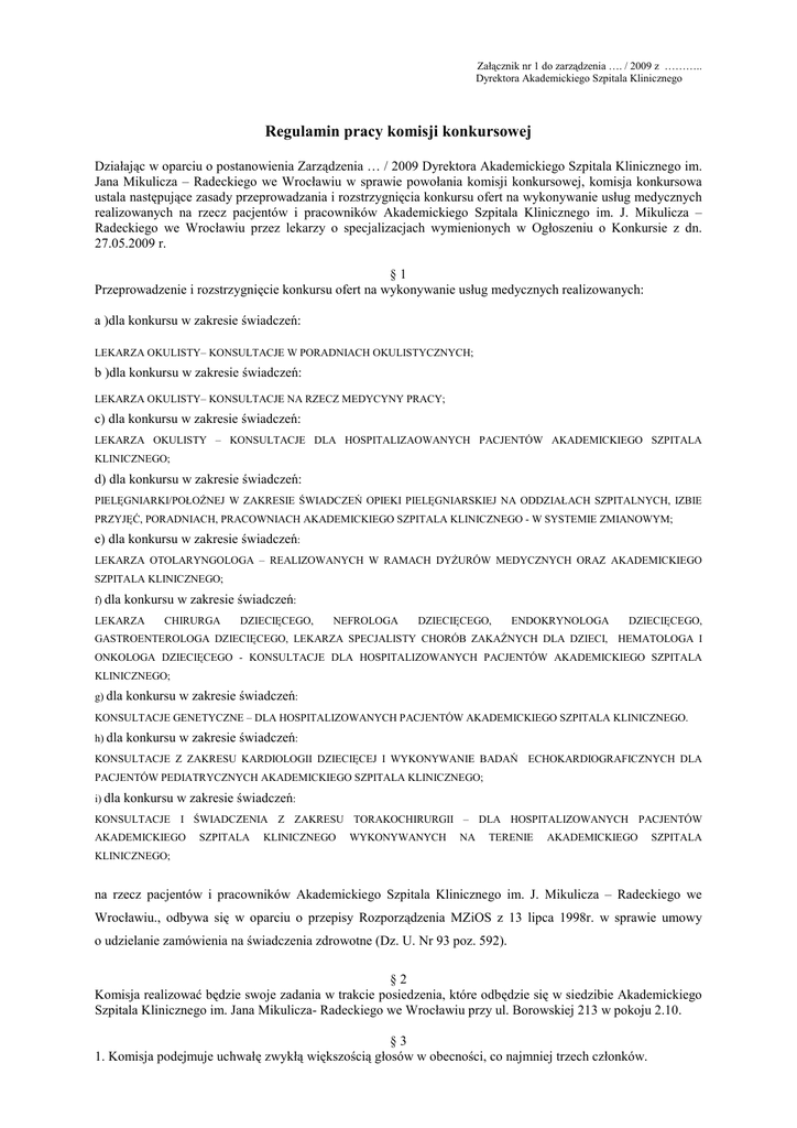 Załącznik nr 1 do zarządzenia …. / 2009 z ……….. Dyrektora Akademickiego Szpitala Klinicznego Regulamin pracy komisji konkursowej Działając w oparciu o postanowienia Zarządzenia … / 2009 Dyrektora Akademickiego Szpitala Klinicznego im. Jana Mikulicza – Radeckiego we Wrocławiu w sprawie powołania komisji konkursowej, komisja konkursowa ustala następujące zasady przeprowadzania i rozstrzygnięcia konkursu ofert na wykonywanie usług medycznych realizowanych na rzecz pacjentów i pracowników Akademickiego Szpitala Klinicznego im. J. Mikulicza – Radeckiego we Wrocławiu przez lekarzy o specjalizacjach wymienionych w Ogłoszeniu o Konkursie z dn. 27.05.2009 r. §1 Przeprowadzenie i rozstrzygnięcie konkursu ofert na wykonywanie usług medycznych realizowanych: a )dla konkursu w zakresie świadczeń: LEKARZA OKULISTY– KONSULTACJE W PORADNIACH OKULISTYCZNYCH; b )dla konkursu w zakresie świadczeń: LEKARZA OKULISTY– KONSULTACJE NA RZECZ MEDYCYNY PRACY; c) dla konkursu w zakresie świadczeń: LEKARZA OKULISTY – KONSULTACJE DLA HOSPITALIZAOWANYCH PACJENTÓW AKADEMICKIEGO SZPITALA KLINICZNEGO; d) dla konkursu w zakresie świadczeń: PIELĘGNIARKI/POŁOśNEJ W ZAKRESIE ŚWIADCZEŃ OPIEKI PIELĘGNIARSKIEJ NA ODDZIAŁACH SZPITALNYCH, IZBIE PRZYJĘĆ, PORADNIACH, PRACOWNIACH AKADEMICKIEGO SZPITALA KLINICZNEGO - W SYSTEMIE ZMIANOWYM; e) dla konkursu w zakresie świadczeń: LEKARZA OTOLARYNGOLOGA – REALIZOWANYCH W RAMACH DYśURÓW MEDYCZNYCH ORAZ AKADEMICKIEGO SZPITALA KLINICZNEGO; f) dla konkursu w zakresie świadczeń: LEKARZA CHIRURGA DZIECIĘCEGO, NEFROLOGA DZIECIĘCEGO, ENDOKRYNOLOGA DZIECIĘCEGO, GASTROENTEROLOGA DZIECIĘCEGO, LEKARZA SPECJALISTY CHORÓB ZAKAŹNYCH DLA DZIECI, HEMATOLOGA I ONKOLOGA DZIECIĘCEGO - KONSULTACJE DLA HOSPITALIZOWANYCH PACJENTÓW AKADEMICKIEGO SZPITALA KLINICZNEGO; g) dla konkursu w zakresie świadczeń: KONSULTACJE GENETYCZNE – DLA HOSPITALIZOWANYCH PACJENTÓW AKADEMICKIEGO SZPITALA KLINICZNEGO. h) dla konkursu w zakresie świadczeń: KONSULTACJE Z ZAKRESU KARDIOLOGII DZIECIĘCEJ I WYKONYWANIE BADAŃ ECHOKARDIOGRAFICZNYCH DLA PACJENTÓW PEDIATRYCZNYCH AKADEMICKIEGO SZPITALA KLINICZNEGO; i) dla konkursu w zakresie świadczeń: KONSULTACJE I ŚWIADCZENIA Z ZAKRESU TORAKOCHIRURGII – DLA HOSPITALIZOWANYCH PACJENTÓW AKADEMICKIEGO SZPITALA KLINICZNEGO WYKONYWANYCH NA TERENIE AKADEMICKIEGO SZPITALA KLINICZNEGO; na rzecz pacjentów i pracowników Akademickiego Szpitala Klinicznego im. J. Mikulicza – Radeckiego we Wrocławiu., odbywa się w oparciu o przepisy Rozporządzenia MZiOS z 13 lipca 1998r. w sprawie umowy o udzielanie zamówienia na świadczenia zdrowotne (Dz. U. Nr 93 poz. 592). §2 Komisja realizować będzie swoje zadania w trakcie posiedzenia, które odbędzie się w siedzibie Akademickiego Szpitala Klinicznego im. Jana Mikulicza- Radeckiego we Wrocławiu przy ul. Borowskiej 213 w pokoju 2.10. §3 1. Komisja podejmuje uchwałę zwykłą większością głosów w obecności, co najmniej trzech członków. 2. Głosowanie odbywa się jawnie. 3. Posiedzenia komisji są protokołowane. 4. Obsługę komisji zapewnia Akademicki Szpital Kliniczny im. Jana Mikulicza – Radeckiego we Wrocławiu. §4 Komisja przystępuje do rozstrzygnięcia ofert, dokonuje kolejno następujących czynności: 1. Stwierdza prawidłowość ogłoszenia konkursu oraz liczbę otrzymanych ofert. 2. Otwiera koperty z ofertami. 3. ZłoŜenia przez członków komisji oświadczenia o nie podleganiu wyłączeniu. 4. Ustala, które z ofert spełniają warunki określone w § 8 Rozporządzenia wymienionego w § 1. 5. Odrzuca oferty nie odpowiadające warunkom lub zgłoszone po wyznaczonym terminie. 6. Ogłasza oferentom, które z ofert spełniają warunki określone w § 8 Rozporządzenia wymienionego w §1, a które zostały odrzucone. 7. Przyjmuje do protokołu wyjaśnienia i oświadczenia zgłoszone przez oferentów. 8. Wybiera najkorzystniejszą ofertę lub nie przyjmuje Ŝadnej z ofert. §5 1. Komisja działa na posiedzeniach zamkniętych bez udziału oferentów z wyjątkiem czynności określonych w §4 pkt 1, 2, 6,7. 2. W trakcie posiedzenia komisji konkursowej oferenci mogą składać oświadczenia do protokołu. §6 1. W razie gdy do postępowania konkursowego zgłoszona została tylko jedna oferta komisja konkursowa po stwierdzeniu, Ŝe spełnia ona wymagania określone Rozporządzeniem wymienionym w § 1 przyjmuje ją bądź odrzuca. 2. W trakcie posiedzenia komisji konkursowej dopuszczone są negocjacje, co do ustalenia stawki za świadczone usługi oraz okresu na jaki zostanie zawarta umowa. §7 1. W czasie przeprowadzenia konkursu komisja konkursowa przyjmuje i rozstrzyga skargi oferentów. 2. W przypadku złoŜenia przez oferenta umotywowanej skargi postępowanie konkursowe zostaje zawieszone do czasu jej rozpatrzenia, nie dłuŜej jednak niŜ na okres trzech dni od daty złoŜenia skargi. 3. O wniesieniu i rozstrzygnięciu skargi komisja konkursowa niezwłocznie zawiadamia w formie pisemnej pozostałych oferentów i Udzielającego Zamówienie. §8 1. Oferent moŜe złoŜyć umotywowany protest dotyczący rozstrzygnięcia konkursu w terminie siedmiu dni od daty otrzymania zawiadomienia o zakończeniu konkursu i jego wyniku na piśmie. 2. Udzielający zamówienia rozstrzyga protest w terminie siedmiu dni od jego złoŜenia. §9 1. Przewodniczący komisji konkursowej niezwłocznie zawiadamia oferentów o rozstrzygnięciu konkursu na piśmie. 2. Konkurs umarza się jeŜeli postępowanie konkursowe nie zostanie zakończone wyłonieniem właściwej oferty. 3. Przewodniczący komisji konkursowej przedstawia Udzielającemu Zamówienia wynik konkursu i protokół z przebiegu postępowania konkursowego. § 10 Członkowie komisji wybierają ofertę najkorzystniejszą, kierując się ceną usługi i przygotowaniem zawodowym oferenta. LEKARZA OKULISTY– KONSULTACJE W PORADNIACH OKULISTYCZNYCH; Komisja konkursowa w składzie: Przewodniczący: Piotr Nowicki Protoko