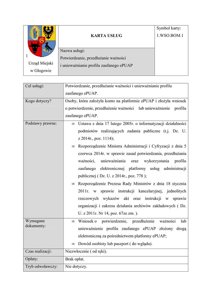 Symbol karty: 1.WSO.BOM.1 KARTA USŁUG Nazwa usługi: 1 Potwierdzanie, przedłużanie ważności Urząd Miejski i unieważnianie profilu zaufanego ePUAP w Głogowie Cel usługi: Potwierdzanie, przedłużanie ważności i unieważnianie profilu zaufanego ePUAP. Kogo dotyczy? Osoby, która założyła konto na platformie ePUAP i złożyła wniosek o potwierdzenie, przedłużenie ważności lub unieważnienie profilu zaufanego ePUAP. Podstawy prawne: • Ustawa z dnia 17 lutego 2005r. o informatyzacji działalności podmiotów realizujących zadania publiczne (t.j. Dz. U. z 2014r., poz. 1114); • Rozporządzenie Ministra Administracji i Cyfryzacji z dnia 5 czerwca 2014r. w sprawie zasad potwierdzania, przedłużania ważności, unieważniania zaufanego elektronicznej oraz wykorzystania platformy usług profilu administracji publicznej ( Dz. U. z 2014r., poz. 778 ); • Rozporządzenie Prezesa Rady Ministrów z dnia 18 stycznia 2011r. w sprawie instrukcji kancelaryjnej, jednolitych rzeczowych wykazów akt oraz instrukcji w sprawie organizacji i zakresu działania archiwów zakładowych ( Dz. U. z 2011r. Nr 14, poz. 67ze zm. ). Wymagane dokumenty: • Wniosek o potwierdzenie, przedłużenie ważności lub unieważnienie profilu zaufanego ePUAP złożony drogą elektroniczną za pośrednictwem platformy ePUAP; • Dowód osobisty lub paszport ( do wglądu). Czas realizacji: Niezwłocznie ( od ręki). Opłaty: Brak opłat. Tryb odwoławczy: Nie dotyczy. Rezultat realizacji usługi: Etapy realizacji usługi: Potwierdzenie, przedłużenie ważności lub unieważnienie profilu zaufanego ePUAP. • Stwierdzenie tożsamości osoby na podstawie dowodu osobistego lub paszportu, • wyszukiwanie wniosku na platformie ePUAP, • weryfikacja danych we wniosku z ww dokumentem tożsamości, • wydrukowanie wniosku o potwierdzenie profilu zaufanego ePUAP z platformy ePUAP i podpisanie go przez osobę wnioskującą, • potwierdzenie, przedłużenie ważności lub unieważnienie profilu zaufanego ePUAP. Gdzie załatwię sprawę? Urząd Miejski w Głogowie, ul. Rynek 10, Biuro Obsługi Mieszkańca pokój nr 18 (parter). Wszelkich informacji w ww sprawie udzielą pracownicy Biura Obsługi Mieszkańca pod nr telefonów: • inspektor Małgorzata Hak – (76) 7265 504, • inspektor Mariola Wojciechowska – (76) 7265 501, • podinspektor Anna Jaśkowiec-Heleniak – (76) 7265 502, • pomoc administracyjna Ewa Smorawińska – (76) 7265 563, Więcej informacji udzieli: Dodatkowe informacje: • Teresa Długosz – Naczelnik Wydziału – (76) 7265 520, • Alina Patoła – Kierownik Biura – (76) 7265 503 • Osoba wnioskująca zobowiązana jest do osobistego zgłoszenia się w ciągu 14 dni od daty złożenia wniosku do wybranego przez siebie punktu potwierdzającego w celu potwierdzenia profilu zaufanego ePUAP; jeżeli osoba wnioskująca nie zgłosi się w ww terminie wniosek uważa się za bezskuteczny. • Nie można dokonać potwierdzenia profilu zaufanego ePUAP w przypadku przedłożenia nieważnego dowodu osobistego lub paszportu, niezgodności danych podanych we wniosku. • W przypadku zgodności tożsamości i odręcznym podpisaniu przez tą osobę wniosku w postaci papierowej następuje potwierdzenie, przedłużenie ważności lub unieważnienie profilu zaufanego ePUAP. • Profil zaufany ePUAP potwierdza się na okres 3 lat. • Ważność profilu zaufanego ePUAP może być przedłużana na okres kolejnych 3 lat; można przedłużyć ważność swojego profilu samodzielnie na platformie ePUAP jeżeli posiada się podpis elektroniczny (certyfikat kwalifikowany) lub ważny profil zaufany, albo dokonać przedłużenia w wybranym punkcie potwierdzającym. • Profil zaufany ePUAP traci ważność w przypadku: - wystąpienia osoby posiadającej taki profil z pisemnym wnioskiem o unieważnienie profilu zaufanego ePUAP, - upływu okresu, na jaki został potwierdzony lub przedłużony, Załączniki: Brak. Data ostatniej modyfikacji: Autor: __________ Alina Patoła usunięcia konta użytkownika.