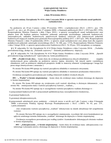 ZARZĄDZENIE NR 53/14 Wójta Gminy Działdowo z dnia 30 kwietnia 2014 r. w sprawie zmiany Zarządzenia Nr 4/14 z dnia 2 stycznia 2014r w sprawie wprowadzenia zasad (polityki) rachunkowości. Na podstawie art. 10 ust. 2 ustawy z dnia 29 września 1994 r. o rachunkowości (Dz.U. z 2013 r. poz. 330, poz.613 ze. zm.), art. 40 ustawy z dnia 27 sierpnia 2009r. o finansach publicznych (Dz.U z 2013 poz.885 i 938), Rozporządzenia Ministra Finansów z dnia 5 lipca 2010 r. w sprawie szczególnych zasad rachunkowości oraz planów kont dla budżetu państwa, budżetów jednostek samorządu terytorialnego, jednostek budżetowych, samorządowych, zakładów budżetowych, państwowych funduszy celowych oraz państwowych jednostek budżetowych mających siedzibę poza granicami Rzeczypospolitej polskiej (D.U. z 2013 poz. 289), Rozporządzenia Ministra Finansów z dnia 25 października 2010 r. w sprawie zasad rachunkowości oraz planu kont dla organów podatkowych jednostek samorządu terytorialnego (Dz.U. Nr 208, poz. 1375), Rozporządzenia Ministra Finansów z dnia 3 lutego 2010r. w sprawie sprawozdawczości budżetowej (Dz.U. Nr 20 poz. 103) zarządzam, co następuje: § 1. W załączniku Nr 1do Zarządzenia Nr 4/14 Wójta Gminy Działdowo z dnia 2 stycznia 2014r. „Technika prowadzenia ksiąg„ dodaje się „Dziennik częściowy” - dziennik pozabilansowy -depozyty. § 2. W załączniku Nr 3 do Zarządzenia Nr 4/14 Wójta Gminy Działdowo z dnia 2 stycznia 2014r. „Sposób prowadzenia ksiąg rachunkowych” wprowadza się konta pozabilansowe: 090 – „Środki trwałe obce„ – konto służy do ewidencji pozabilansowej obcych składników majątku użytkowanych przez jednostkę na podstawie umowy najmu, dzierżawy lub innych umów o podobnym charakterze, jeśli na podstawie odrębnych przepisów środki te stanowią własność wynajmującego i mogą być przez niego amortyzowane ( umarzane ). Po stronie Wn konta 090 ujmuje się wartość początkowa składnika w momencie otrzymania. Po stronie Ma konta 090 ujmuje się wartość początkowa składnika w momencie przekazania właścicielowi. Ewidencja szczegółowa prowadzona jest według właścicieli środków trwałych obcych. 092 – „ Wadia” w formie niepieniężnej - konto służy do ewidencji stanu wadium złożonego do depozytu w formie niepieniężnej . Po stronie Wn konta 092 ujmuje się zwiększenia czyli wartość określoną w złożonym dokumencie , a na stronie Ma – zmniejszenia stanu i wartości początkowej wartości „ wadium „ Na stronie Wn konta 092 ujmuje się w szczególności wartości początkowe wadium złożonego w : 1) poręczeniach bankowych lub w poręczeniach spółdzielczej kasy oszczędnościowo kredytowej , 2) gwarancji bankowych, 3) gwarancji ubezpieczeniowych, 4) poręczeniach udzielanych przez podmioty , o których mowa w art.6b ust.5 pkt 2 ustawy z dnia 9 listopada 2000r o utworzeniu Polskiej Agencji Rozwoju Przedsiębiorczości ( Dz.U. z 2007r. Nr 42, poz. 275 , z późn.zmianami) oraz zwiększenia wartości początkowej „wadium” dokonywane na skutek aktualizacji lub uzupełnienia wartości. Po stronie Ma kota 092 ujmuje się w szczególności zmniejszenie, wycofanie lub zwrot kontrahentowi po upływie ustalonego terminu dokumentu „wadium” złożonego do depozytu w formie niepieniężnej. Ewidencja szczegółowa prowadzona jest według tytułów i kontrahentów dokonujących złożenia wadium w formie niepieniężnej. 093 – „Zabezpieczenia „ w formie niepieniężnej - konto służy do ewidencji stanu zabezpieczenia z tyt. należytego wykonania umowy złożonego do depozytu w formie niepieniężnej . Id: 6C38F596-C144-438C-B49F-18583C12CEAB. Uchwalony Strona 1 Po stronie Wn konta 093 ujmuje się zwiększenia czyli wartość określoną w złożonym dokumencie , a na stronie Ma – zmniejszenia stanu i wartości początkowej wartości „ zabezpieczenia „ Na stronie Wn konta 093 ujmuje się w szczególności wartości początkowe zabezpieczenia złożonego w : 5) poręczeniach bankowych lub w poręczeniach spółdzielczej kasy oszczędnościowo kredytowej , 6) gwarancji bankowych, 7) gwarancji ubezpieczeniowych, 8) poręczeniach udzielanych przez podmioty , o których mowa w art.6b ust.5 pkt 2 ustawy z dnia 9 listopada 2000r o utworzeniu Polskiej Agencji Rozwoju Przedsiębiorczości ( Dz.U. z 2007r. Nr 42, poz. 275 , z późn.zmianami) oraz zwiększenia wartości początkowej „zabezpieczenia” dokonywane na skutek aktualizacji lub uzupełnienia wartości. Po stronie Ma kota 093 ujmuje się w szczególności zmniejszenie, wycofanie lub zwrot kontrahentowi po upływie ustalonego terminu dokumentu „zabezpieczenia” złożonego do depozytu w formie niepieniężnej. Do konta 093 prowadzona jest ewidencja analityczna z podziałem na złożenia zabezpieczeń w formie niepieniężnej kontrahentów dokonujących 094 – „ Grunty w użytkowaniu wieczystym osób trzecich „ – konto służy do ewidencji stanu oraz zwiększeń i zmniejszeń wartości początkowej środków trwałych (gruntów ) oddanych w użytkowanie wieczyste osobom trzecim na podstawie aktu notarialnego . Na stronie Wn konta 094 ujmuje się zwiększenia a w szczególności wartość początkowa środków trwałych ( gruntów ) oddanych w użytkowanie wieczyste. Na stronie Ma konta 094 ujmuje się zmniejszenia stanu i wartości początkowej środków trwałych ( gruntów ) które zostały zwrócone po zakończeniu umowy. Do konta 094 prowadzona jest ewidencja analityczna z podziałem na grunty oddane w użytkowanie wieczyste osobom trzecim. § 3. Zarządzenie wchodzi w życie z dniem podpisania. Id: 6C38F596-C144-438C-B49F-18583C12CEAB. Uchwalony Strona 2