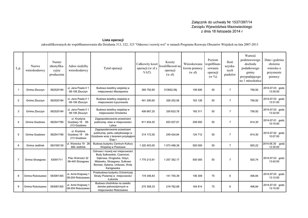 Załącznik do uchwały Nr 1537/397/14 Zarządu Wjewództwa Mazowieckiego z dnia 18 listopada 2014 r Lista operacji zakwalifikowanych do współfinansowania dla Działania 313, 322, 323 "Odnowa i rozwój wsi" w ramach Programu Rozwoju Obszarów Wiejskch na lata 2007-2013 dla naboru od 18 czerca do 03 lipca w 2014 roku Poziom Koszty Całkowity koszt Wnioskowana współfinankwalifikowal-ne operacji (w zł z kwota pomocy sowania operacji VAT) (w zł) operacji (w zł) (w %) L.p. Nazwa wnioskodawcy Numer identyfikacyjny producenta 1 Gmina Zbuczyn 062520184 ul. Jana Pawła II 1 08-106 Zbuczyn Budowa świetlicy wiejskiej w miejscowości Maciejowice 385 792,65 2 Gmina Zbuczyn 062520184 ul. Jana Pawła II 1 08-106 Zbuczyn Budowa świetlicy wiejskiej w miejscowości Łęcznowola 401 290,65 3 Gmina Zbuczyn 062520184 ul. Jana Pawła II 1 08-106 Zbuczyn Budowa świetlicy wiejskiej w miejscowości Smolanka 4 Gmina Gozdowo 062541780 ul. Krystyna Gozdawy 19 09213 Gozdowo Zagospodarowanie przestrzeni publicznej- staw w miejscowości Lelice 5 Gmina Gozdowo 062541780 Zagospodarowanie przestrzeni ul. Krystyna publicznej- parku zabytkowego w Gozdawy 19 09Gozdowie wraz z terenem przyległym213 Gozdowo Etap I 6 Gmina Jedlińsk 063180130 Adres siedziby wnioskodawcy Tytuł operacji Ilość uzyskanych punktów Wartość podstawowego dochodu podatkowego gminy przypadającego na 1 mieszkańca Data i godzina złożenia wniosku o przyznenie pomocy 156 826 50 7 756,92 2014.07.03 godz. 13:30:00 326 252,56 163 126 50 7 756,92 2014.07.03 godz. 13:31:00 406 667,25 330 623,78 165 311 50 7 756,92 2014.07.03 godz. 13:32:00 811 834,20 653 027,81 258 650 50 7 814,30 2014.07.01 godz. 10:15:00 314 172,55 249 424,84 124 712 50 7 814,30 2014.07.02 godz. 10:07:00 ul. Warecka 19 26- Budowa budynku Centrum Kultury 660 Jedlińsk Wiejskiej w Piastowie 1 320 403,00 1 073 498,38 500 000 50 7 925,22 2014.06.30 godz. 12:35:00 1 775 213,91 1 257 352,17 500 000 50 7 925,74 2014.07.03 godz. 13:42:00 313652,56j 7 Gmina Strzegowo 63091711 Plac Wolności 32 06-445 Strzegowo Odnowa i rozwój wsi miejscowości Budy Sułkowskie, Czarnocin, Dąbrowa, Drogiszka, Giżyn, Mdzewko, Strzegowo, Sułkowo Borowe, Syberia, Unikowo, Wola Kanigowska 8 Gmina Rościszewo 063081355 ul. Armii Krajowej 1 09-204 Rościszewo Przebudowa budynku Ochotniczej Straży Pożarnej w miejscowości Łukomie 174 346,83 141 745,39 106 309 75 6 406,84 2014.07.03 godz. 13:12:00 9 Gmina Rościszewo 063081355 ul. Armii Krajowej 1 09-204 Rościszewo Budowa chodników na osiedlu domów jednorodzinnych w miejscowości Rościszewo 270 308,33 219 762,88 164 814 75 6 406,84 2014.07.03 godz. 13:15:00 10 Gmina Krasnosielc 062546453 ul. Rynek 40 06212 Krasnosielc Kształtowanie obszarów o szczególnym znaczeniu poprzez budowę nowej linii oświetleniowej i modernizację istniejącej w Gminie Krasnosielc 11 Gmina Krasnosielc 062546453 ul. Rynek 40 06212 Krasnosielc Zagospodarowanie terenu w centrum Wólki Drążdżewskiej poprzez budowę placu rekreacyjnego 148 466,29 115 168,64 86 376 75 6 493,43 2014.06.30 godz. 10:36:00 12 Gmina Długosiodło 062543476 ul. T. Kościuszki 2 Przebudowa chodnika w 07-210 Długosiodło miejscowości Przetycz Włościańska 102 621,05 76 436,00 57 327 75 6 524,51 2014.07.03 godz. 13:08:00 13 Gmina Długosiodło 062541476 ul. T. Kościuszki 2 07-210 Długosiodło Remont i modernizacja budynku świetlicy wiejskiej w miejscowości Olszaki 283 556,84 205 751,17 154 313 75 6 524,51 2014.07.03 godz. 13:09:00 14 Gmina Długosiodło 062541476 ul. T. Kościuszki 2 07-210 Długosiodło Przebudowa chodnika w miejscowości Chrzczanka Włościańska 78 514,59 63 833,00 47 874 75 6 524,51 2014.07.03 godz. 13:10:00 15 Gmina Długosiodło 062541476 ul. T. Kościuszki 2 07-210 Długosiodło Przebudowa chodnika w miejscowości Kornaciska 159 520,49 117 246,94 87 935 75 6 524,51 2014.07.03 godz. 13:11:00 16 Gmina Długosiodło 062541476 ul. T. Kościuszki 2 07-210 Długosiodło Przebudowa chodnika w miejscowości Sieczychy 206 722,90 168 067,40 126 050 75 6 524,51 2014.07.03 godz. 13:12:00 17 Gmina Długosiodło 062541476 ul. T. Kościuszki 2 07-210 Długosiodło Zagospodarowanie przestrzeni publicznej w miejscowości Stare Bosewo 165 103,76 133 632,86 100 224 75 6 524,51 2014.07.03 godz. 13:13:00 Zagospodarowanie przestrzeni publicznej oraz zakup wyposażenia świetlicy wiejskiej w miejscowości Jaszczułty 336 680,43 256 681,99 192 511 75 6 524,51 2014.07.03 godz. 13:15:00 518 153,88 411 100,72 308 325 75 6 493,43 2014.06.30 godz. 10:35:00 18 Gmina Długosiodło 062541476 ul. T. Kościuszki 2 07-210 Długosiodło 19 Gmina Długosiodło 062541476 ul. T. Kościuszki 2 07-210 Długosiodło Rozbudowa z przebudową budynku Domu Kultury w miejscowości Długosiodło 367 602,30 256 020,31 171 101 75 6 524,51 2014.07.03 godz. 13:16:00 20 Gmina Baranowo 062542314 ul. Plac Trzydziestolecia 7 06-320 Baranowo Zagospodarowanie centrum wsi Jastrząbka, Dąbrowa i Kopaczyska 494 115,63 399 589,55 299 691 75 6 557,37 2014.06.30 godz. 13:15:00 21 Gmina Lubowidz 062151500 ul. Zielona 10 09304 Lubowidz Wyposażenie świetlic wiejskich w miejscowości Osówka, Wronka, Jasiony, Cieszki, Rynowo 99 401,22 80 814,03 60 610 75 6 597,45 2014.07.03 godz. 08:30:00 22 Gmina Andrzejewo 063236105 ul. Warszawska 36 07-305 Andrzejewo Remont świetlicy wiejskiej w Starej Ruskołęce 363 154,24 295 247,35 221 435 75 6 640,28 2014.07.03 godz. 13:42:00 23 Gmina Andrzejewo 063236105 ul. Warszawska 36 07-305 Andrzejewo Remont świetlicy wiejskiej w Andrzejewie 172 114,85 108 573,23 81 429 75 6 640,28 2014.07.03 godz. 13:43:00 24 Gmina Czerwińsk nad Wisłą 062793293 ul. Wł. Jagiełły 16 09-150 Czerwińsk nad Wisłą Budowa boiska sportowego z elementami towarzyszącymi w Sielcu, gmina Czerwińsk nad Wisłą 25 Gmina BogutyPianki 062517480 ul. Aleja Papieża Jana Pawła II 45 07-325 BogutyPianki 26 Parafia Rzymskokatolicka pw. św. Bartłomieja w Brzózie 063818962 27 Gmina Chorzele 062605741 28 Gmina Staroźreby