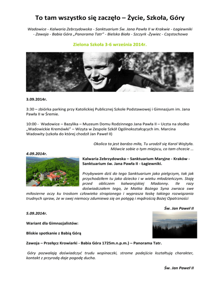 To tam wszystko się zaczęło – Życie, Szkoła, Góry Wadowice - Kalwaria Zebrzydowska - Sanktuarium Św. Jana Pawła II w Krakwie - Łagiewniki - Zawoja - Babia Góra „Panorama Tatr” - Bielsko Biała - Szczyrk -Żywiec - Częstochowa Zielona Szkoła 3-6 września 2014r. 3.09.2014r. 3:30 – zbiórka parking przy Katolickiej Publicznej Szkole Podstawowej i Gimnazjum im. Jana Pawła II w Śremie. 10:00 - Wadowice – Bazylika – Muzeum Domu Rodzinnego Jana Pawła II – Uczta na słodko „Wadowickie Kremówki” – Wizyta w Zespole Szkół Ogólnokształcących im. Marcina Wadowity (szkoła do której chodził Jan Paweł II) Okolica ta jest bardzo miła, Tu urodził się Karol Wojtyła. Mówcie sobie o tym miejscu, co tam chcecie … 4.09.2014r. Kalwaria Zebrzydowska – Sanktuarium Maryjne - Kraków Sanktuarium św. Jana Pawła II - Łagiewniki. Przybywam dziś do tego Sanktuarium jako pielgrzym, tak jak przychodziłem tu jako dziecko i w wieku młodzieńczym. Staję przed obliczem kalwaryjskiej Madonny. Ile razy doświadczałem tego, że Matka Bożego Syna zwraca swe miłosierne oczy ku troskom człowieka strapionego i wyprasza łaskę takiego rozwiązania trudnych spraw, że w swej niemocy zdumiewa się on potęgą i mądrością Bożej Opatrzności Św. Jan Paweł II 5.09.2014r. Wariant dla Gimnazjalistów: Bliskie spotkanie z Babią Górą Zawoja – Przełęcz Krowiarki - Babia Góra 1725m.n.p.m.) – Panorama Tatr. Góry pozwalają doświadczyć trudu wspinaczki, strome podejścia kształtują charakter, kontakt z przyrodą daje pogodę ducha. Św. Jan Paweł II Wariant dla Uczniów klas IV SP: Bielsko Biała - Szczyrk - Skrzyczne - Żywiec ( Jezioro Żywieckie) Wizyta dwu godzinna w Studio Filmów Rysunkowych w Bielsku-Białej. Wyjazd do Szczyrku i pobyt w mieście. Możliwość wjazdu na Skrzyczne 1257m.n.p.m. (panorama na Tatry, Babią Górę, Pilsko, Beskid Makowski, Śląski) Wjazd jest płatny osobno !!! u opiekunów ok. 30 zł (dwie strony - cena na 2014r) 6.09.2014r. Wadowice – Częstochowa – Śrem Na pielgrzymich szlakach Jana Pawła II nie mogło zabraknąć - jak sam mówił - domu Królowej Polski, Sanktuarium Narodu, w którym bije jego serce - Jasnej Góry. Nazywał ją największym polskim konfesjonałem, świętą górą Boga, najbardziej newralgicznym punktem duszpasterstwa dla całej ziemi polskiej. Św. Jan Paweł II W cenie: zakwaterowanie wyżywienie transport wstępy do muzeów - Wadowice, Bielsko Biała, opłata za wejście do Babiogórskiego Parku Narodowego przewodnik beskidzki opieka pilota,: 390zł* *W cenę nie obejmuje wjazd i zjazd na Skrzyczne