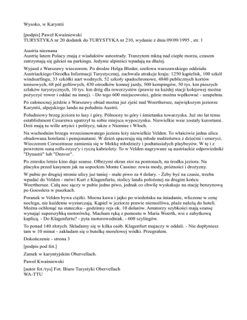 Wysoko, w Karyntii [podpis] Paweł Kwaśniewski TURYSTYKA nr 20 dodatek do TURYSTYKA nr 210, wydanie z dnia 09/09/1995 , str. 1 Austria nieznana Austrię latem Polacy znają z wiaduktów autostrady. Tranzytem mkną nad ciepłe morza, czasem zatrzymają się gdzieś na parkingu. Jedynie alpiniści wpadają na dłużej. Wyjazd z Warszawy wieczorem. Po drodze Helga Bloder, szefowa warszawskiego oddziału Austriackiego Ośrodka Informacji Turystycznej, zachwala atrakcje kraju: 1250 kąpielisk, 100 szkół windsurfingu, 33 szkółki nart wodnych, 52 szkoły spadochronowe, 4840 publicznych kortów tenisowych, 68 pól golfowych, 430 ośrodków konnej jazdy, 500 kempingów, 50 tys. km pieszych szlaków turystycznych, 10 tys. km dróg dla rowerzystów (prawie na każdej stacji kolejowej można pożyczyć rower i oddać na innej). - Do tego 600 miejscowości, gdzie można wędkować - uzupełnia. Po całonocnej jeździe z Warszawy obiad można już zjeść nad Woerthersee, największym jeziorze Karyntii, alpejskiego landu na południu Austrii. Południowy brzeg jeziora to lasy i góry. Północny to góry i śmietanka towarzyska. Już sto lat temu establishment Cesarstwa upatrzył tu sobie miejsca wypoczynku. Niewielkie wsie zostały kurortami. Dziś mają tu wille artyści i politycy, także z Niemiec i Włoch. Na wschodnim brzegu wrzecionowatego jeziora leży niewielkie Velden. To właściwie jedna ulica obudowana hotelami i pensjonatami. W dzień spacerują nią młode małżeństwa z dziećmi i emeryci. Wieczorem Corsostrasse zamienia się w Mekkę młodzieży i podtatusiałych playboyów. W tę i z powrotem suną rolls-royce'y i ryczą kabriolety. To w Velden nagrywane są austriackie odpowiedniki "Dynastii" lub "Denver". Po zmroku letnie kino daje seanse. Olbrzymi ekran stoi na pontonach, na środku jeziora. Na placyku przed kasynem jak na sopockim Monte Cassino: rewia mody, próżności i drożyzny. W pubie po drugiej stronie ulicy już taniej - małe piwo za 4 dolary. - Żeby być na czasie, trzeba wpadać do Velden - mówi Kurt z Klagenfurtu, stolicy landu położonej na drugim końcu Woerthersee. Całą noc sączy w pubie jedno piwo, jednak co chwilę wyskakuje na stację benzynową po Goesslera w puszkach. Poranek w Velden bywa ciężki. Mocna kawa i jajko po wiedeńsku na śniadanie, wliczone w cenę noclegu, nie każdemu wystarczają. Kąpiel w jeziorze prawie niemożliwa, plaże należą do hoteli. Można ochłonąć na stateczku - godzinny rejs ok. 10 dolarów. Amatorzy szybkości mają szansę wynająć superszybką motorówkę. Macham ręką z pomostu w Maria Woerth, wsi z zabytkową kaplicą. - Do Klagenfurtu? - pyta motorowodniak. - 600 szylingów. To ponad 140 złotych. Składamy się w kilka osób. Klagenfurt majaczy w oddali. - Nie dopłyniesz tam w 10 minut - zakładam się o butelkę morelowej wódki. Przegrałem. Dokończenie - strona 3 [podpis pod fot.] Zamek w karyntyjskim Obervellach. Paweł Kwaśniewski [autor fot./rys] Fot. Biuro Turystyki Obervellach WA-TTU