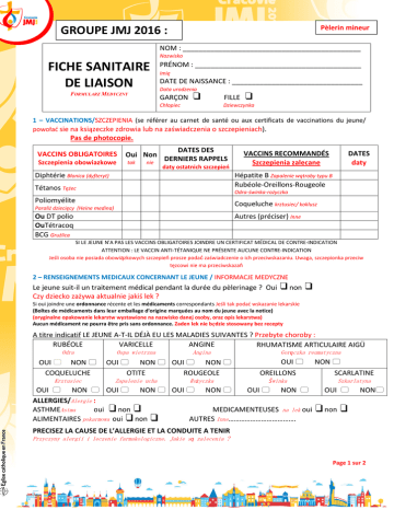 Pèlerin mineur GROUPE JMJ 2016 : NOM : _____________________________________________ Nazwisko FICHE SANITAIRE DE LIAISON FORMULARZ MEDYCZNY PRÉNOM : __________________________________________ Imię DATE DE NAISSANCE : _________________________________ Data urodzenia GARÇON FILLE Chłopiec Dziewczynka 1 – VACCINATIONS/SZCZEPIENIA (se référer au carnet de santé ou aux certificats de vaccinations du jeune/ powołać sie na ksiązeczke zdrowia lub na zaświadczenia o szczepieniach). Pas de photocopie. VACCINS OBLIGATOIRES Szczepienia obowiazkowe Oui Non tak nie DATES DES DERNIERS RAPPELS daty ostatnich szczepień Diphtérie Błonica (dyfteryt) VACCINS RECOMMANDÉS Szczepienia zalecane Tétanos Tężec Hépatite B Zapalenie wątroby typu B Rubéole-Oreillons-Rougeole Poliomyélite Coqueluche krztusiec/ koklusz DATES daty Odra-świnka-rożyczka Paraliż dziecięcy (Heine medina) Ou DT polio OuTétracoq BCG Gruźlica Autres (préciser) Inne SI LE JEUNE N'A PAS LES VACCINS OBLIGATOIRES JOINDRE UN CERTIFICAT MÉDICAL DE CONTRE-INDICATION ATTENTION : LE VACCIN ANTI-TÉTANIQUE NE PRÉSENTE AUCUNE CONTRE-INDICATION Jeśli osoba nie posiada obowiązkowych szczepień prosze podać zaświadczenie o ich przeciwskazaniu. Uwaga, szczepionka przeciw tęzcowi nie ma przeciwskazań 2 – RENSEIGNEMENTS MEDICAUX CONCERNANT LE JEUNE / INFORMACJE MEDYCZNE Le jeune suit-il un traitement médical pendant la durée du pèlerinage ? Oui Czy dziecko zażywa aktualnie jakiś lek ? non Si oui joindre une ordonnance récente et les médicaments correspondants Jeśli tak podać wskazanie lekarskie (Boîtes de médicaments dans leur emballage d’origine marquées au nom du jeune avec la notice) (oryginalne opakowanie lekarstw wystawione na nazwisko danej osoby, oraz opis lekarstwa) Aucun médicament ne pourra être pris sans ordonnance. Zaden lek nie będzie stosowany bez recepty A titre indicatif LE JEUNE A-T-IL DÉJÀ EU LES MALADIES SUIVANTES ? Przebyte choroby : RUBÉOLE VARICELLE ANGINE RHUMATISME ARTICULAIRE AIGÜ Odra OUI NON COQUELUCHE Krztusiec Ospa wietrzna OUI NON OTITE OUI OUI NON ROUGEOLE Rożyczka Zapalenie ucha OUI NON OUI NON ALLERGIES/Alergie : ASTHMEAstma oui non ALIMENTAIRES pokarmowa oui non Gorączka reumatyczna Angina OUI NON OUI NON OREILLONS SCARLATINE Świnka Szkarlatyna NON MEDICAMENTEUSES na lek oui AUTRES Inne………………………………. OUI NON non PRECISEZ LA CAUSE DE L’ALLERGIE ET LA CONDUITE A TENIR Przyczyny alergii i leczenie farmakologiczne. Jakie są zalecenia ? Page 1 sur 2 P.A.I (projet d’accueil individualisé) en cours podać stan aktualnego leczenia ? oui non (joindre le protocole et toutes informations utiles) (podać wszystkie niezbędne informacje) ………………………………………………………………………………………………………………………………………………………………………………… …………………………………………………………………………………………………………………………………………………………… INDIQUEZ LES DIFFICULTÉS DE SANTÉ (MALADIE, ACCIDENT, CRISES CONVULSIVES, HOSPITALISATION, OPÉRATION, RÉÉDUCATION) EN PRÉCISANT LES PRÉCAUTIONS À PRENDRE. Prosze wskazać problemy zdrowotne (choroba, wypadek, drgawki, hospitalizacja, chirurgia, rehabilitacja) określając środki ostrożności. ………………………………………………………………………………………………………………………………………………………………………………… …………………………………………………………………………………………………………………………………………………………… 3 – INFORMATIONS COMPLEMENTAIRES Dodatkowe informacje obowiazkowe (à renseigner obligatoirement.) LE JEUNE PORTE-T-IL DES LENTILLES : oui non Czy dziecko nosi soczewki kontaktowe DES PROTHÈSES AUDITIVES Aparat słuchowy,: oui DES LUNETTES Okulary: oui non au besoin prévoir un étui au nom du jeune non au besoin prévoir un étui au nom du jeune DES PROTHÈSES ou APPAREIL DENTAIRE Protezy stomatologiczne: oui non au besoin prévoir un étui au nom du jeune AUTRES RECOMMANDATIONS inne zalecenia/ PRÉCISEZ prosze sprecyzować (ex : qualité de peau, crème solaire) (rodzaj skóry, krem słoneczny) ………………………………………………………………………………………………………………………………… 4- AUTORISATIONS ZEZWOLENIA J’autorise mon enfant à participer aux activités physiques et sportives : oui non Upoważniam moje dziecko do uprawiania sportu J’autorise mon enfant à participer aux baignades surveillées : oui non Upoważniam moje dziecko do udziału w kapieliskach strzezonych J’autorise son transport en véhicule de service et car de location : oui non Upoważniam moje dziecko do przewóz pojazdem słuzbowym oraz wynajetym samochodem 5 -RESPONSABLE DU JEUNE osoba odpowiedzialna za dziecko NOM Nazwisko..................................................................... PRÉNOM Imie..................................................................... TÉL JOIGNABLE PENDANT TOUTE LA DUREE DU PELERINAGE : ............................................. Telefon kontaktowy w trakcie całej pielgrzymki NOM ET TÉL. DU MÉDECIN TRAITANT (FACULTATIF) numer telefonu lekarza prowadzącego (nieobowiązkowo) ........................................................................................................... Je soussigné(e), .................................................................................................................responsable légal du jeune, déclare exacts les renseignements portés sur cette fiche et autorise le responsable à prendre, le cas échéant, toutes mesures (traitement médical, hospitalisation, intervention chirurgicale) rendues nécessaires par l'état du jeune, ceci suivant