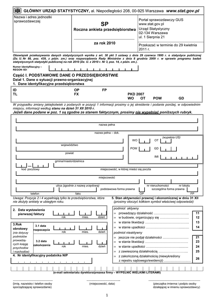 GŁÓWNY URZĄD STATYSTYCZNY, al. Niepodległości 208, 00-925 Warszawa www.stat.gov.pl Nazwa i adres jednostki sprawozdawczej Portal sprawozdawczy GUS www.stat.gov.pl Roczna ankieta przedsiębiorstwa Urząd Statystyczny 02-134 Warszawa ul. 1 Sierpnia 21 SP za rok 2010 Przekazać w terminie do 29 kwietnia 2011 r. Obowiązek przekazywania danych statystycznych wynika z art. 30 pkt 3 ustawy z dnia 29 czerwca 1995 r. o statystyce publicznej (Dz. U. Nr 88, poz. 439, z późn. zm.) oraz rozporządzenia Rady Ministrów z dnia 8 grudnia 2009 r. w sprawie programu badań statystycznych statystyki publicznej na rok 2010 (Dz. U. z 2010 r. Nr 3, poz. 14, z późn. zm.). Numer identyfikacyjny – REGON (ID) Część I. PODSTAWOWE DANE O PRZEDSIĘBIORSTWIE Dział 1. Dane o sytuacji prawno-organizacyjnej 1. Dane identyfikacyjne przedsiębiorstwa ID TL OP FX FP PKD 2007 WO OT POW GD W przypadku zmiany jakiejkolwiek z podanych w pozycji 1 informacji prosimy o jej skreślenie i podanie poniŜej, w odpowiednim miejscu, informacji według stanu na dzień 31 XII 2010 r. JeŜeli dane podane w poz. 1 są zgodne ze stanem faktycznym, prosimy nie wypełniać poniŜszych rubryk. nazwa pełna nazwa pełna – dok. (wypełnia US) WO OT POW GD województwo powiat IMI gmina/miasto/dzielnica − kod pocztowy miejscowość, w której mieści się poczta miejscowość ulica (zgodnie z nazwą urzędową) nr nieruchomości nr lokalu szczególna forma prawna podstawowa forma prawna telefon faks OP Uwaga: Pozycje 2 i 4 wypełniają tylko te przedsiębiorstwa, które nie złoŜyły ankiety w ubiegłym roku. podmiot aktywny 2. Data wystawienia pierwszej faktury 3.Rok obrotowy 3.1 data rozpoczęcia (nie dotyczy podmiotów prowadzących księgę przychodów i rozchodów) 3.2 data zakończenia rok mies. dzień ›› prowadzący działalność …………………………... ›› w budowie, organizujący się ……………………… ›› w stanie likwidacji ………………………………….. 11 12 13 ›› w stanie upadłości …………………………............ 14 rok mies. dzień podmiot nieaktywny rok mies. dzień 4. Nr identyfikacyjny podatnika NIP . . . . . FP 5. Stan aktywności prawnej i ekonomicznej w dniu 31 XII (prosimy otoczyć kółkiem symbol właściwej odpowiedzi) . . . . . . . ›› jeszcze nie podjął działalności …………………… ›› w stanie likwidacji …………………………………. 21 23 ›› w stanie upadłości …………………………........... ›› z zawieszoną działalnością …………………….... 24 25 ›› z zakończoną działalnością (niewykreślony z rejestru sądowego/ewidencji) ………………….… 26 (e-mail sekretariatu dyrektora/prezesa firmy – WYPEŁNIĆ WIELKIMI LITERAMI) ………………………………. (imię, nazwisko i telefon osoby ……...………………….. (miejscowość, data) sporządzającej sprawozdanie) 1 ………………………………………… (pieczątka imienna i podpis osoby działającej w imieniu sprawozdawcy) Numer identyfikacyjny – REGON (ID) 6. Czy przedsiębiorstwo posiada oddziały, zakłady lub udziały w podmiotach poza terytorium Rzeczypospolitej Polskiej? 1. tak 2. nie 7. Informacje o sposobie powstania lub zmianach w przedsiębiorstwie (KZ) Nie nastąpiło Ŝadne z wymienionych niŜej zdarzeń 01 – 10 (zakreślić obok symbol 00) Symbol zdarzenia Data mies. 00 Prosimy wpisać symbole zdarzeń, które nastąpiły w ciągu roku kalendarzowego, oraz ich daty. dzień Przedsiębiorstwo powstało ›› 01 – jako nowe ›› 02 – w wyniku całkowitego przejęcia innego przedsiębiorstwa ›› 03 – z wydzielenia z innego przedsiębiorstwa ›› 04 – z podziału innego przedsiębiorstwa ›› 05 – z połączenia przedsiębiorstw ›› 06 – z połączenia części przedsiębiorstw Zmiany w przedsiębiorstwie ›› 07 – z przedsiębiorstwa wydzielono nowe przedsiębiorstwa ›› 08 – wchłonęło inne przedsiębiorstwa ›› 09 – wchłonęło części innych przedsiębiorstw ›› 10 – zmiana formy prawnej 8. JeŜeli w pozycji 7 wpisano jedno lub więcej zdarzeń o symbolu 02 – 09, to po zapoznaniu się z odpowiednią częścią objaśnień naleŜy opisać poniŜej dane o przedsiębiorstwie lub przedsiębiorstwach. mies. symbol zdarzenia dzień data zdarzenia Numer identyfikacyjny − REGON pełna nazwa pełna nazwa (cd.) WO województwo POW powiat GD gmina/miasto/dzielnica mies. symbol zdarzenia dzień data zdarzenia Numer identyfikacyjny − REGON pełna nazwa pełna nazwa (cd.) WO województwo POW powiat GD gmina/miasto/dzielnica 2 Numer identyfikacyjny – REGON (ID) Dział 2. Rodzaje działalności przedsiębiorstwa Lp. Opis rodzaju działalności (produkcji, wykonywanych robót, świadczonych usług, działalności handlowej) według PKD Symbol klasy według PKD (wypełnia US) 0 1 2 OGÓŁEM PRZEDSIĘBIORSTWO (wartość ogółem w rubryce 3 równa jest sumie wartości podanych w wierszach: 02 + 06 + (05−70) dział 2 część II; dla podmiotów prowadzących księgi przychodów i rozchodów wartości podanej w wierszu 01 dział 2 część II) 3 Przychody ze sprzedaŜy produktów, towarów i materiałów (bez podatku VAT) w tys. zł (bez znaku po przecinku) 3 Numer identyfikacyjny – REGON (ID) Dział 2. Rodzaje działalności przedsiębiorstwa – cd. Lp. Opis rodzaju działalności (produkcji, wykonywanych robót, świadczonych usług, działalności handlowej) według PKD Symbol klasy według PKD (wypełnia US) 0 1 2 OGÓŁEM PRZEDSIĘBIORSTWO (wartość ogółem w rubryce 3 równa jest sumie wartości podanych w wierszach: 02 + 06 + (05−70) dział 2 część II; dla podmiotów prowadzących księgi przychodów i rozchodów wartości podanej w wierszu 01 dział 2 część II) 4 Przychody ze sprzedaŜy produktów, towarów i materiałów (bez podatku VAT) w tys. zł (bez znaku po przecinku) 3 Część II. BILANS I RACHUNEK ZYSKÓW