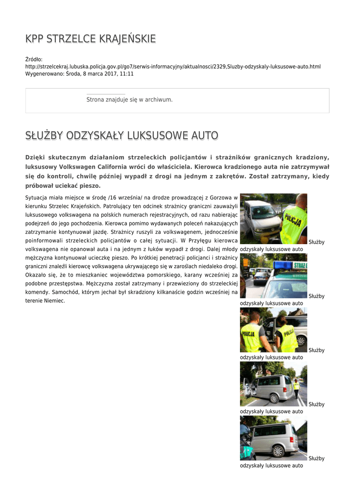 KPP STRZELCE KRAJEŃSKIE Źródło: http://strzelcekraj.lubuska.policja.gov.pl/go7/serwis-informacyjny/aktualnosci/2329,Sluzby-odzyskaly-luksusowe-auto.html Wygenerowano: Środa, 8 marca 2017, 11:11 Strona znajduje się w archiwum. SŁUŻBY ODZYSKAŁY LUKSUSOWE AUTO Dzięki skutecznym działaniom strzeleckich policjantów i strażników granicznych kradziony, luksusowy Volkswagen California wróci do właściciela. Kierowca kradzionego auta nie zatrzymywał się do kontroli, chwilę później wypadł z drogi na jednym z zakrętów. Został zatrzymany, kiedy próbował uciekać pieszo. Sytuacja miała miejsce w środę /16 września/ na drodze prowadzącej z Gorzowa w kierunku Strzelec Krajeńskich. Patrolujący ten odcinek strażnicy graniczni zauważyli luksusowego volkswagena na polskich numerach rejestracyjnych, od razu nabierając podejrzeń do jego pochodzenia. Kierowca pomimo wydawanych poleceń nakazujących zatrzymanie kontynuował jazdę. Strażnicy ruszyli za volkswagenem, jednocześnie poinformowali strzeleckich policjantów o całej sytuacji. W Przyłęgu kierowca Służby volkswagena nie opanował auta i na jednym z łuków wypadł z drogi. Dalej młody odzyskały luksusowe auto mężczyzna kontynuował ucieczkę pieszo. Po krótkiej penetracji policjanci i strażnicy graniczni znaleźli kierowcę volkswagena ukrywającego się w zaroślach niedaleko drogi. Okazało się, że to mieszkaniec województwa pomorskiego, karany wcześniej za podobne przestępstwa. Mężczyzna został zatrzymany i przewieziony do strzeleckiej komendy. Samochód, którym jechał był skradziony kilkanaście godzin wcześniej na terenie Niemiec. Służby odzyskały luksusowe auto Służby odzyskały luksusowe auto Służby odzyskały luksusowe auto Służby odzyskały luksusowe auto Służby odzyskały luksusowe auto Służby odzyskały luksusowe auto Służby odzyskały luksusowe auto Służby odzyskały luksusowe auto Służby odzyskały luksusowe auto Służby odzyskały luksusowe auto Ocena: 0/5 (0) Tweetnij