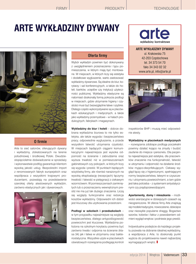 FIRMY PRODUKTY TECHNOLOGIE ARTE WYKŁADZINY DYWANY Oferta firmy Wybór wykładzin powinien być dokonywany z uwzględnieniem przeznaczenia i typu pomieszczenia, w którym mają być montowane. W miejscach, w których liczy się estetyka ARTE WYKŁADZINY DYWANY ul. Krakowska 75 42-203 Częstochowa tel. 34 373 54 70 faks 34 343 02 32 www.arte.pl, [email protected] i dodatkowe wygłuszenie, warto zastosować wykładziny dywanowe. Są idealne do biur, korytarzy i sal konferencyjnych, a także do hoteli, banków, urzędów czy instytucji użyteczności publicznej. Wykładziny elastyczne są natomiast doskonałą formą pokrycia podłogi w miejscach, gdzie utrzymanie higieny i czystości musi być bezwzględnie łatwe i szybkie. Dlatego często wykorzystywane są w placówkach edukacyjnych i medycznych, a także jako wykładziny przemysłowe – w halach produkcyjnych, fabrykach i magazynach. Wykładziny do biur i hoteli – dobrze do- inspektorów BHP i muszą mieć odpowied- brana wykładzina biurowa to nie tylko es- nie atesty. tetyka, ale także wygoda i bezpieczeństwo O firmie pracy, odpowiednie wygłuszenie, a przede wszystkim łatwość utrzymania czystości. – rozwiązania zdobiące podłogę poczekalni Arte to sieć salonów, oferujących dywany W miejscach będących ciągami komuni- powinny działać kojąco na zmysły i budzić i wykładziny, zlokalizowanych na terenie kacyjnymi najważniejsza jest wysoka od- zaufanie do miejsca i personelu. Dla pacjen- południowej i środkowej Polski. Dwudzie- porność na ścieranie i zabrudzenia oraz ta najważniejsza jest estetyka, dla pracowni- stopięcioletnie doświadczenie w sprzedaży wyższa trwałość niż w pomieszczeniach ków znaczenie ma funkcjonalność, łatwość i wykonawstwie podłóg gwarantuje klientom gabinetowych czy pokojach, w których liczy w utrzymaniu i odporność na działanie środ- wysoką jakość usług. Bezpośredni import się wygoda i prestiż. W punktach będących ków myjąco-dezynfekujących. Ciekawy wy- z renomowanych fabryk europejskich oraz wizytówką firmy, ale również narażonych na gląd łączy się z higienicznymi, spełniającymi współpraca z wszystkimi krajowymi pro- wysoką eksploatację (recepcjach) łączymy normy bezpieczeństwa, łatwymi w czyszcze- ducentami, pozwalają na przedstawienie trwałość i łatwość w pielęgnacji z ciekawym niu i utrzymaniu powierzchniami, a tam gdzie szerokiej oferty atestowanych wykładzin, wzornictwem. W pomieszczeniach zamknię- jest taka potrzeba – z systemami antystatycz- zarówno elastycznych jak i dywanowych. tych lub o przeznaczeniu wewnętrznym pre- nymi czy prądoprzewodzącymi. Wykładziny w placówkach medycznych stiż nie ma już tak dużego znaczenia. Liczą się względy funkcjonalne oraz redukcja Apartamenty, domy i mieszkania – możli- kosztów wykładziny. Odpowiedni ich dobór wości aranżacyjne w dzisiejszych czasach są jest kluczowy dla użytkowania przestrzeni. nieograniczone. W ofercie firmy Arte znajdują się modele tradycyjne, nowoczesne, dziecięce Podłogi w szkołach i przedszkolach – oraz niezwykle popularne shaggy. Bogactwo w tym przypadku najważniejsze są względy wzorów, kolorów i faktur z powodzeniem od- bezpieczeństwa, dlatego antypoślizgowość mieni wygląd wnętrza i podniesie jego prestiż. powierzchni jest kluczowa. Wykładzina położona na szkolnym korytarzu powinna być Indywidualne podejście do każdego projek- zarówno trwała i odporna na ścieranie (kla- tu pozwala na dobranie idealnej wykładziny, sa 34) jak i łatwa w utrzymaniu oraz bakte- a współpraca z Arte, to doskonały punkt riostatyczna. Wszystkie użyte w placówkach wyjścia do projektowania nawet najbardziej oświatowych rozwiązania podlegają kontroli wymagających wnętrz. edycja 2014 Wnętrza Vademecum 33