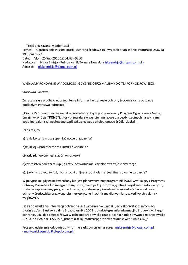 --- Treść przekazanej wiadomości --Temat: Ograniczenie Niskiej Emisji - ochrona środowiska - wniosek o udzielenie informacji Dz.U. Nr 199, poz.1227 Data: Mon, 26 Sep 2016 12:54:48 +0200 Nadawca: Niska Emisja - Pełnomocnik Tomasz Nowak <[email protected]> Adresat: [email protected] WYSYŁAMY PONOWNIE WIADOMOŚCI, GDYŻ NIE OTRZYMALIŚMY DO TEJ PORY ODPOWIEDZI. Szanowni Państwo, Zwracam się z prośbą o udostępnienie informacji w zakresie ochrony środowiska na obszarze podległym Państwa jednostce. _Czy na Państwa obszarze został wprowadzony, bądź jest planowany Program Ograniczenia Niskiej Emisji ( w skrócie *PONE*), który przewiduje wsparcie finansowe dla osób fizycznych na wymianę kotła lub paleniska węglowego bądź zakup nowego ekologicznego źródła ciepła? _ Jeżeli tak, to: a) jakie kryteria muszą spełniać nowe urządzenia? b)w jakiej wysokości można uzyskać wsparcie? c)kiedy planowany jest nabór wniosków? d)czy zainteresowani zakupują kotły indywidualnie, czy planowany jest przetarg? e)z jakich środków (wfoś, nfoś, środki unijne, środki własne) jest finansowanie wsparcie? W przypadku, gdy został wdrożony lub jest planowany inny program niż PONE wynikający z Programu Ochrony Powietrza lub innego proszę uprzejmie o pełną informację. Dzięki uzyskanym informacjom, zostanie zaplanowany program edukacyjny, podnoszący świadomość mieszkańców w zakresie ochrony środowiska oraz wsparcie merytoryczne i techniczne dla wymiany szkodliwych palenisk węglowych. Jeżeli do uzyskania informacji potrzebne jest wypełnienie wniosku, aby skorzystać z informacji zgodnie z /art.8 ustawy z dnia 3 października 2008 r. o udostępnianiu informacji o środowisku i jego ochronie, udziale społeczeństwa w ochronie środowiska oraz o ocenach oddziaływania na środowisko (Dz. U. Nr 199, poz.1227)/, *_proszę o taką informację oraz ewentualnie wzór wniosku._* Proszę o udzielenie odpowiedzi w formie elektronicznej na adres: [email protected] <mailto:[email protected]> Z poważaniem, */Tomasz Nowak Dyrektor/* Pełnomocnik ds. niskiej emisji M: +48 505 98 38 55 @ [email protected] <mailto:[email protected]> www.biopal.com.pl <http://www.biopal.com.pl/> www.biopal24.pl <http://www.biopal24.pl/> *Biuro i adres do korespondencji:* *BIOPAL Spółka z ograniczoną odpowiedzialnością sp.k.* Ul. Santocka 48-49 71-083 SZCZECIN tel. +4891 433 55 44 fax.+4891 431 00 65 *mobile +48 607 800 401* *BIOPAL Spółka z ograniczoną odpowiedzialnością sp.k.* Ul. 5 Lipca 30, 70-376 Szczecin, Polska KRS 0000476862, NIP 8522604681, REGON 321427046 *KONTO BANK BPH S.A. 08 1060 0076 0000 3380 0014 2636*